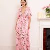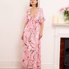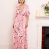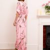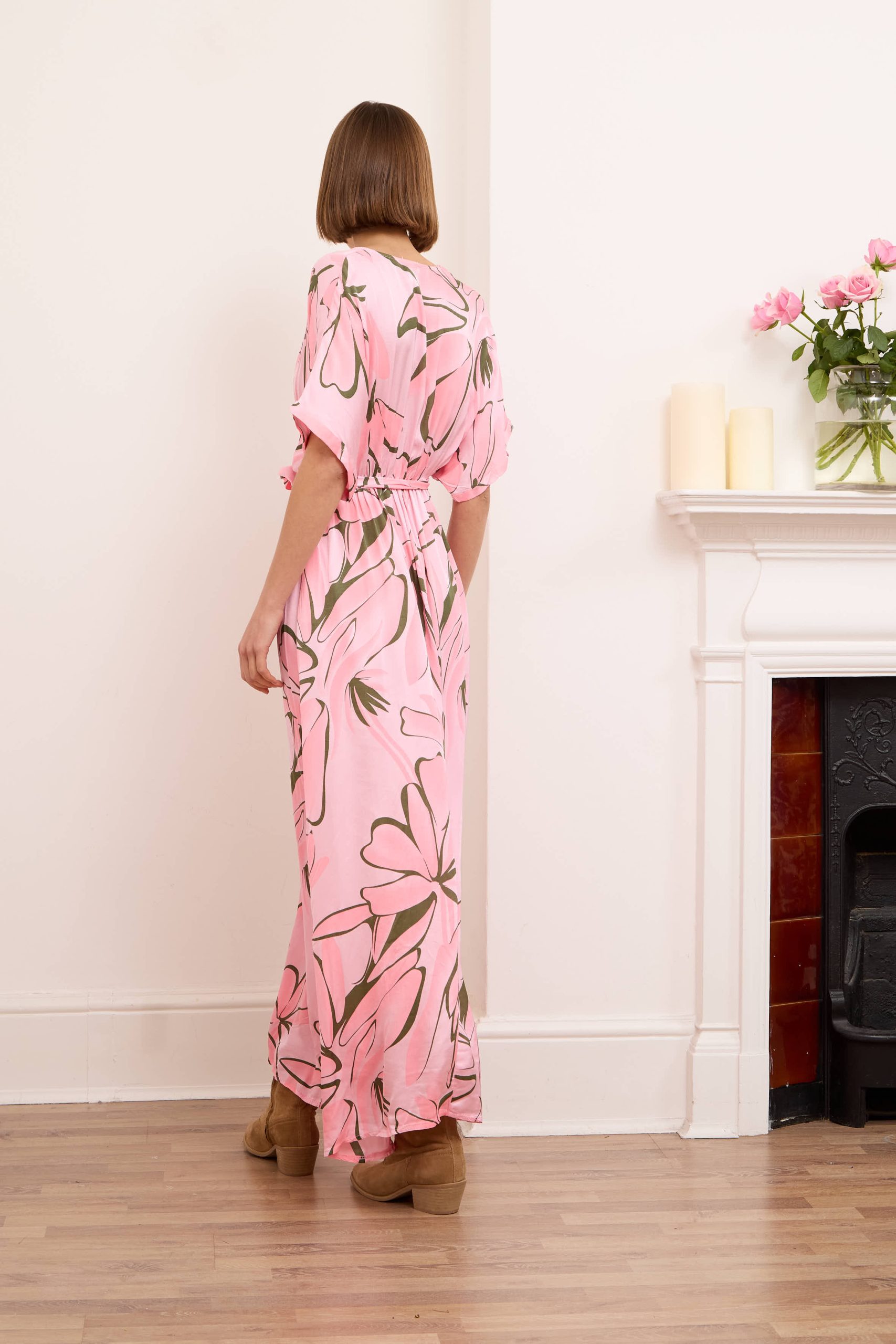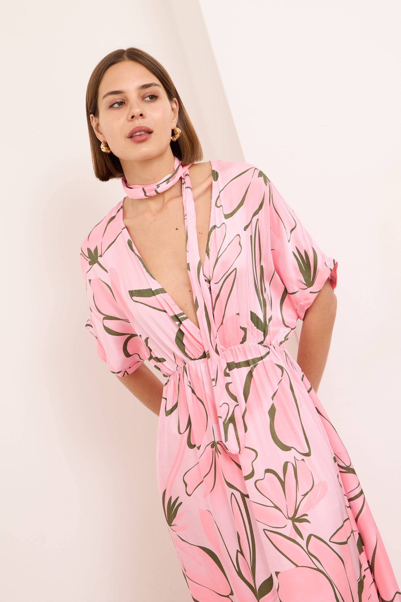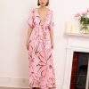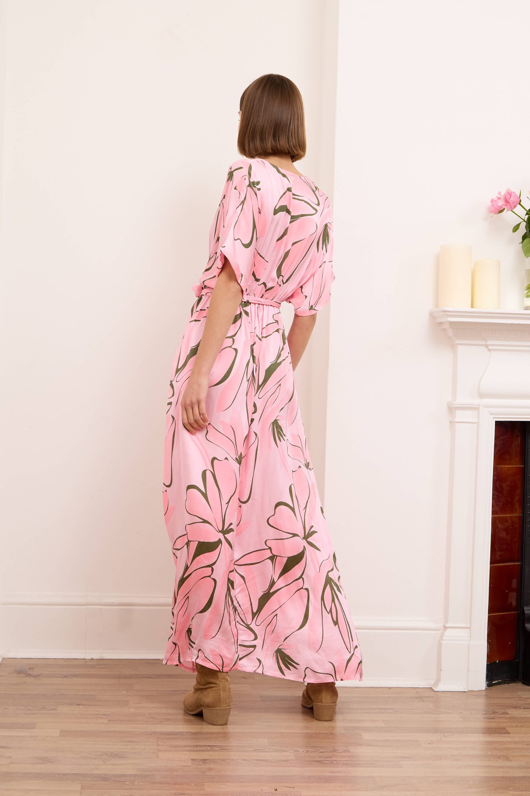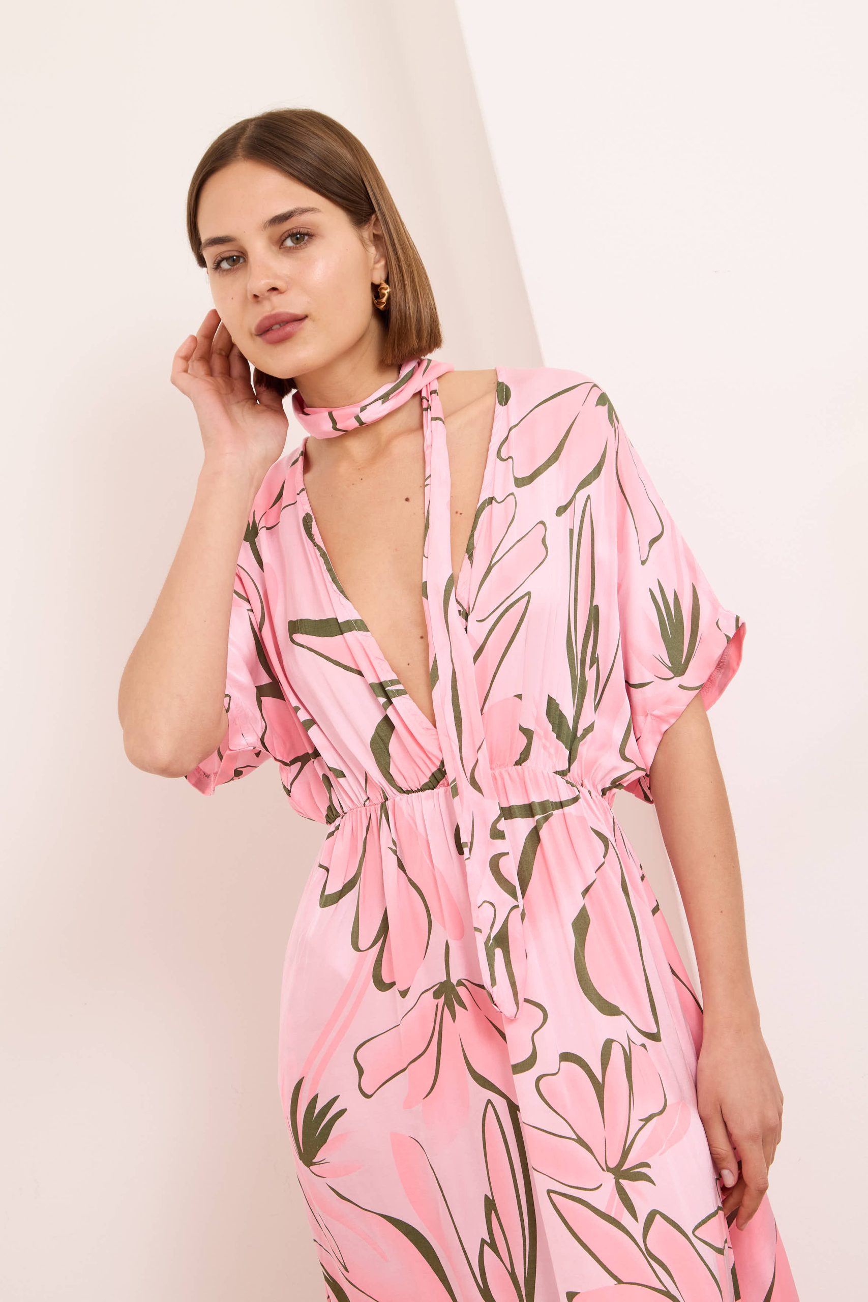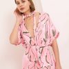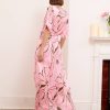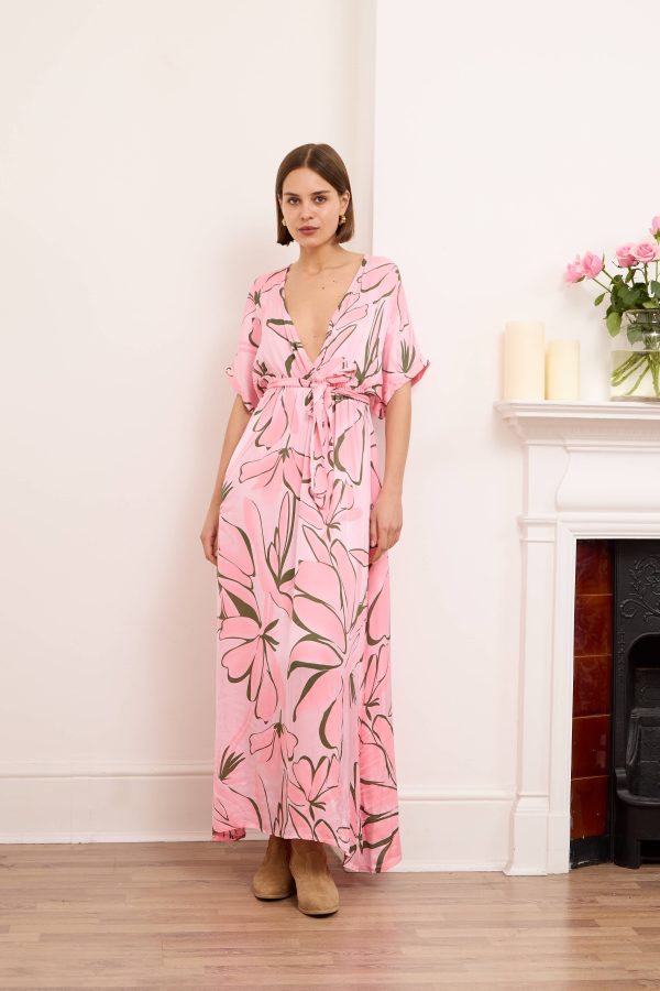 Alessia dress is both cool and elegant. It’s cut from fluid, lustrous silk satin that skims gently over your figure and it has a delicate  V-neckline . It’s printed with abstract artwork, featuring swirls of rich pink shades. Frame a glittering necklace with the plunging neckline. Strappy sandals will sit nicely beneath the flouncy hem.