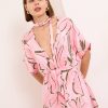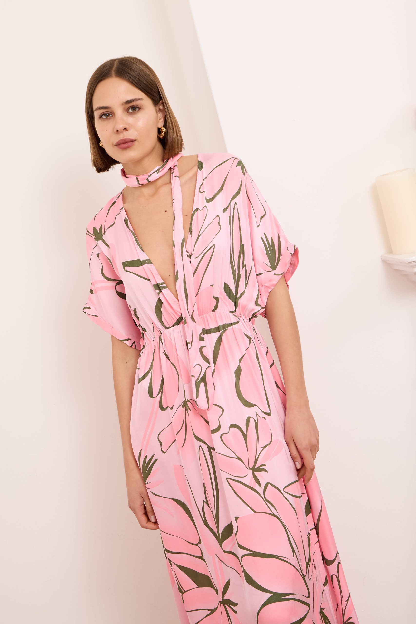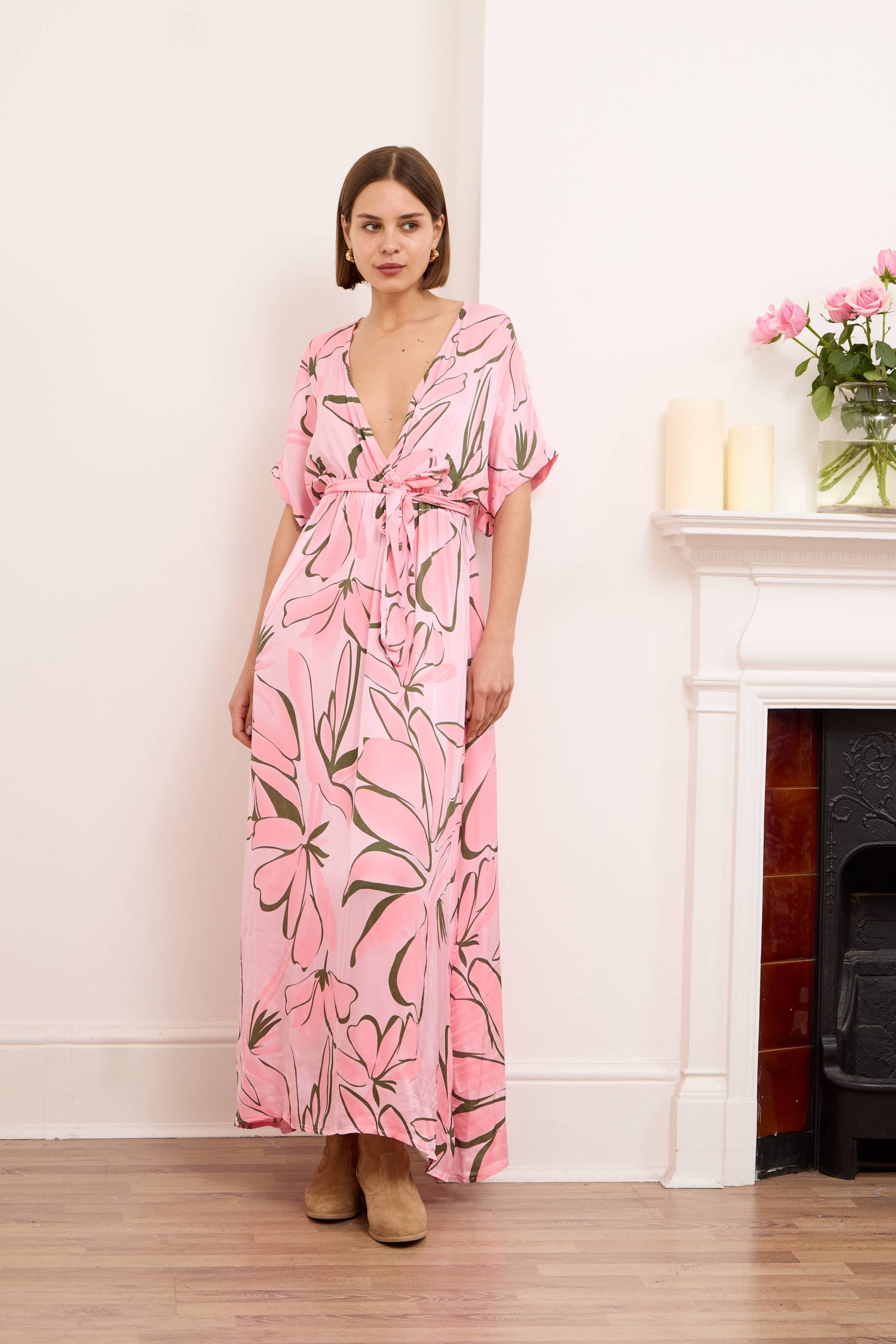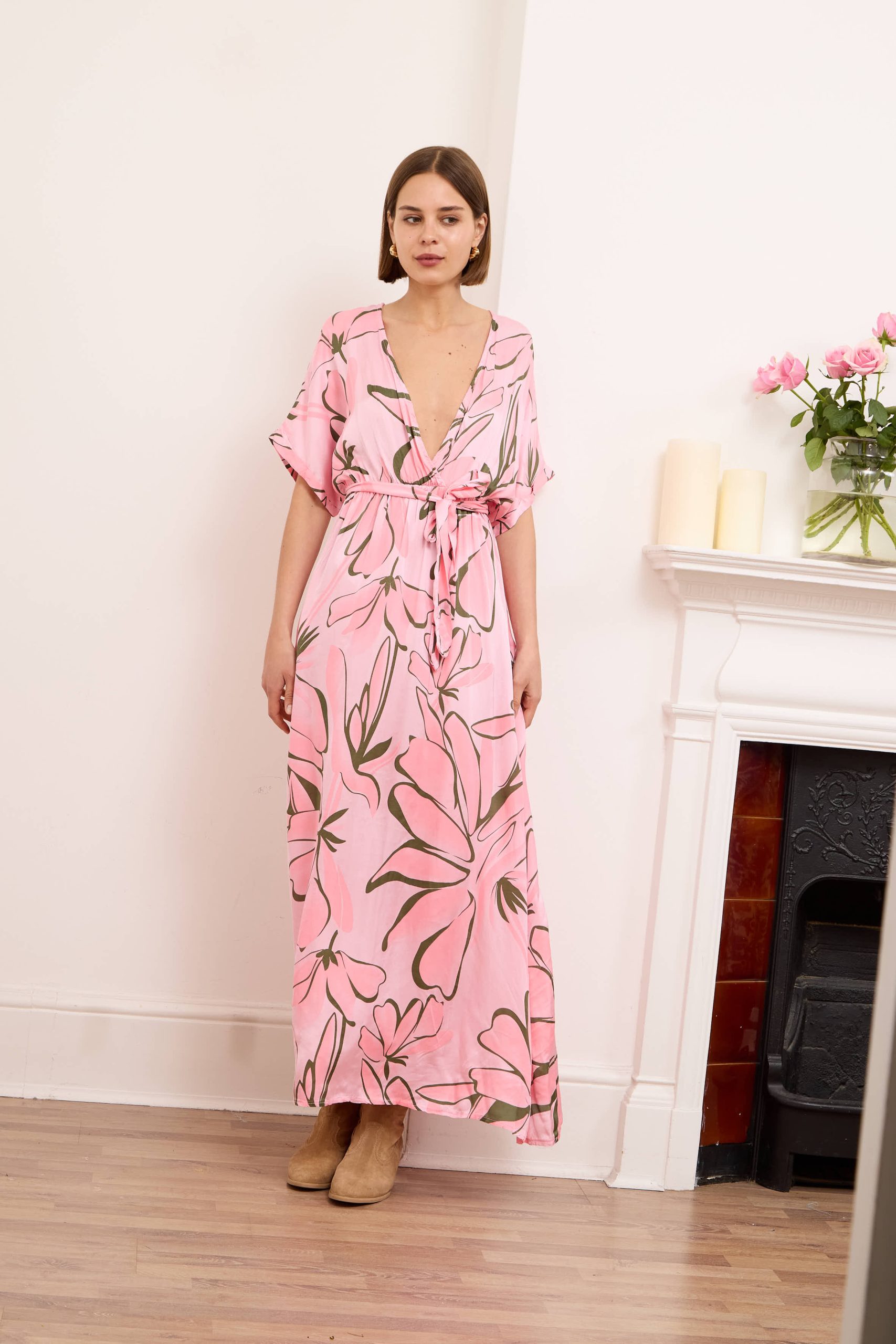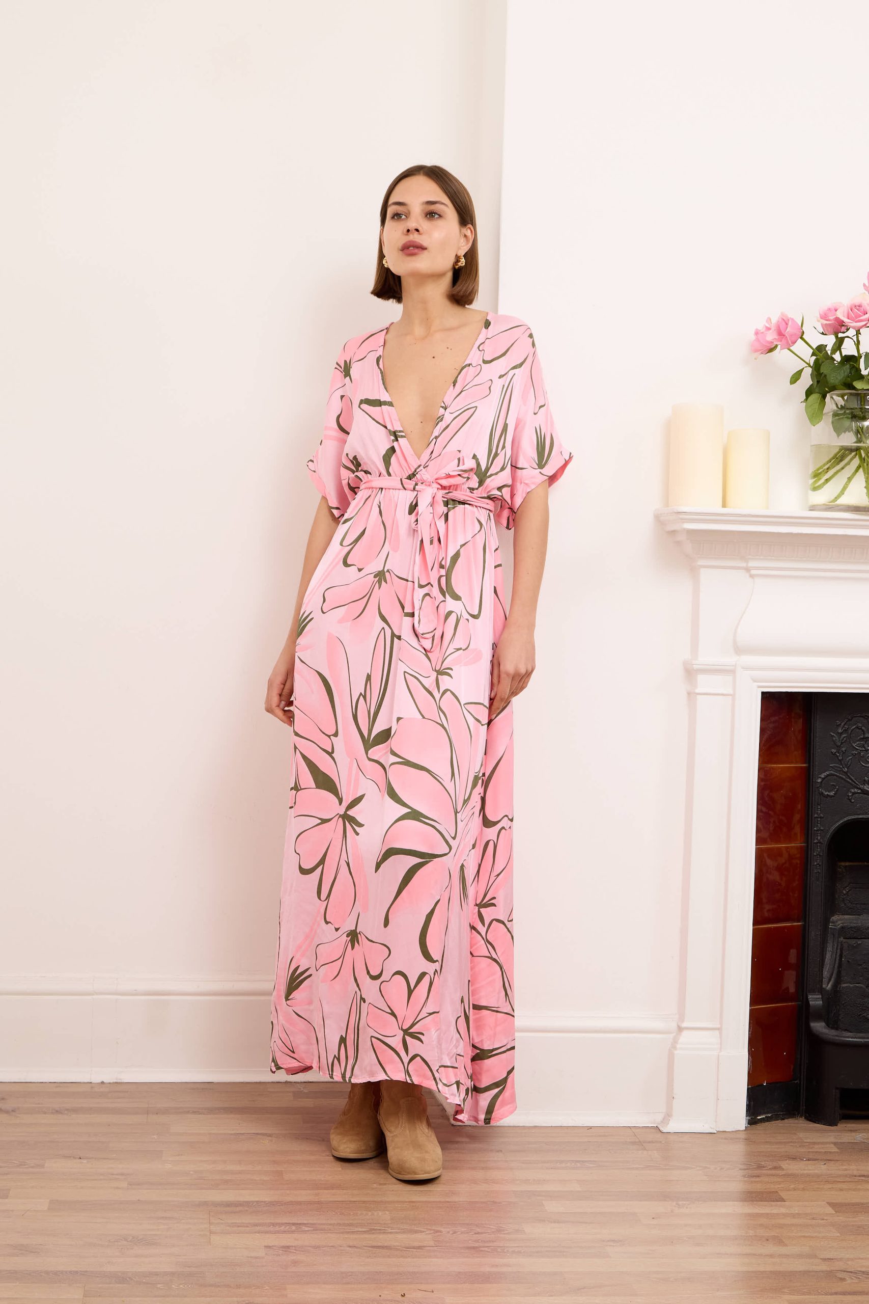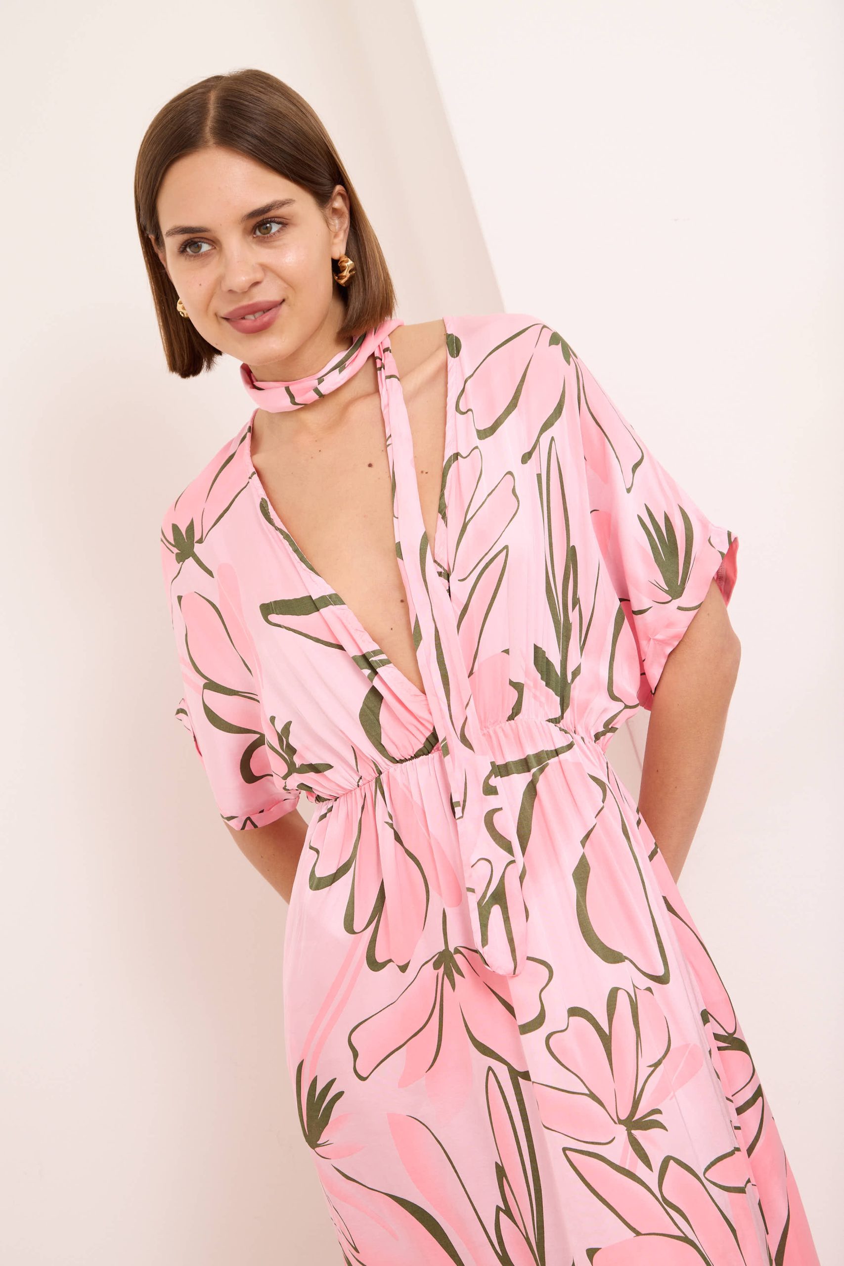 Alessia dress is both cool and elegant. It’s cut from fluid, lustrous silk satin that skims gently over your figure and it has a delicate  V-neckline . It’s printed with abstract artwork, featuring swirls of rich pink shades. Frame a glittering necklace with the plunging neckline. Strappy sandals will sit nicely beneath the flouncy hem.