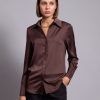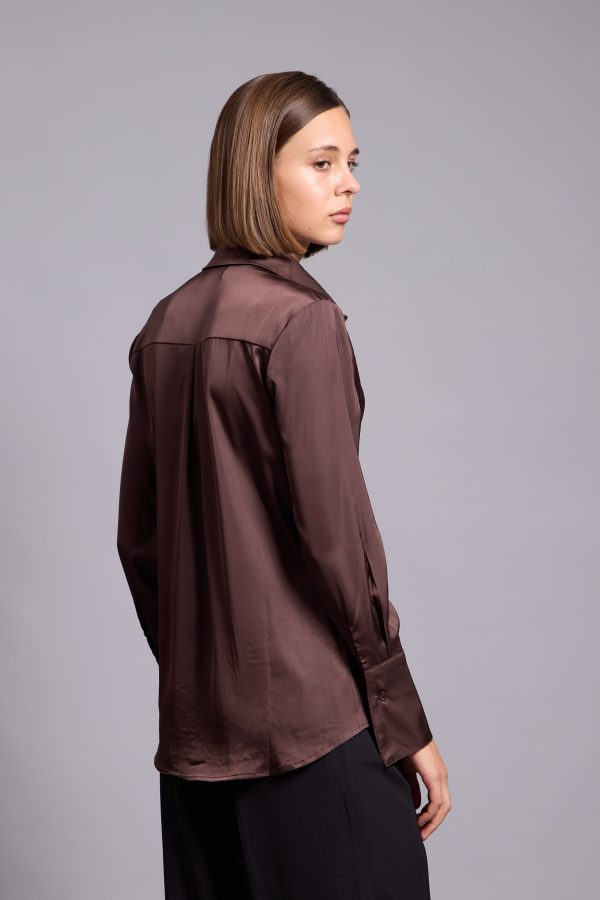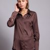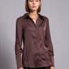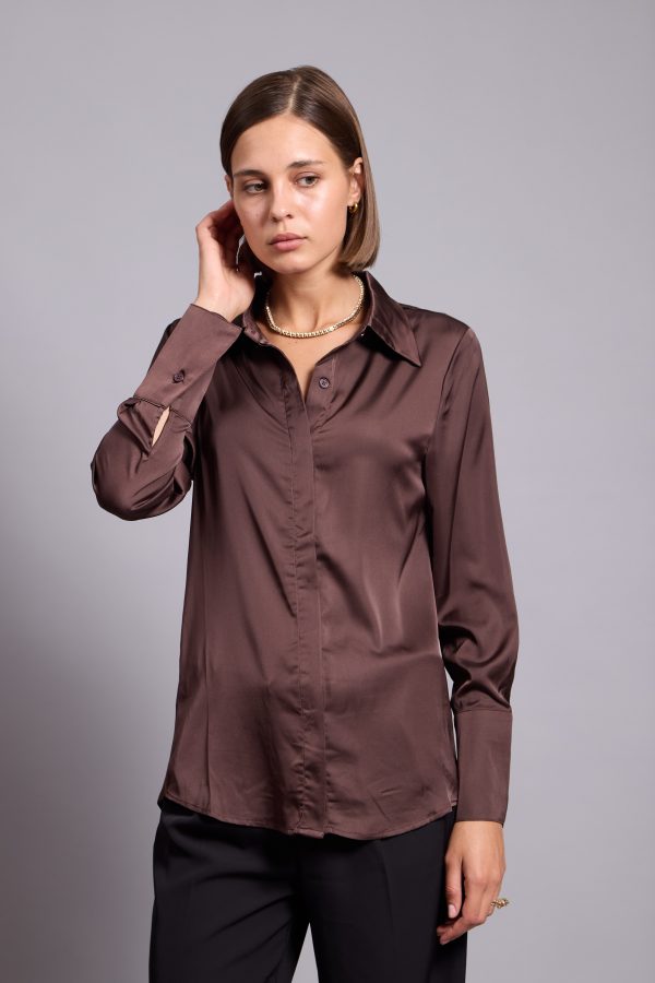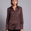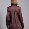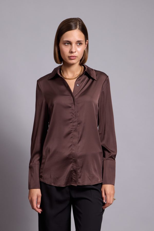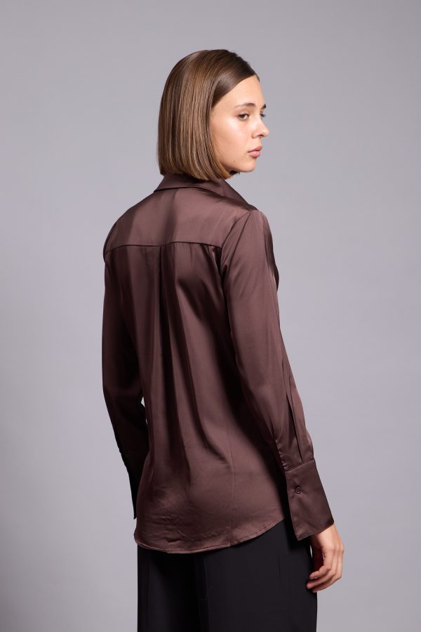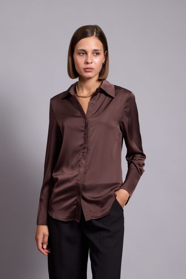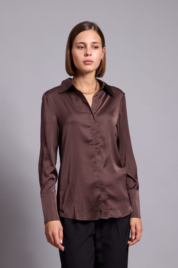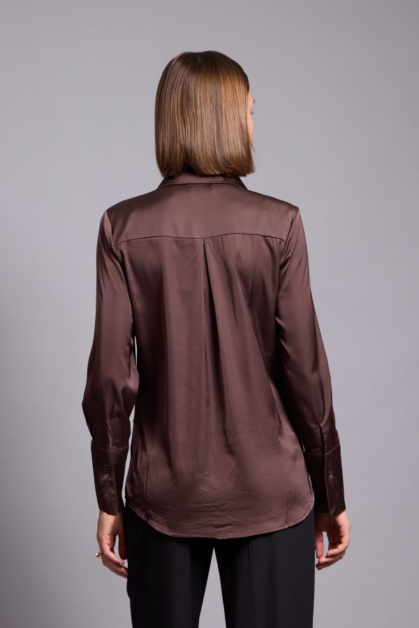 This shirt will go so far in your wardrobe – style yours half-tucked into jeans, silk pants cinched with a belt or layered under a knit vest. Cut from silky satin, it has a slim  shape with buttoned cuffs and a long, curved hem.