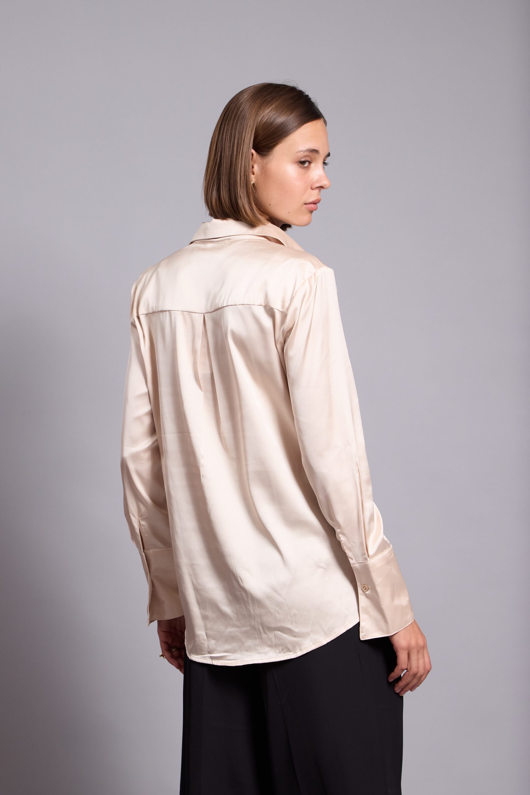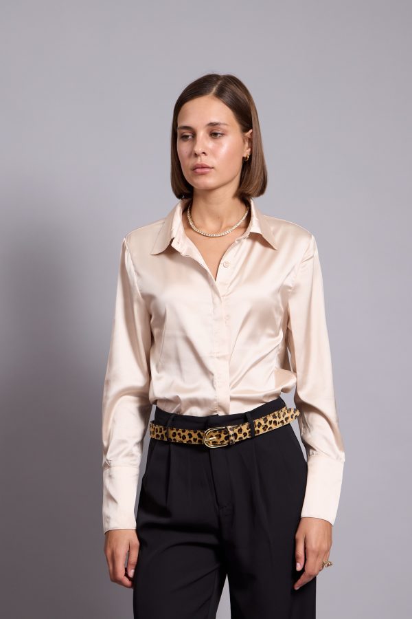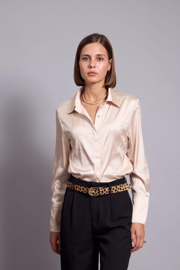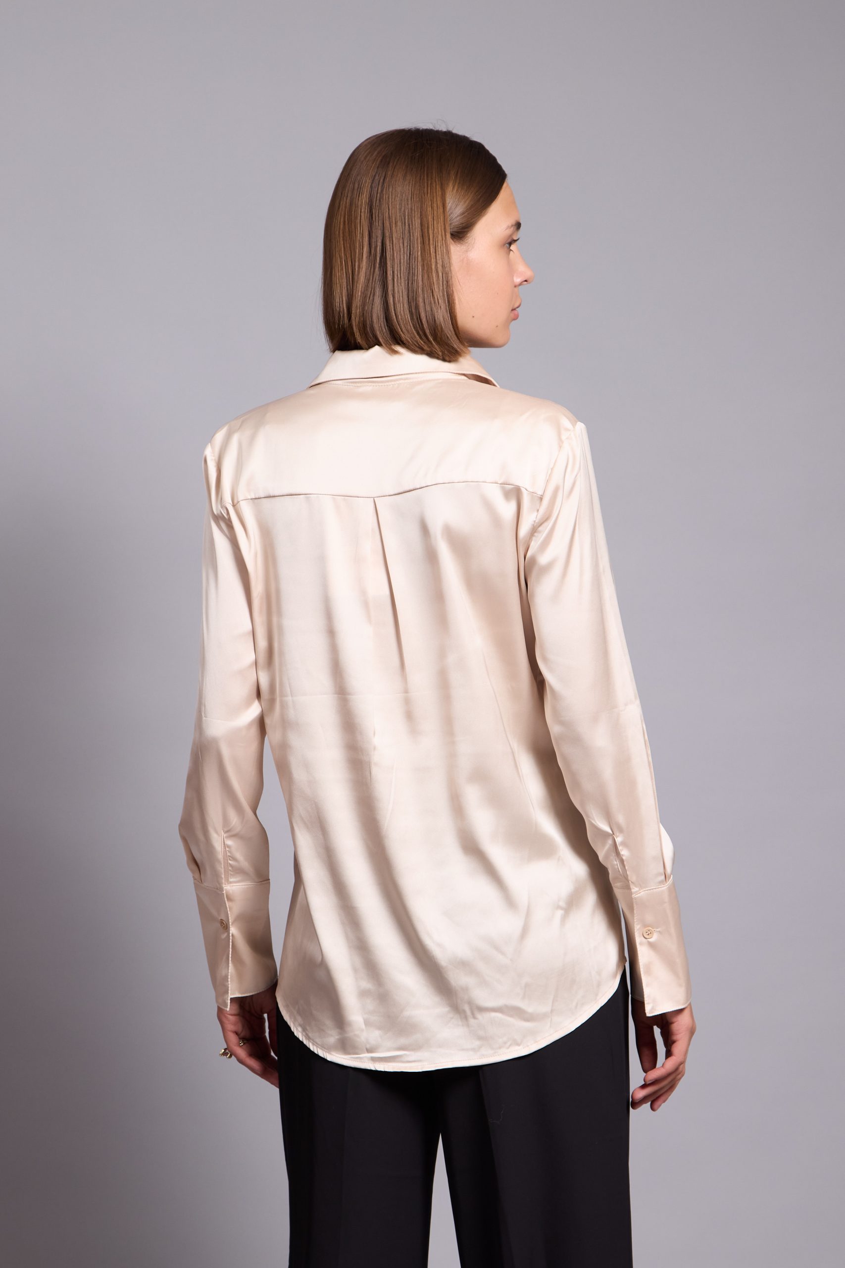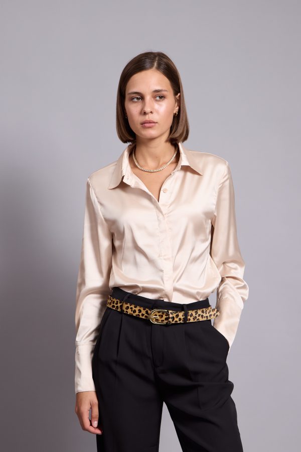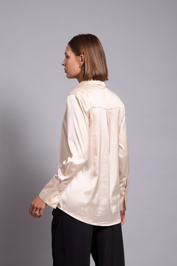 This shirt will go so far in your wardrobe – style yours half-tucked into jeans, silk pants cinched with a belt or layered under a knit vest. Cut from silky satin, it has a slim  shape with buttoned cuffs and a long, curved hem.