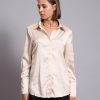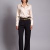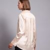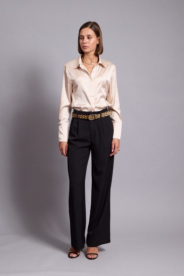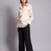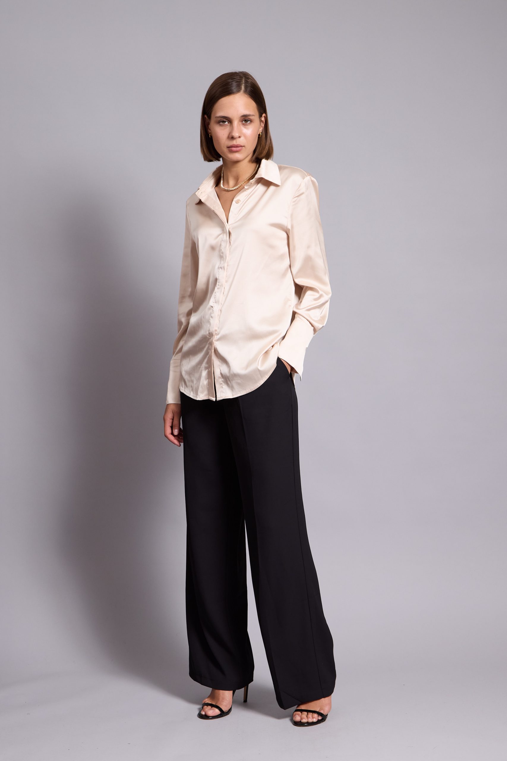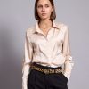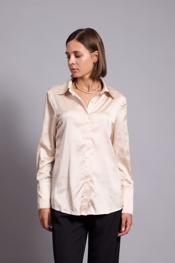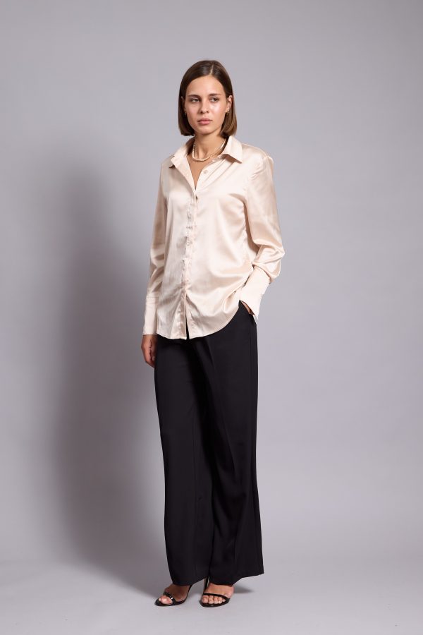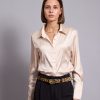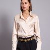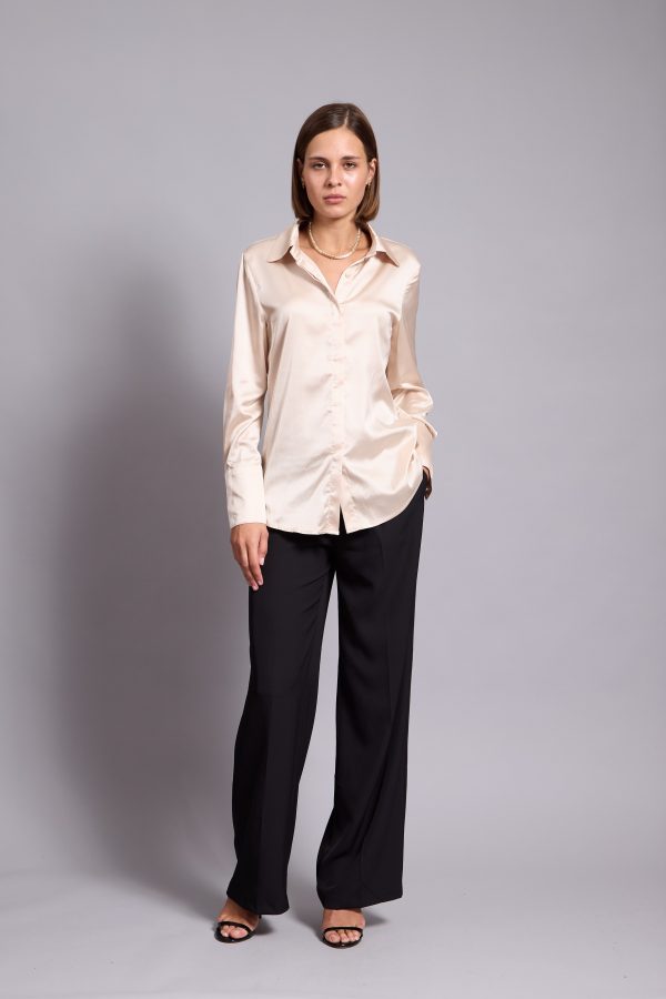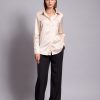This shirt will go so far in your wardrobe – style yours half-tucked into jeans, silk pants cinched with a belt or layered under a knit vest. Cut from silky satin, it has a slim  shape with buttoned cuffs and a long, curved hem.