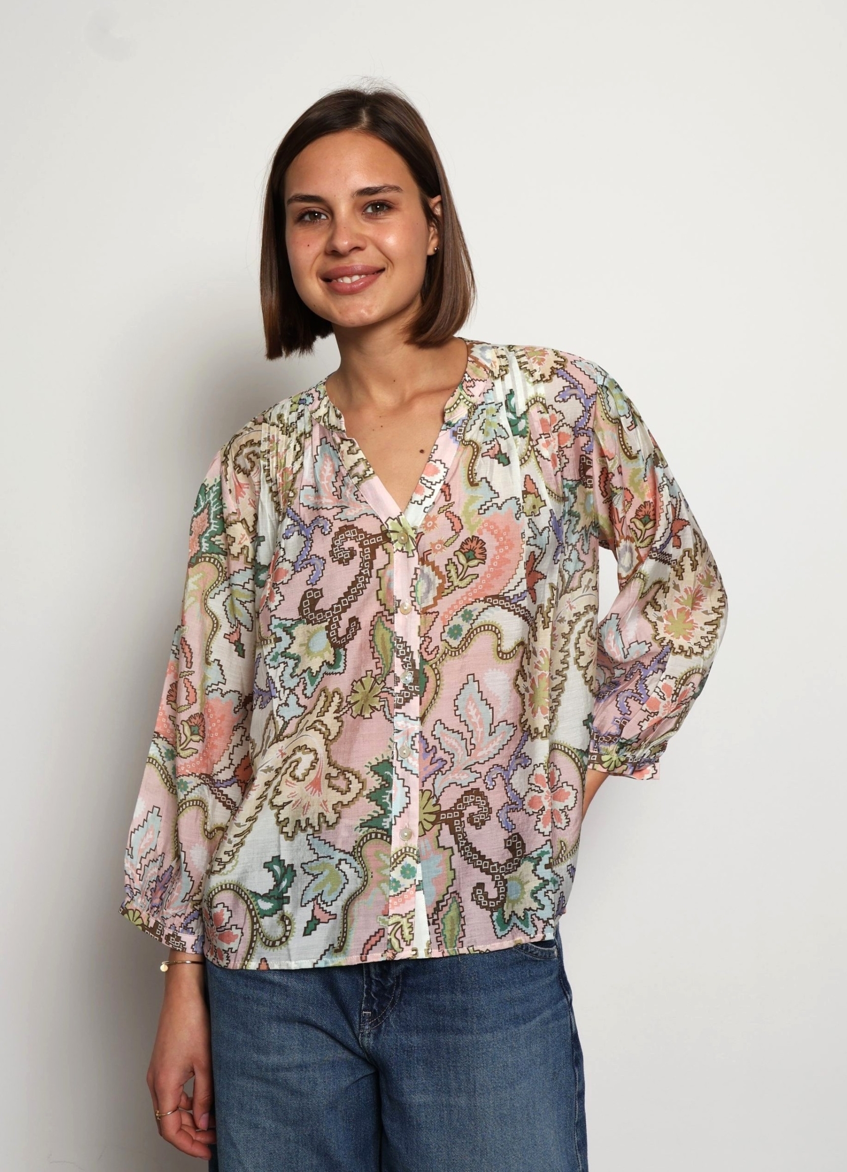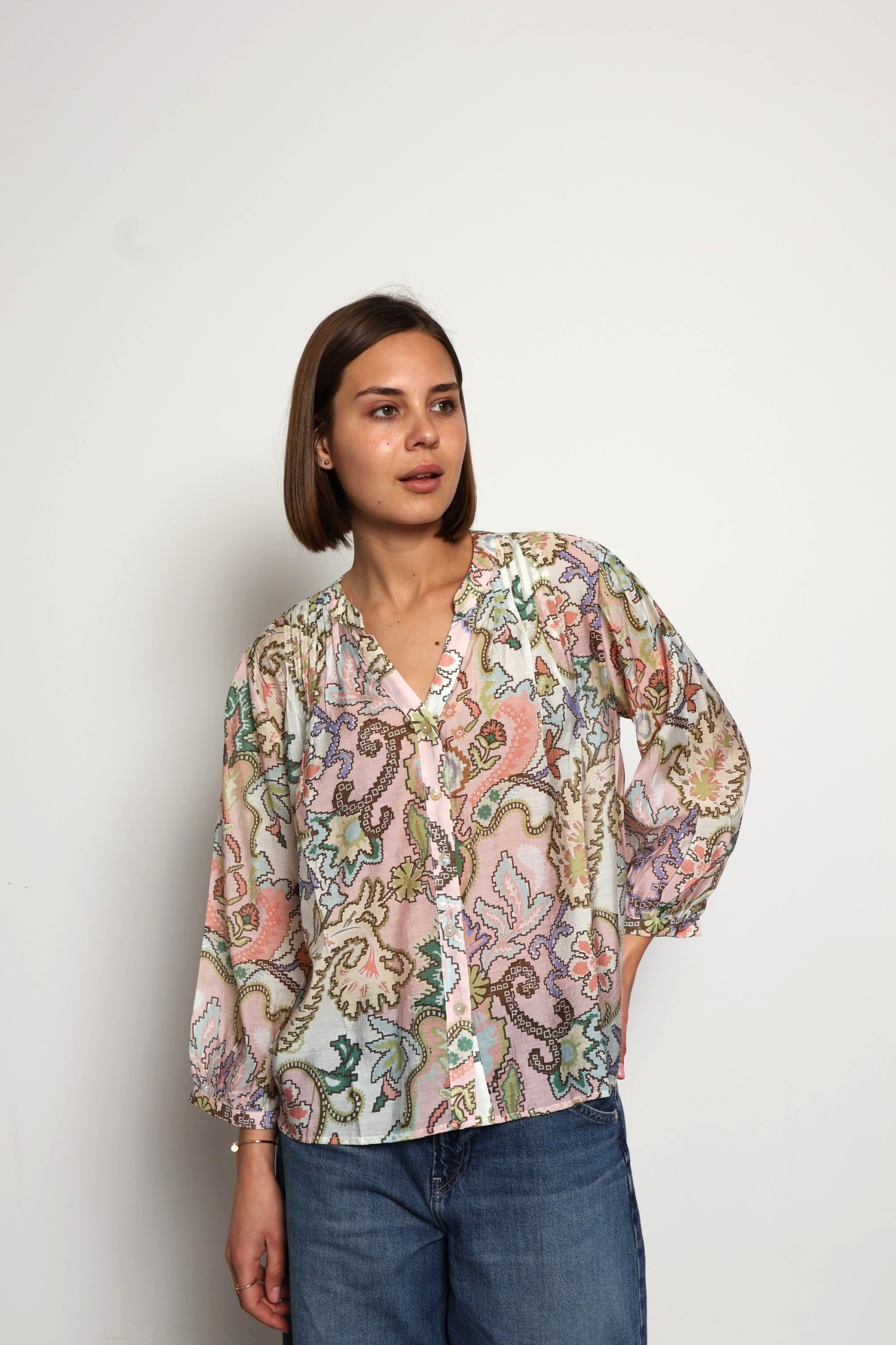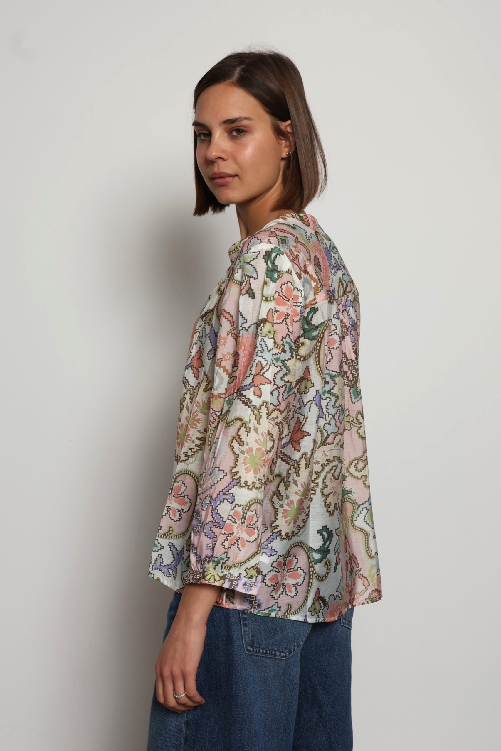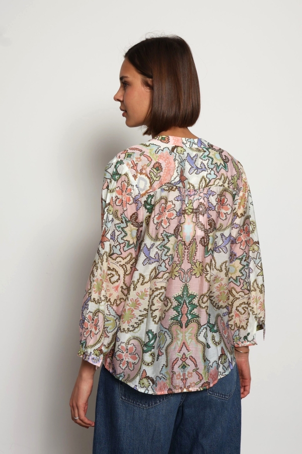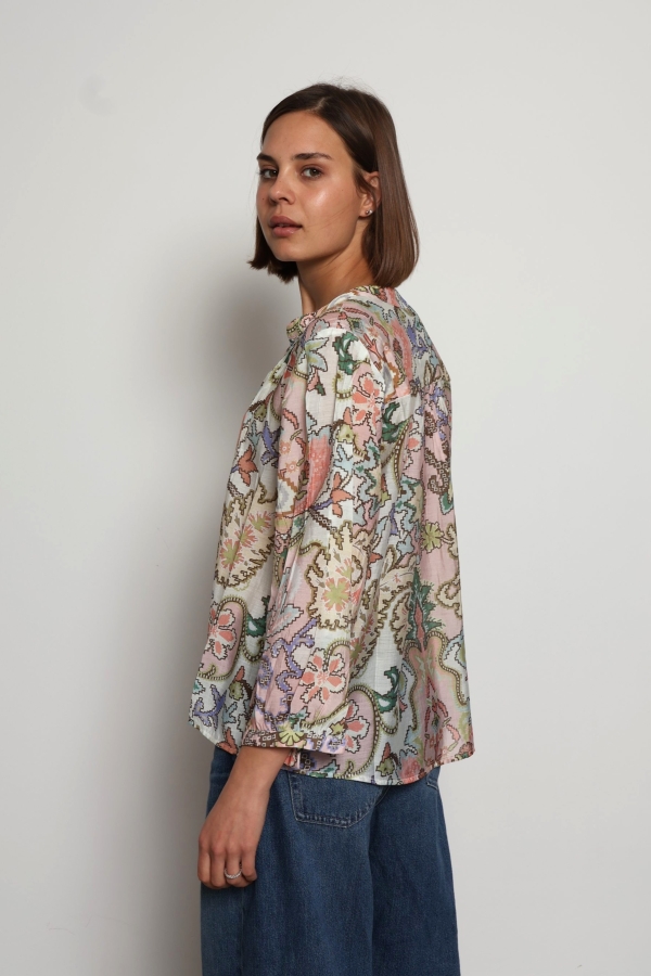 Alyna blouse is printed with dainty blooms that add to its vintage-inspired feel. One to tuck into a pair of high-waisted jeans or shorts, it’s spun from viscose and silk-blend with a mandarin collar and relaxed blouson sleeves .