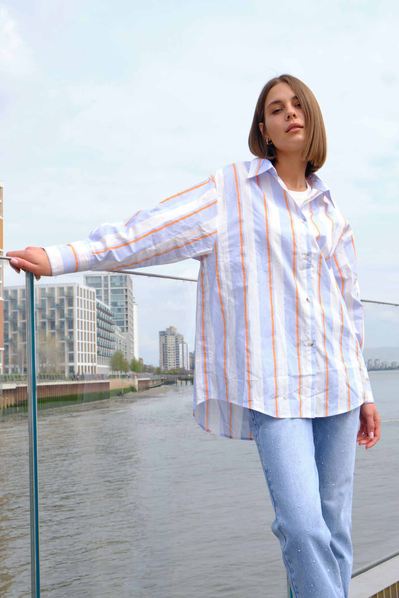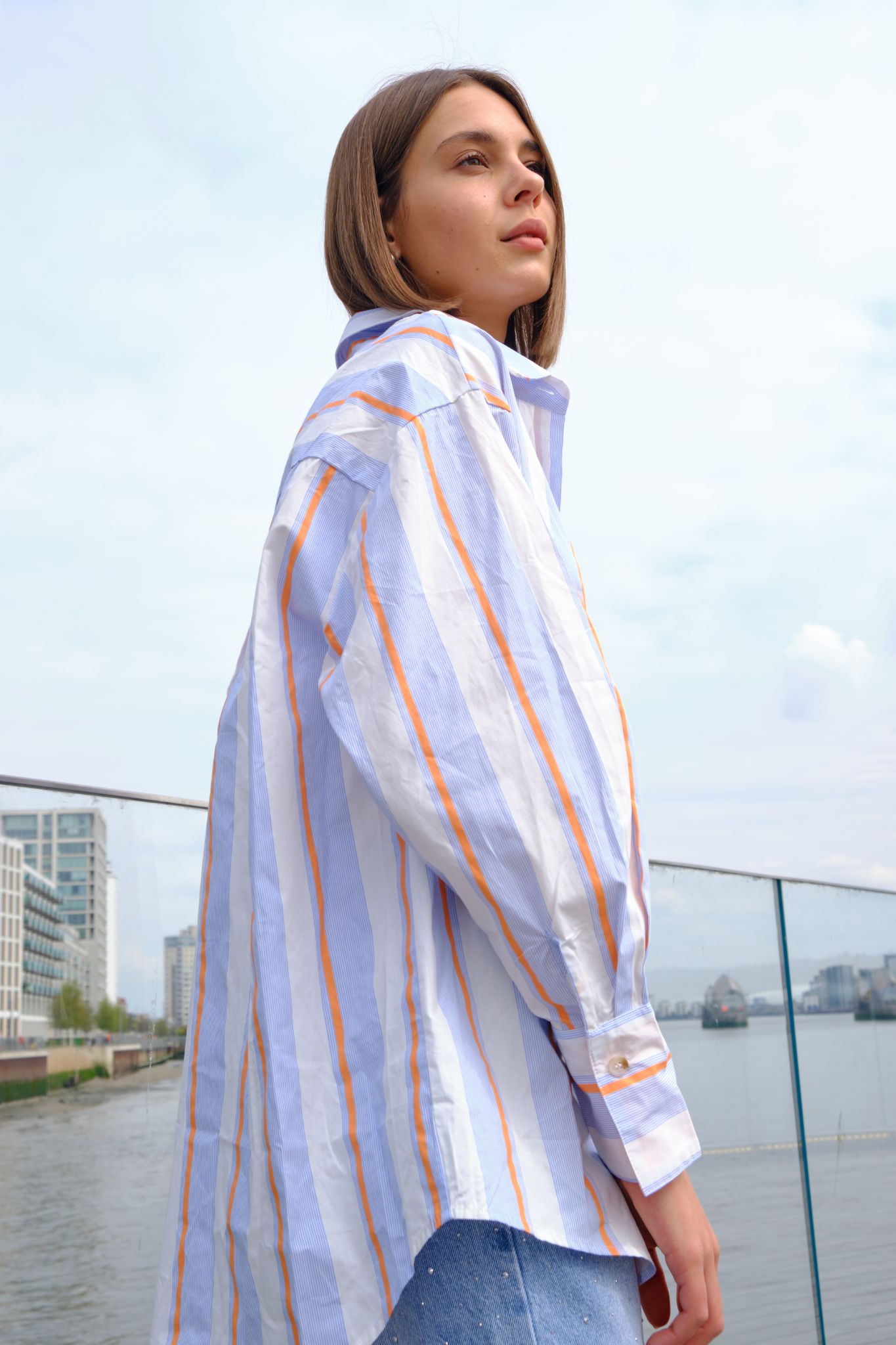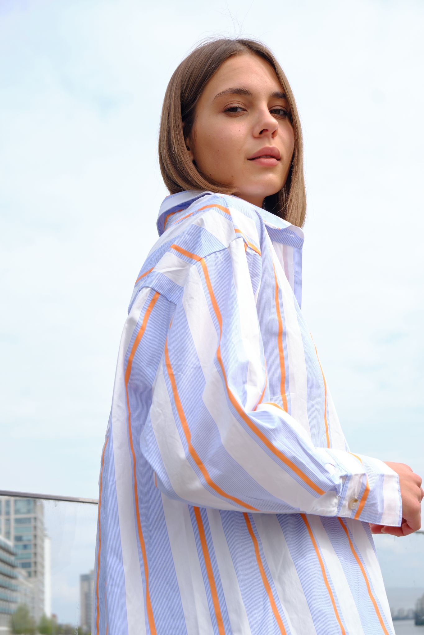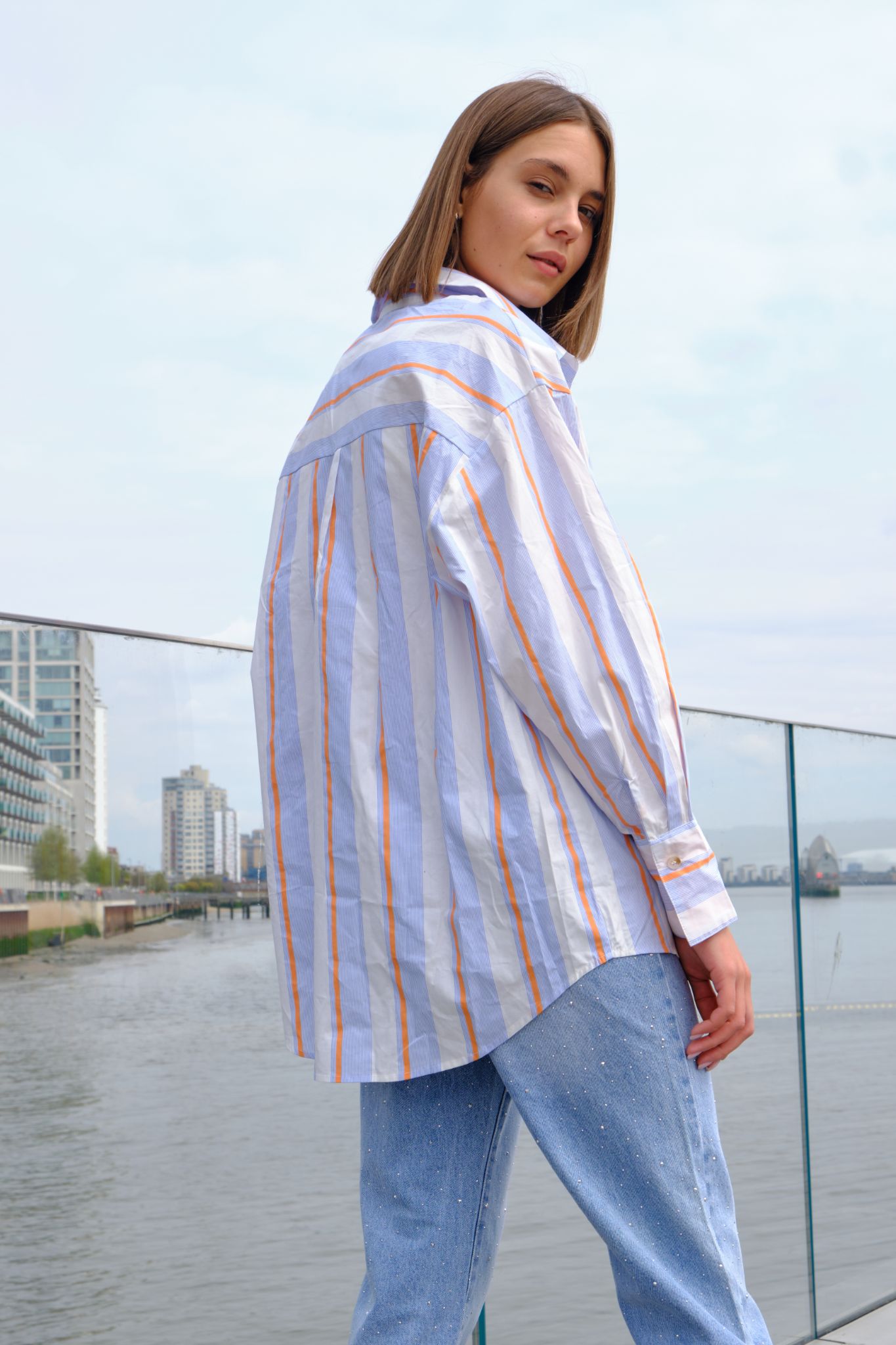 This shirt will go so far in your wardrobe – style yours half-tucked into jeans, silk pants cinched with a belt or layered under a knit vest. It has a relaxed shape with buttoned cuffs and a long, curved hem.  It’s cut from striped cotton-poplin and has a chest pocket. Wear it with a striped sweater wrapped around your shoulders. Leave a few buttons undone at the collared neckline and hem for a casual feel.