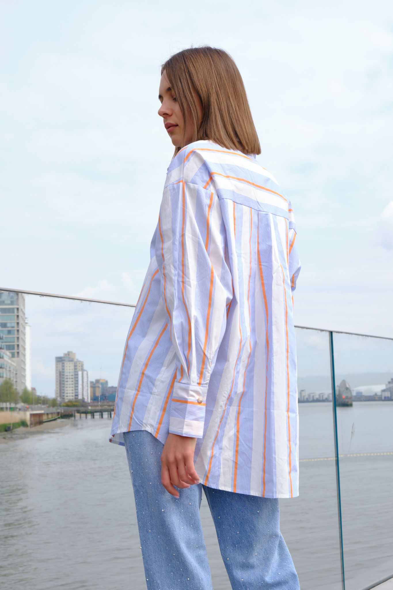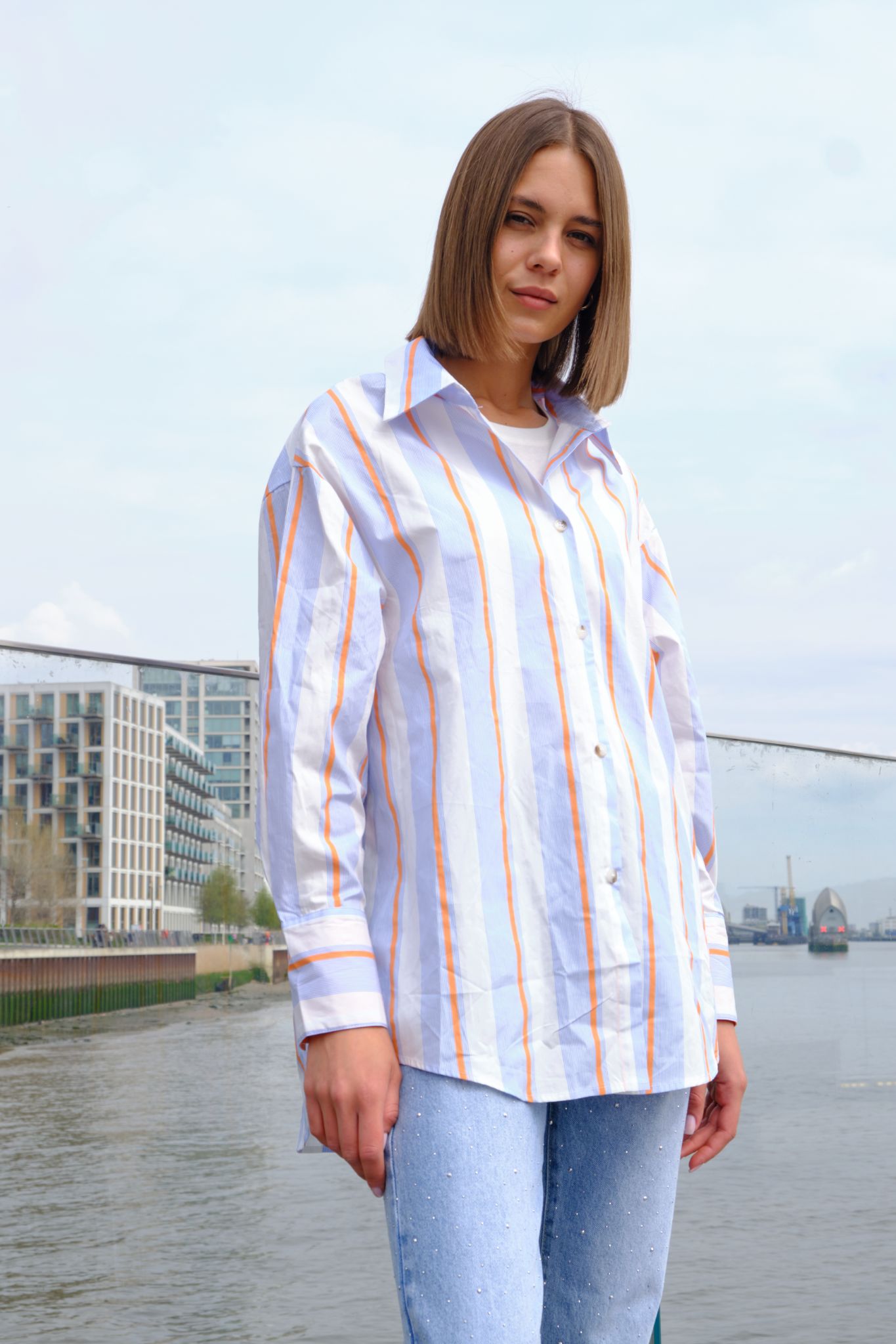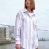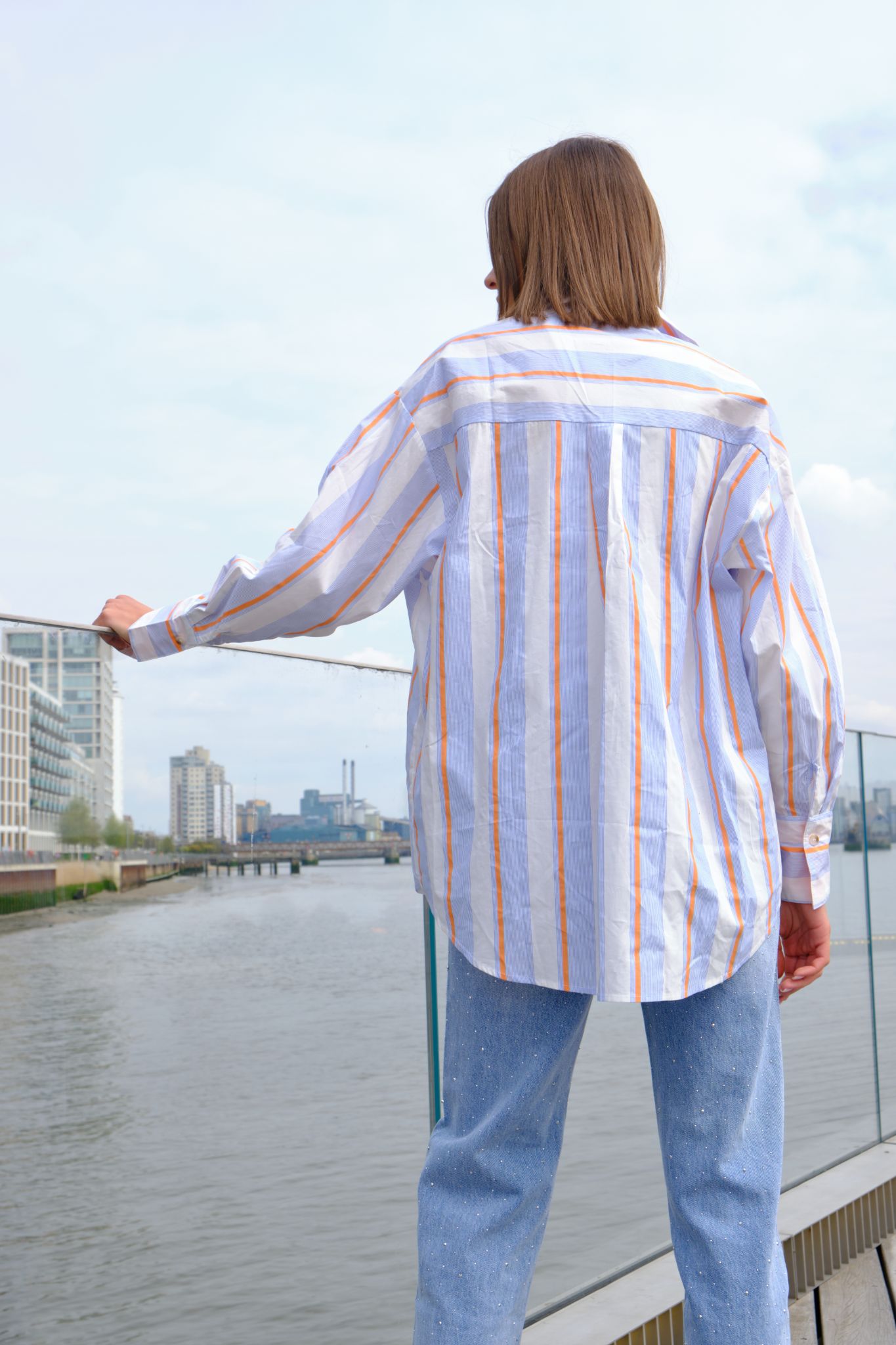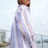 This shirt will go so far in your wardrobe – style yours half-tucked into jeans, silk pants cinched with a belt or layered under a knit vest. It has a relaxed shape with buttoned cuffs and a long, curved hem.  It’s cut from striped cotton-poplin and has a chest pocket. Wear it with a striped sweater wrapped around your shoulders. Leave a few buttons undone at the collared neckline and hem for a casual feel.
