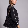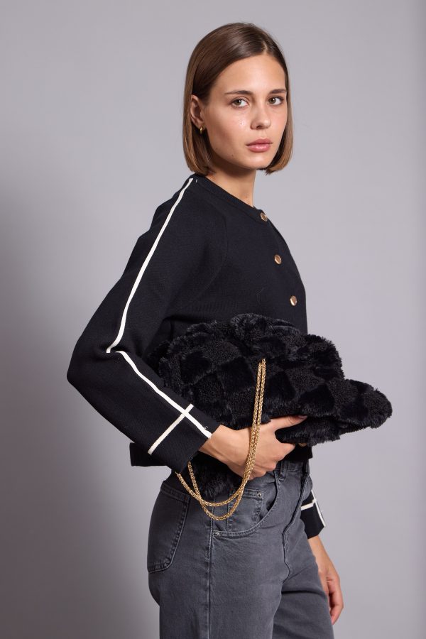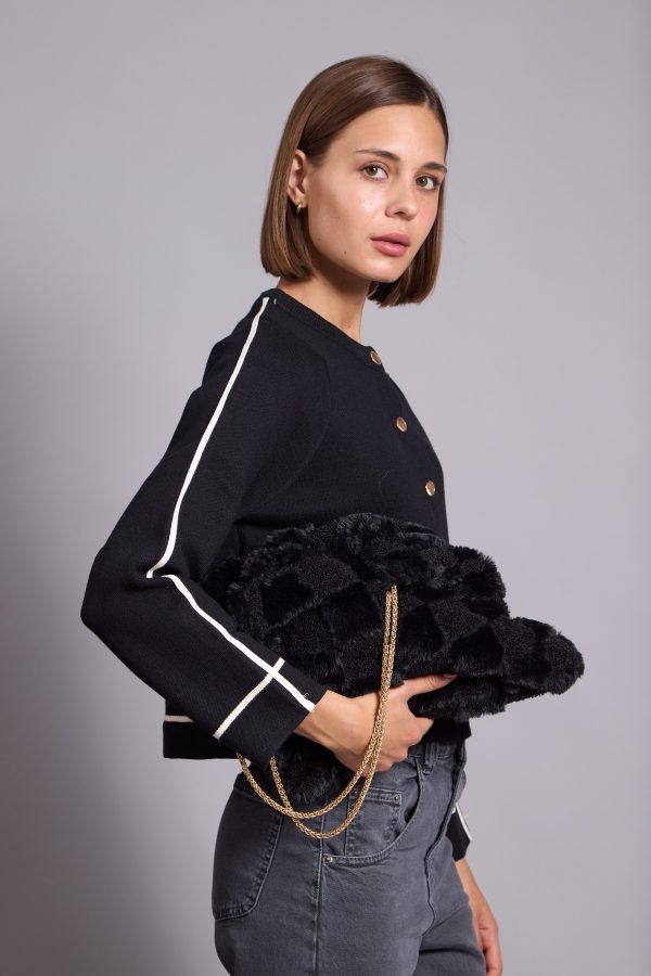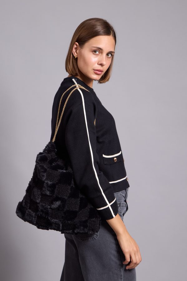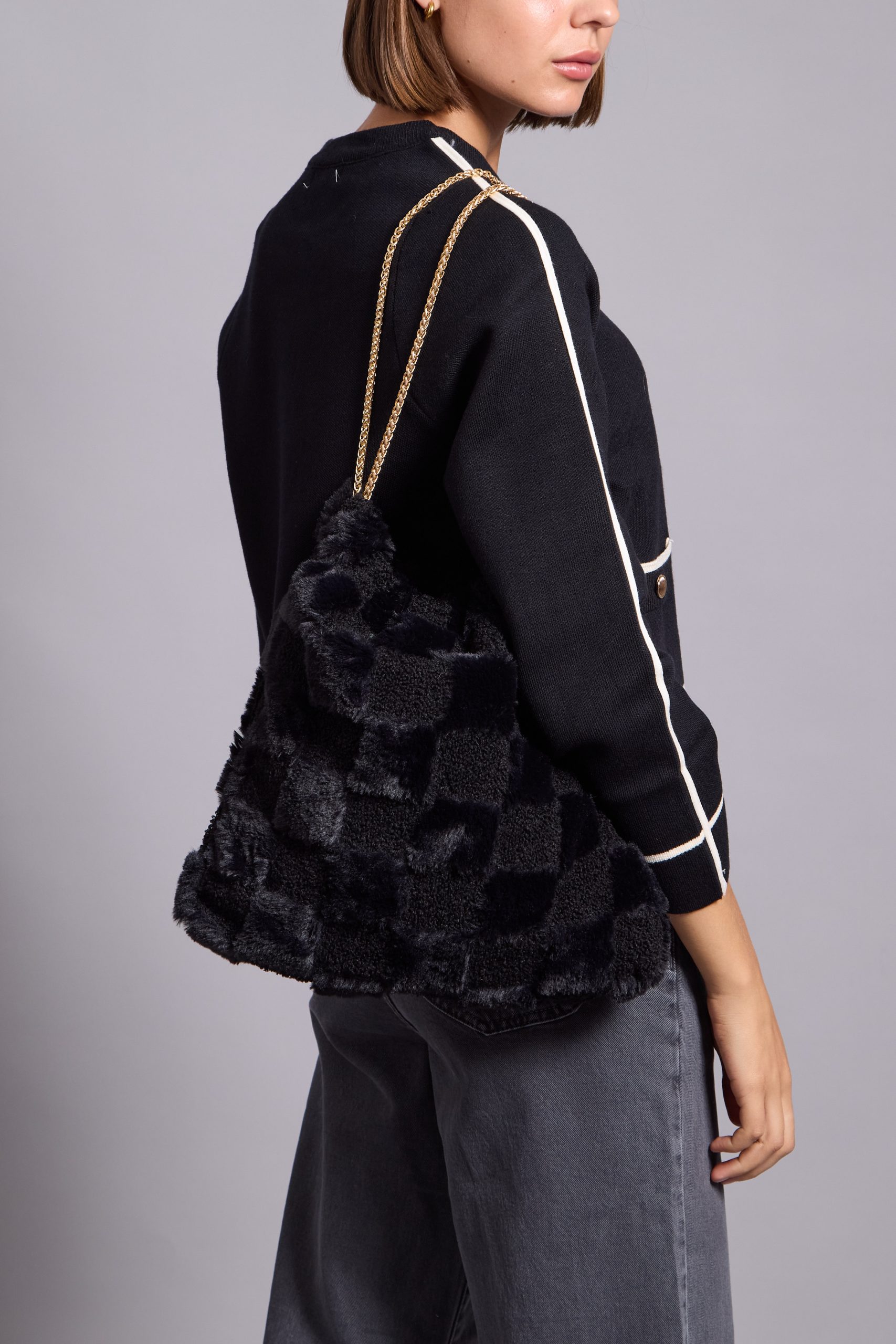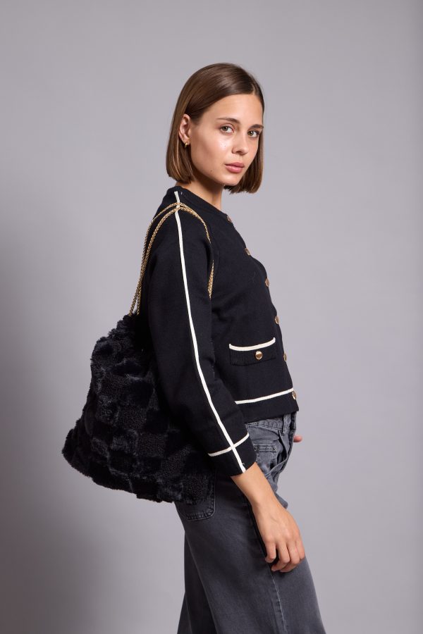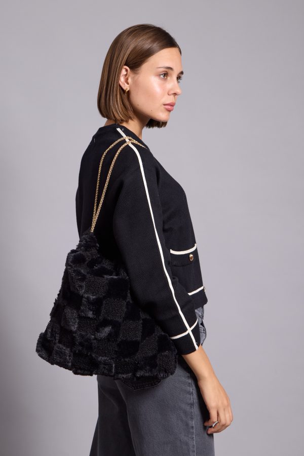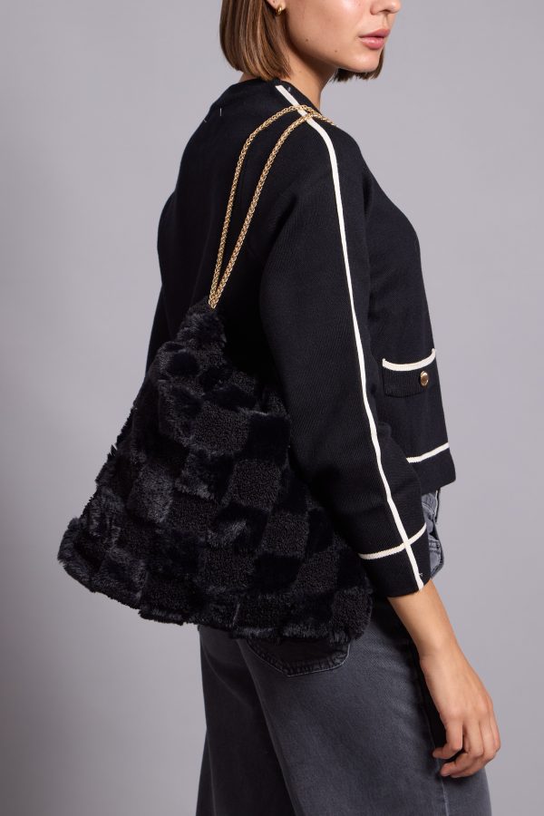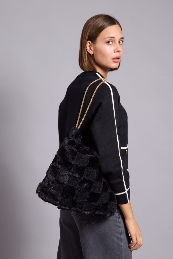 The tote silhouette bag is made from faux fur and it is compact enough to keep your everyday essentials organised.  The Andy  bag is stylish addition to your wardrobe. It’s  decorated with the gold chain long strap that can be doubled up for a shorter drop. There’s a zipped pocket inside, which will keep your apartment key and lipstick from floating around.