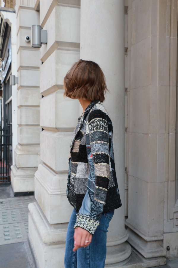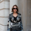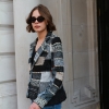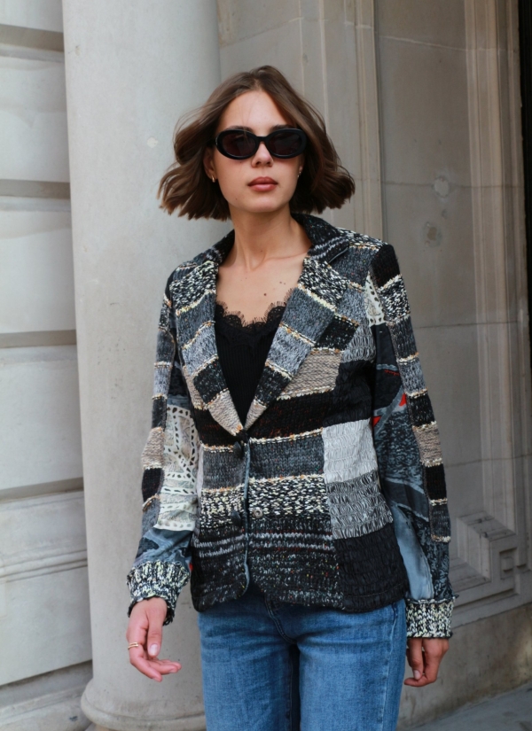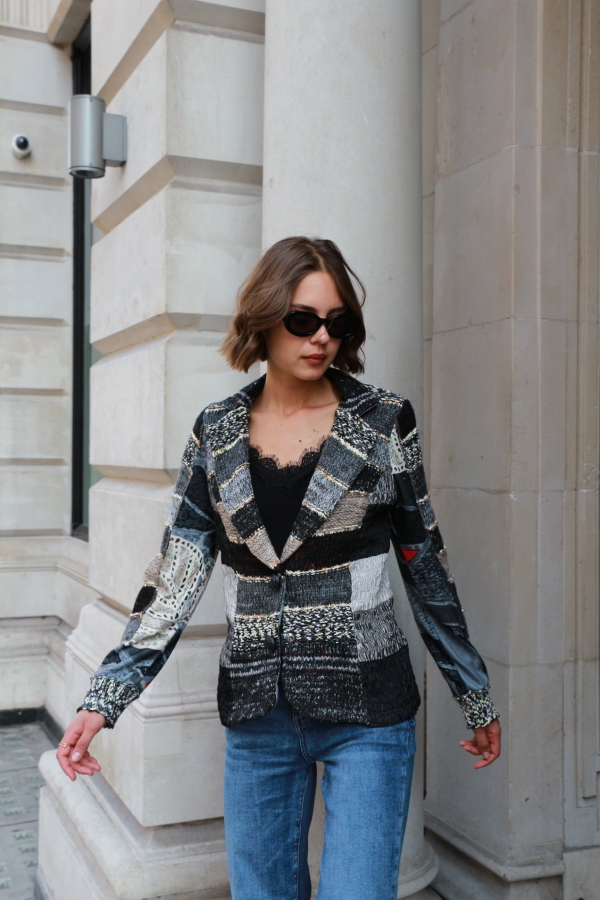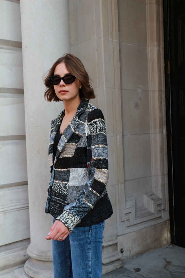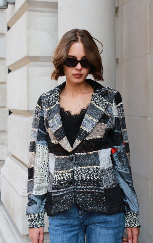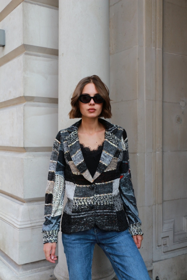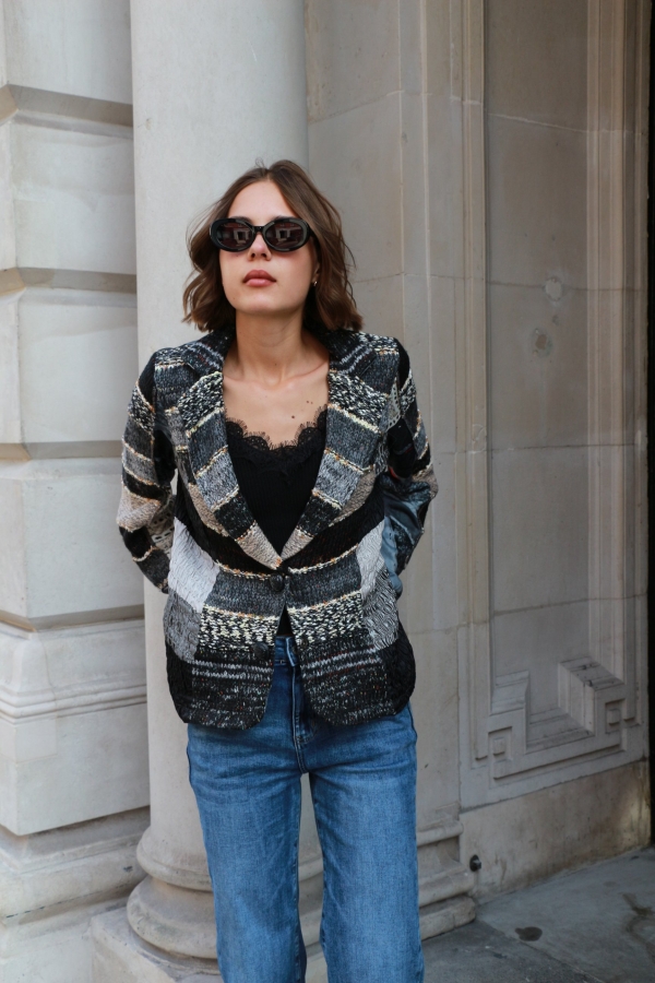 There’s something about jacquard-knit blazer that feels so elegant . It has face-framing peak lapels  and a smooth satin lining. Wear yours with the coordinating  pants. Wear it with an all-black outfit or denim pants.