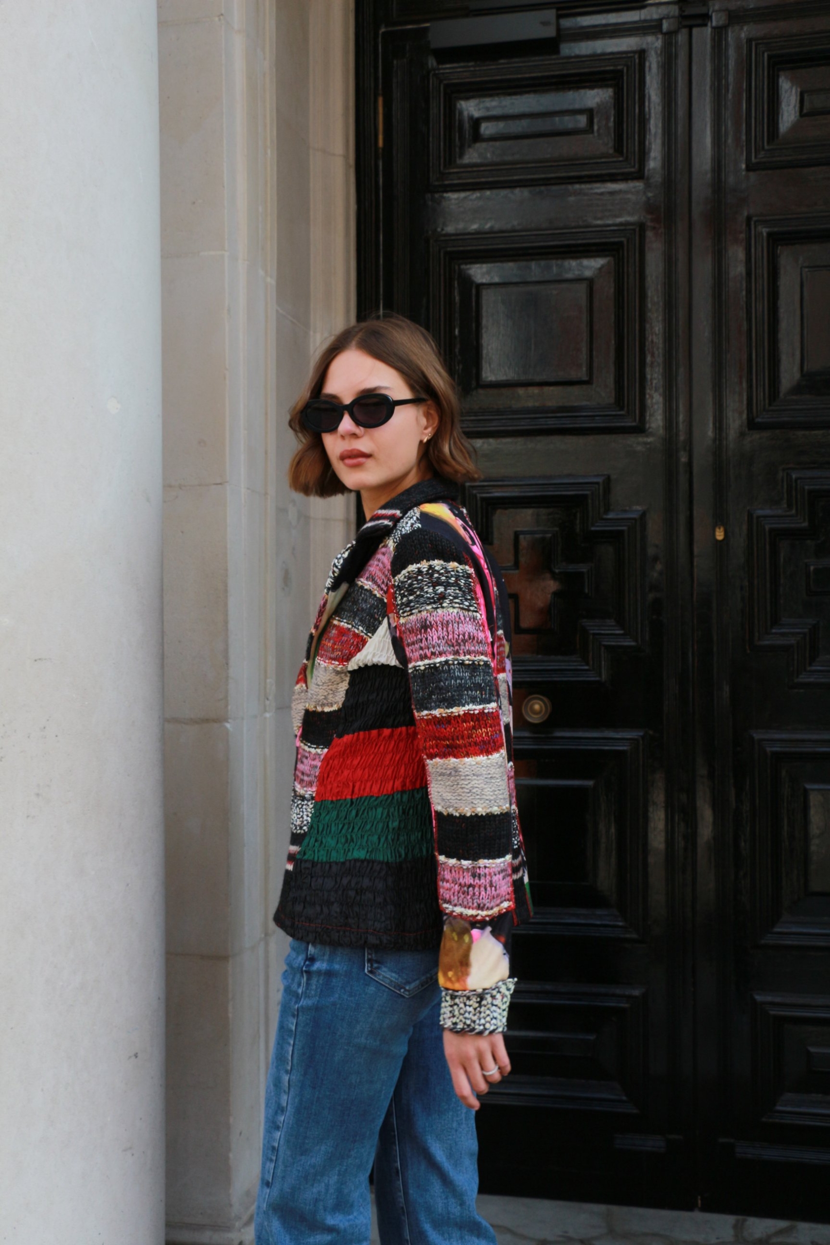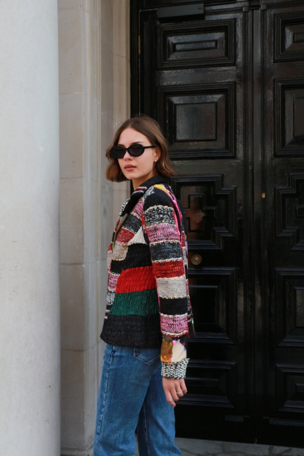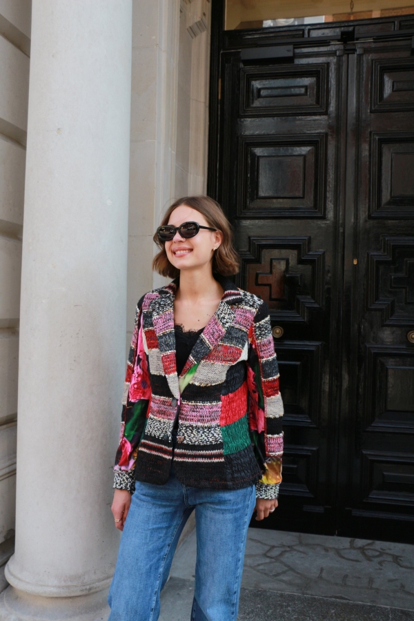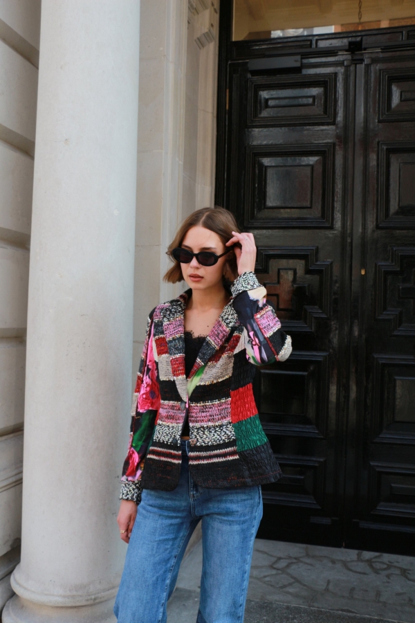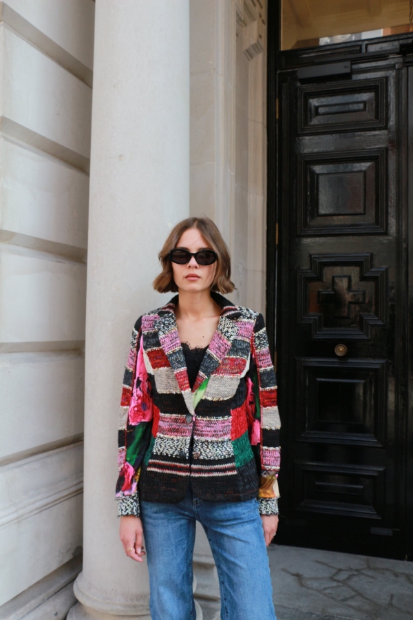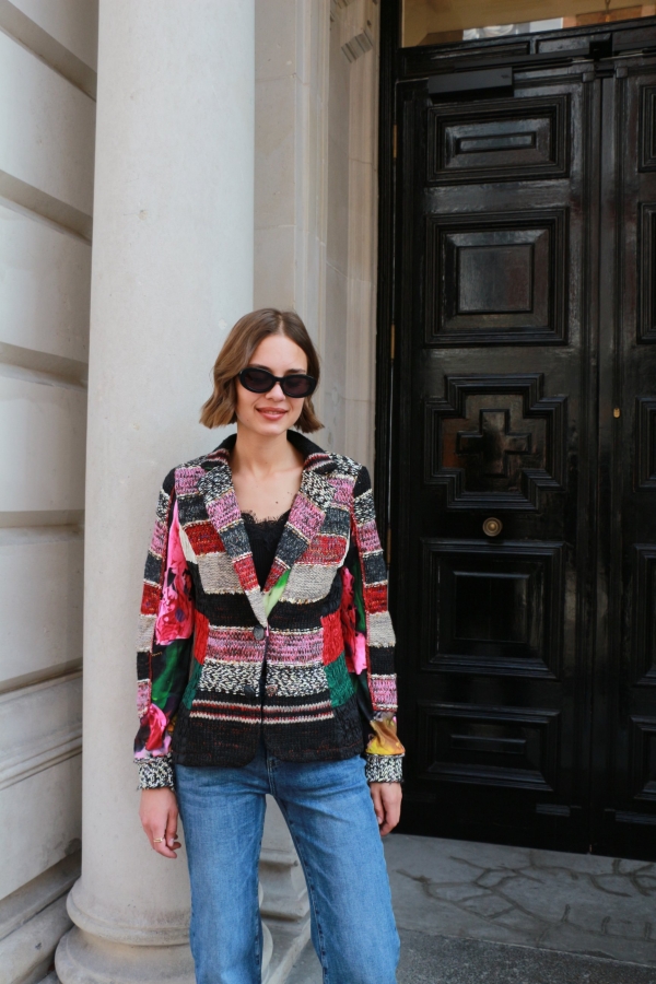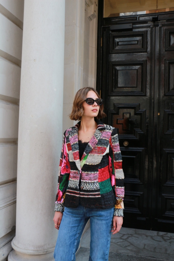 There’s something about jacquard-knit blazer that feels so elegant . It has face-framing peak lapels  and a smooth satin lining. Wear yours with the coordinating  pants. Wear it with an all-black outfit or denim pants.