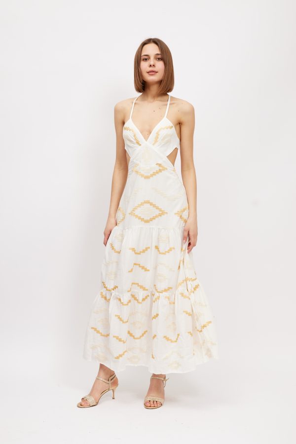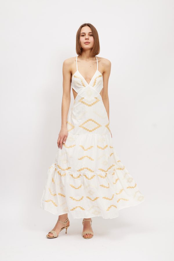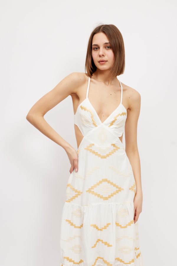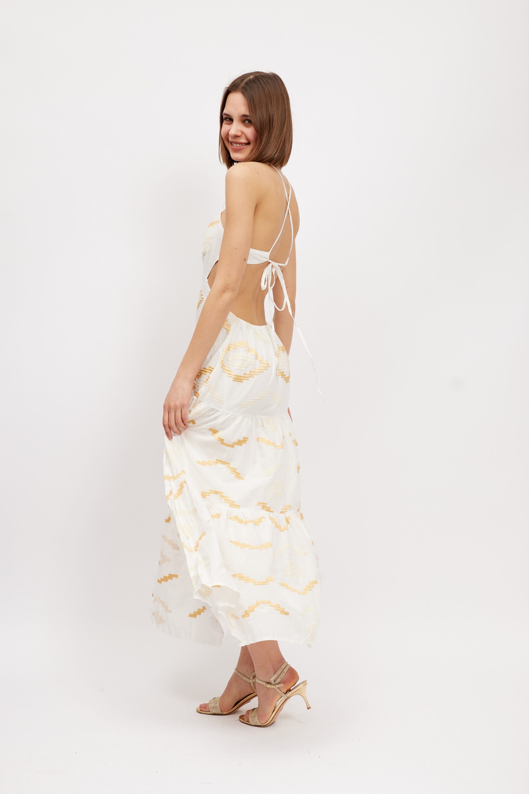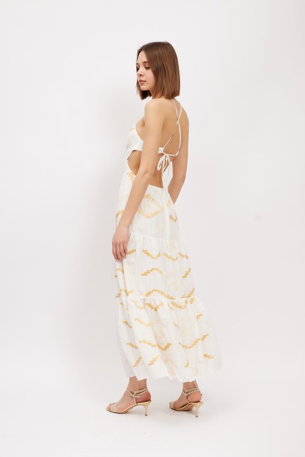All about the cut out, Capri dress is cut from lightweight cotton , so it falls and gleams effortlessly. The plunging bodice is framed by delicate straps that expose the open back. Style yours with a red lip and sandals.