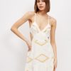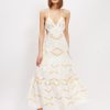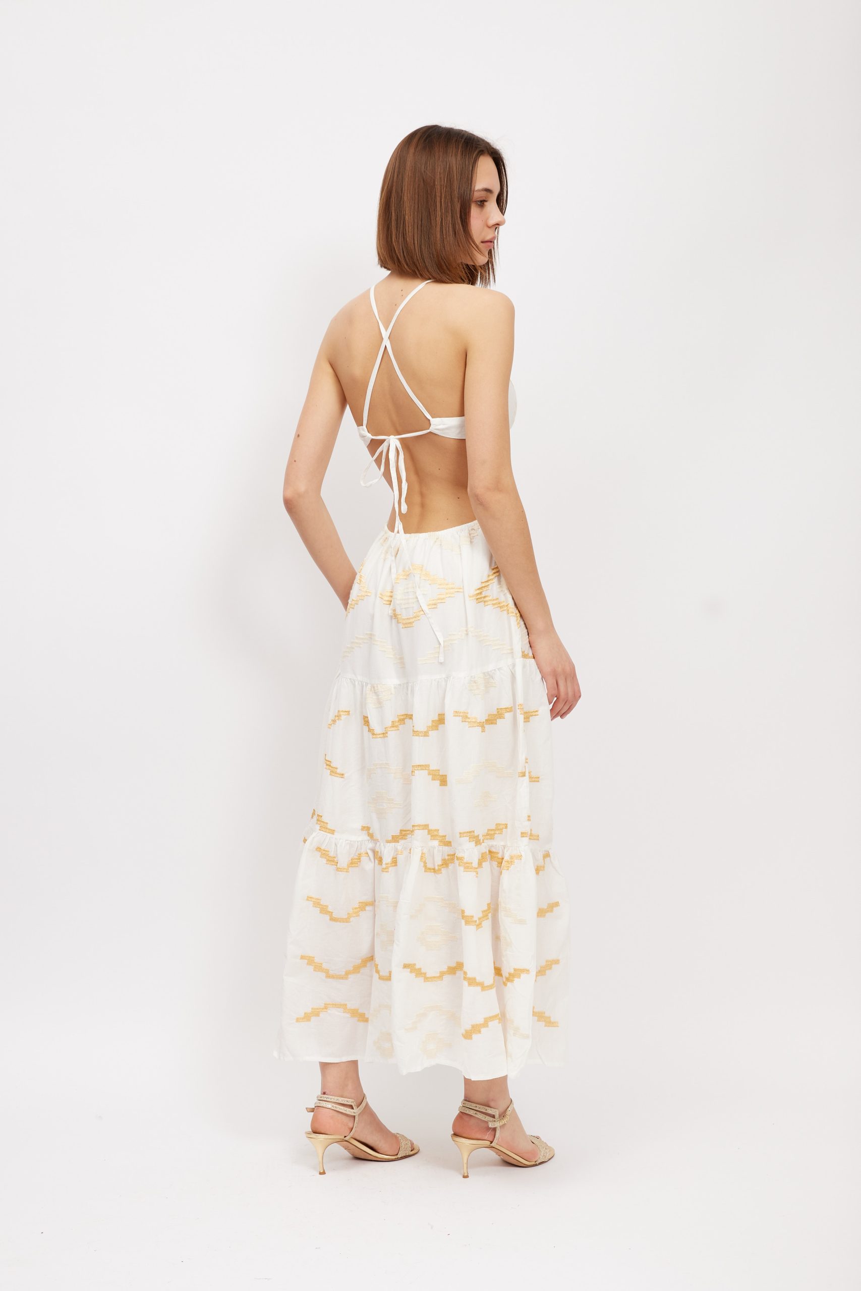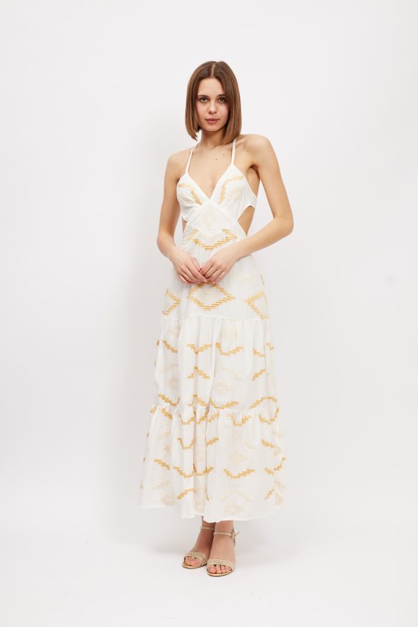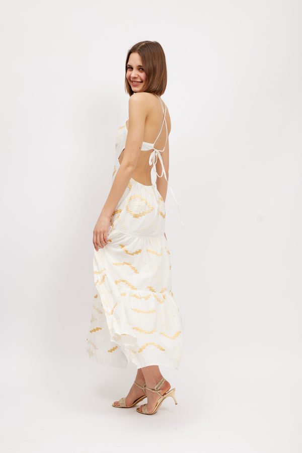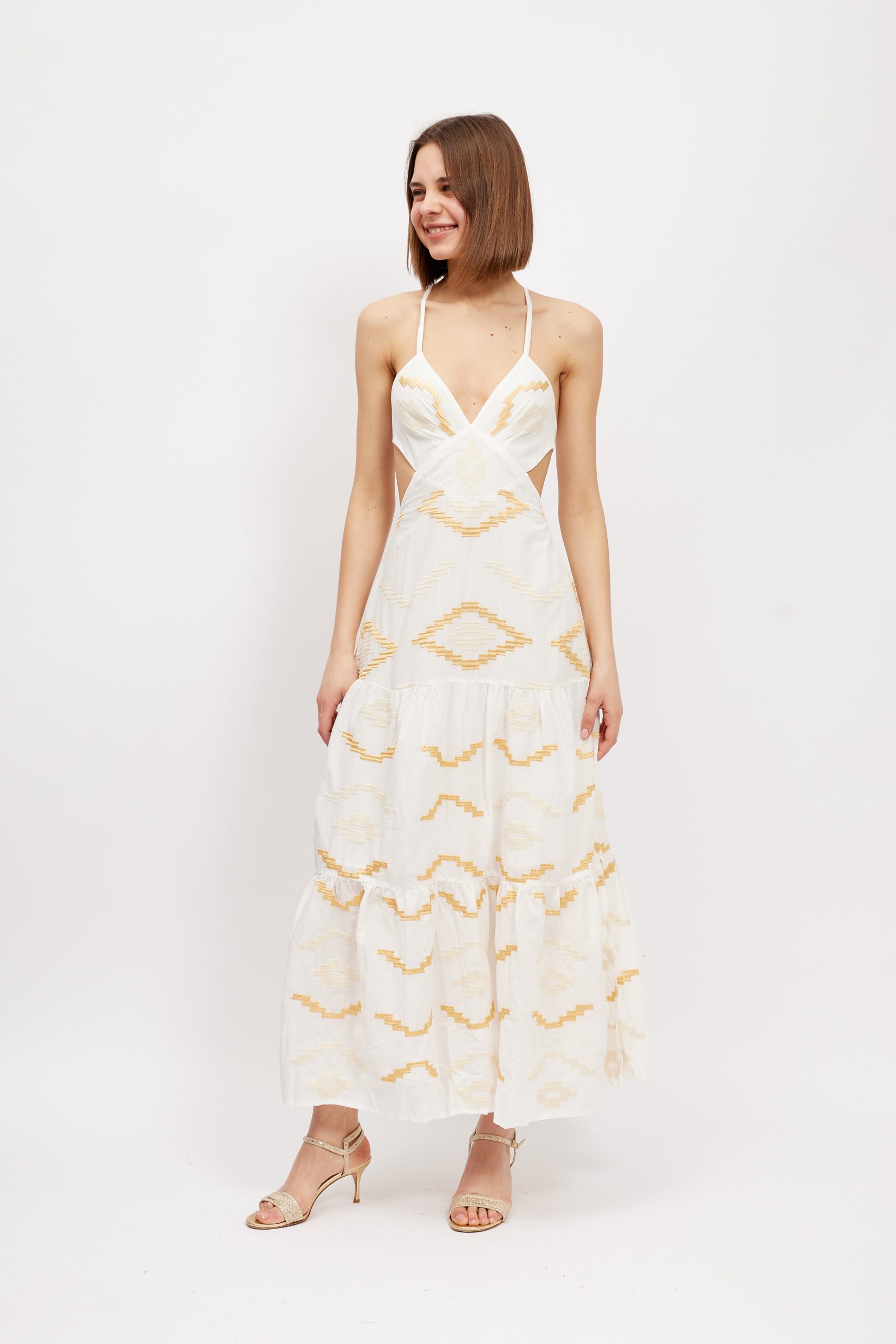 All about the cut out, Capri dress is cut from lightweight cotton , so it falls and gleams effortlessly. The plunging bodice is framed by delicate straps that expose the open back. Style yours with a red lip and sandals.