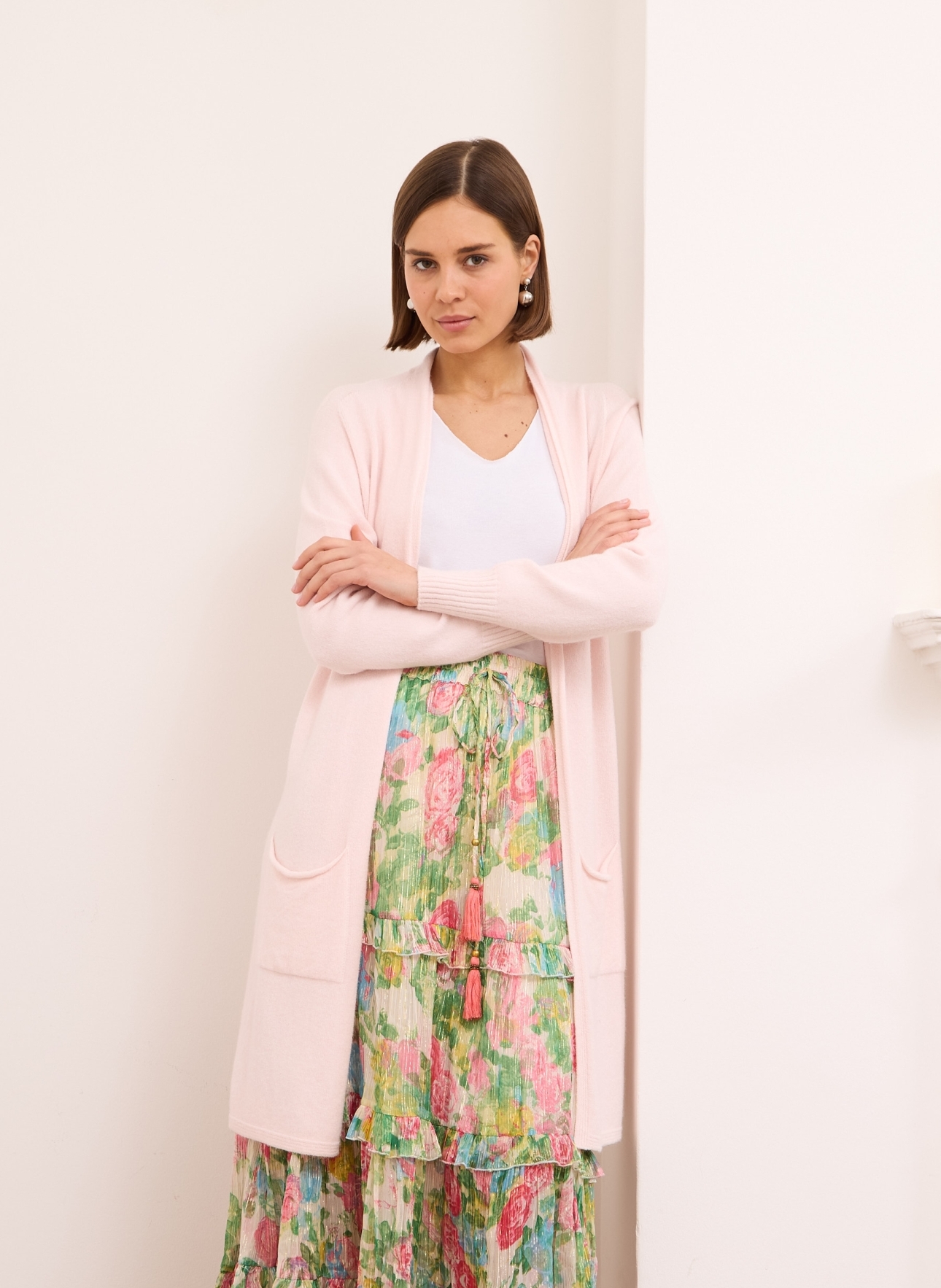 Cassandra cardigan is spun from viscose blend that has a substantial handle, so it’s equally soft and breathable. It’s designed in a relaxed, longline  silhouette with dropped shoulders and front pockets  defined by a ribbed hem and cuffs. Layer it over a camisole or t-shirt.