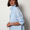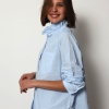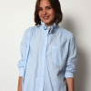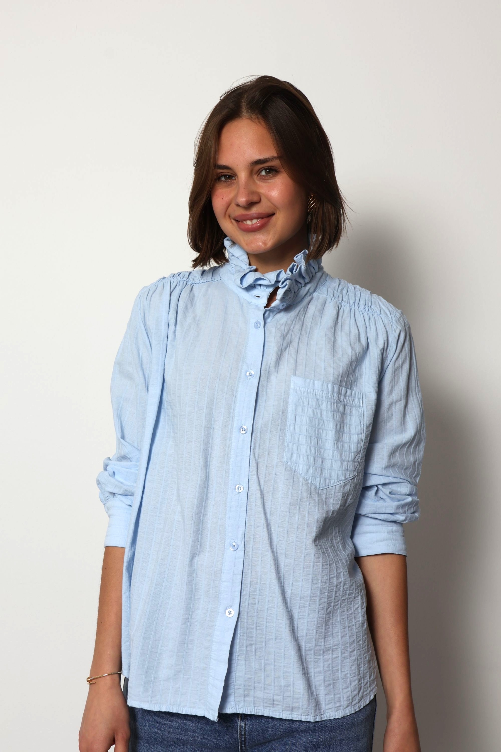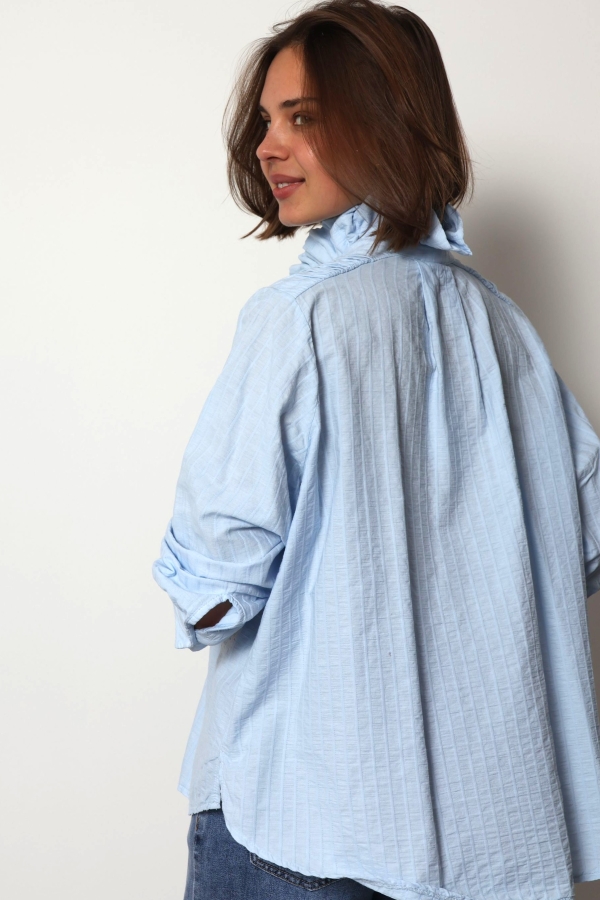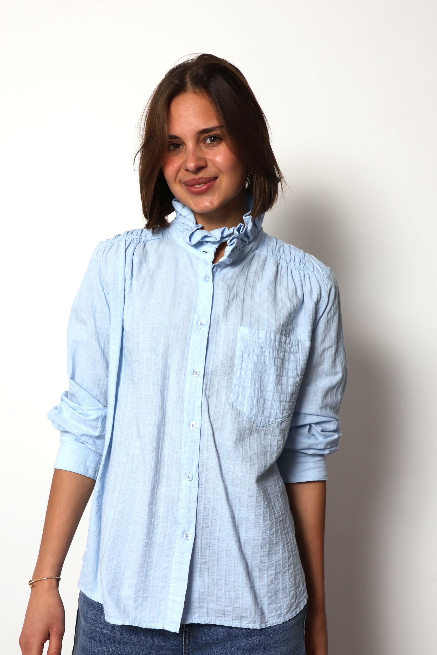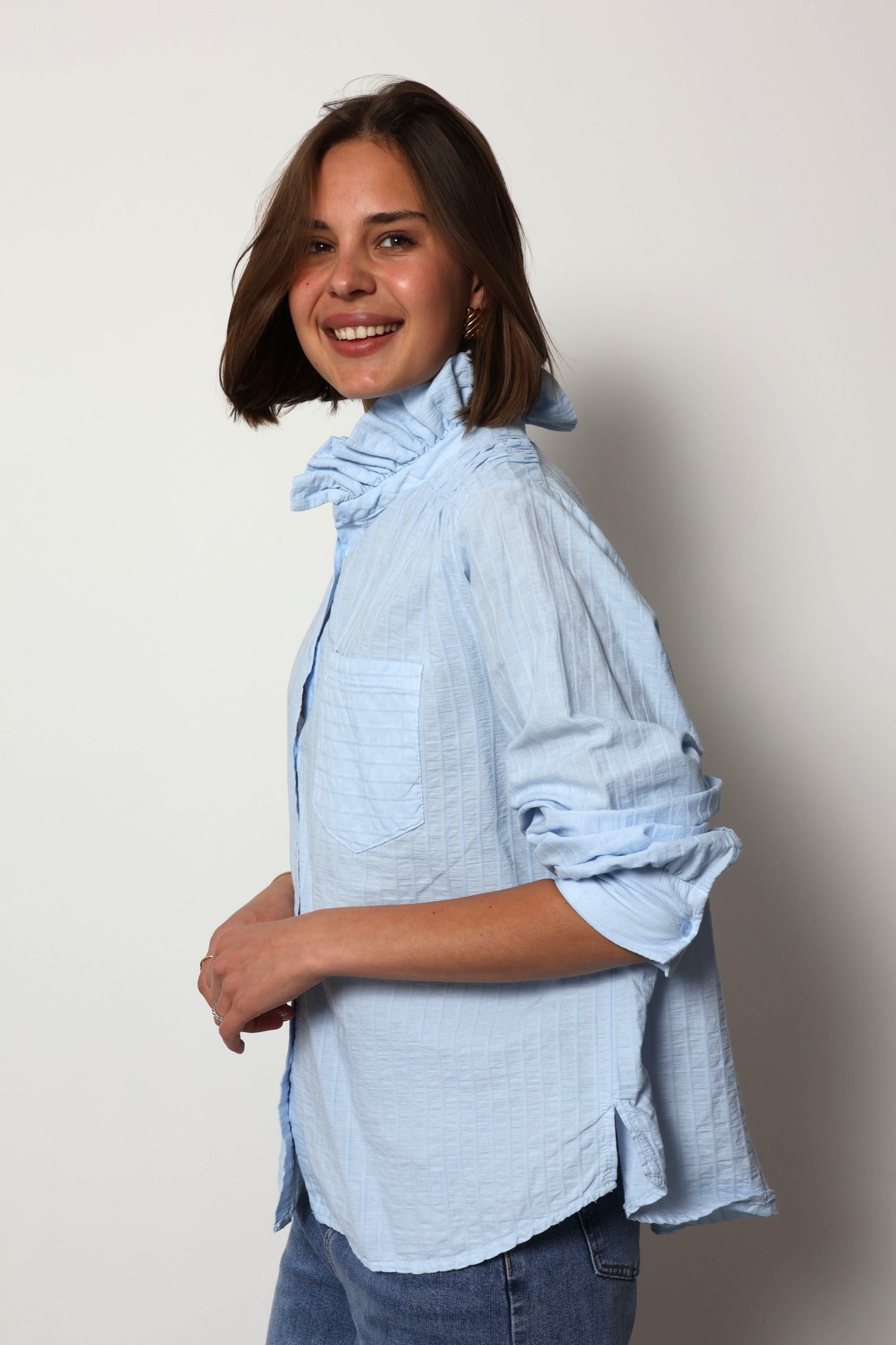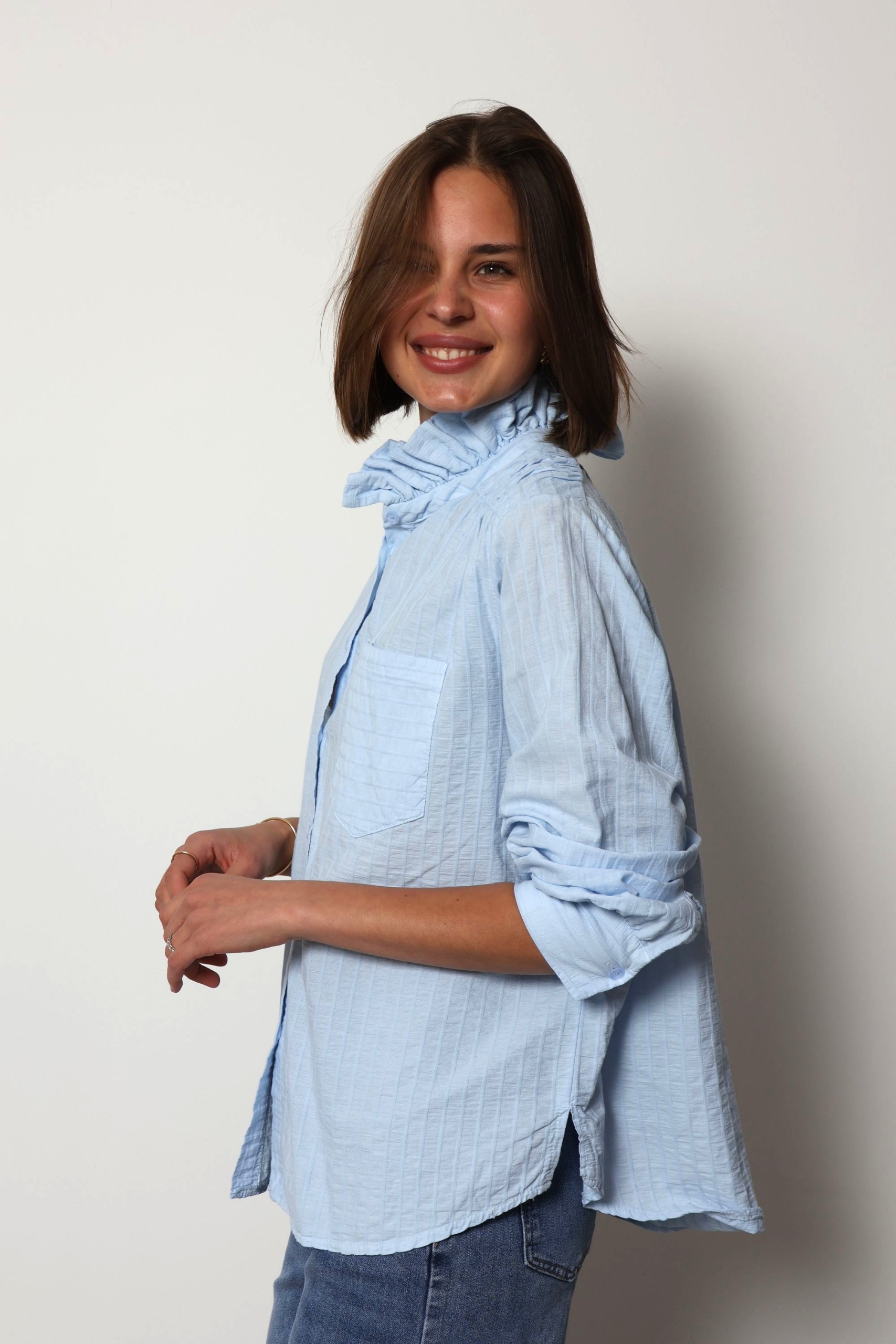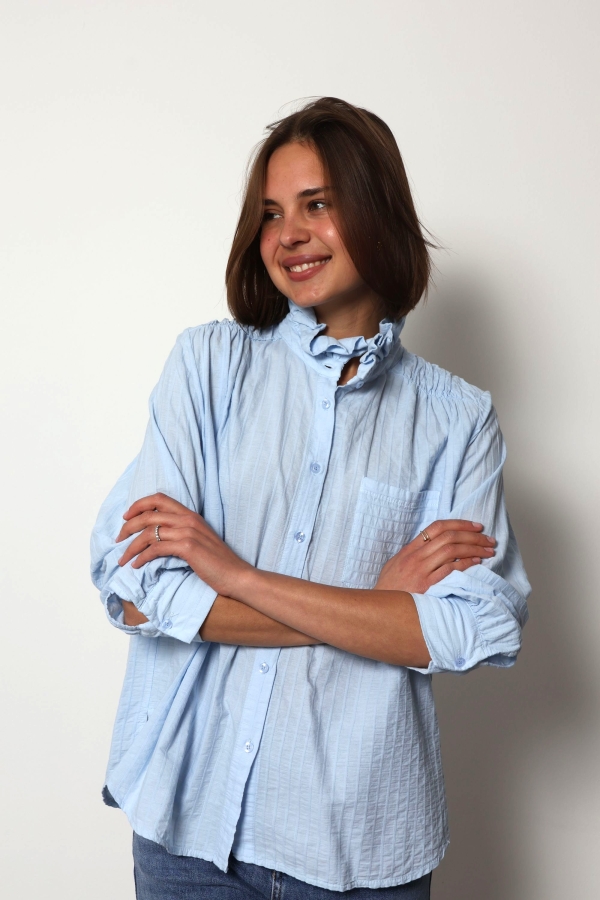 Charlie shirt with a high frill collar creates a striking combination of classic sophistication and feminine flair. The frill add structure and formality, making the shirt ideal for both professional and semi-casual occasions. The delicate frill detail at the neckline adds a soft, feminine touch, while matching frill trims at the cuffs create subtle volume and movement. The standout feature of this shirt is the high frill collar. It rises above the neckline in a soft, elegant manner, creating a sophisticated, almost vintage-inspired vibe. The frills add a delicate, ruffled texture infusing the look with femininity and charm. Switch between styling it with boyfriend jeans, slouchy tailoring and tulle skirts.