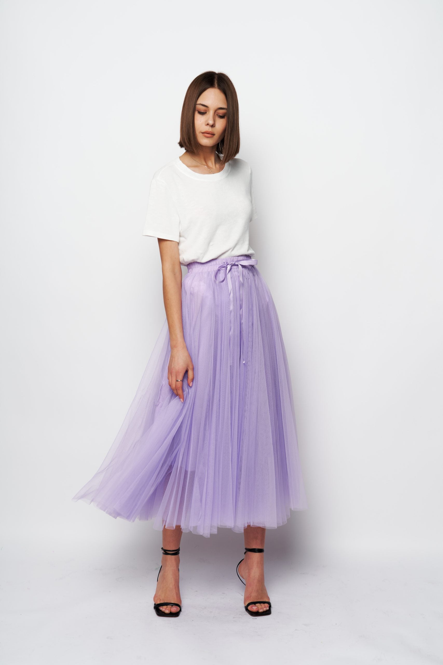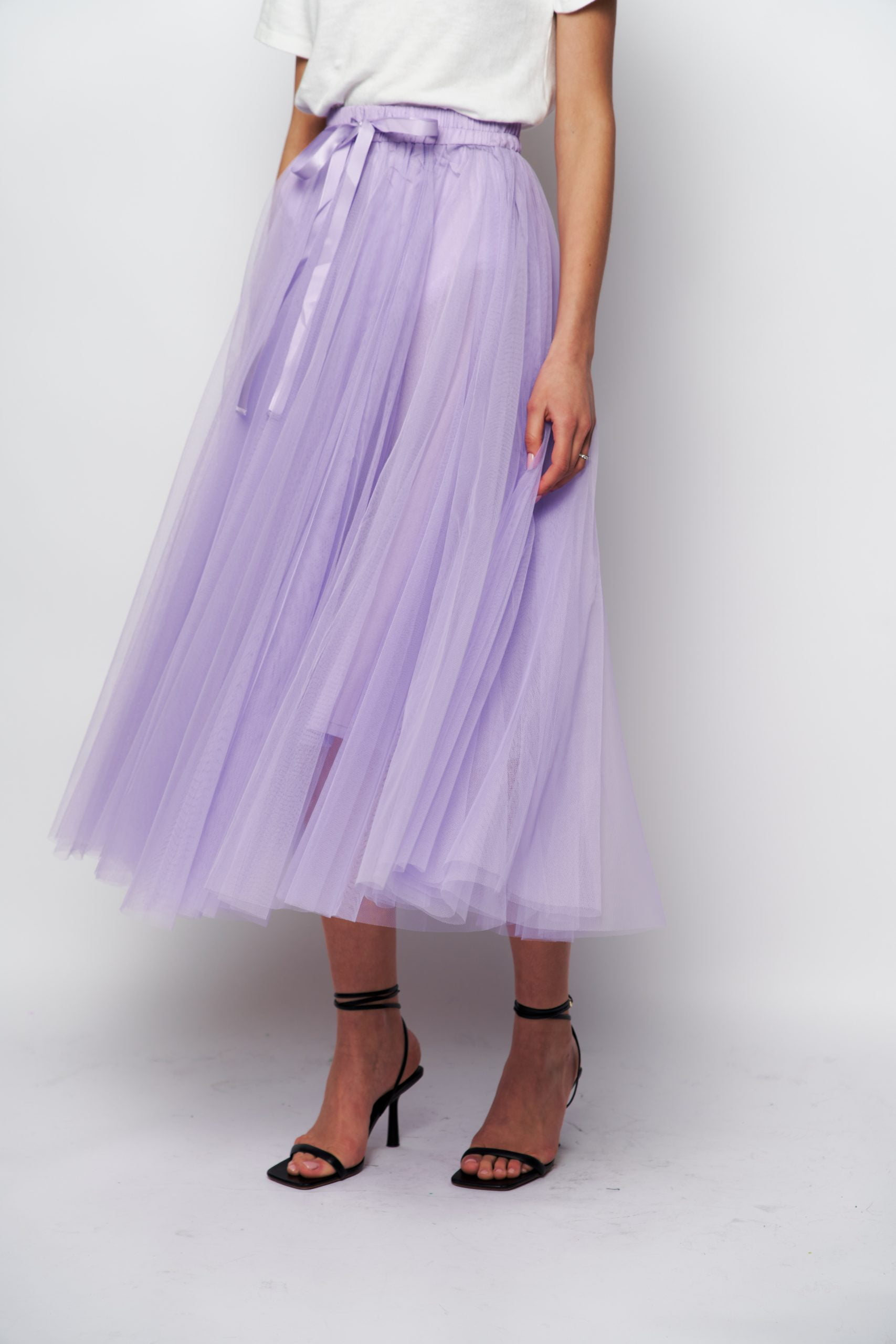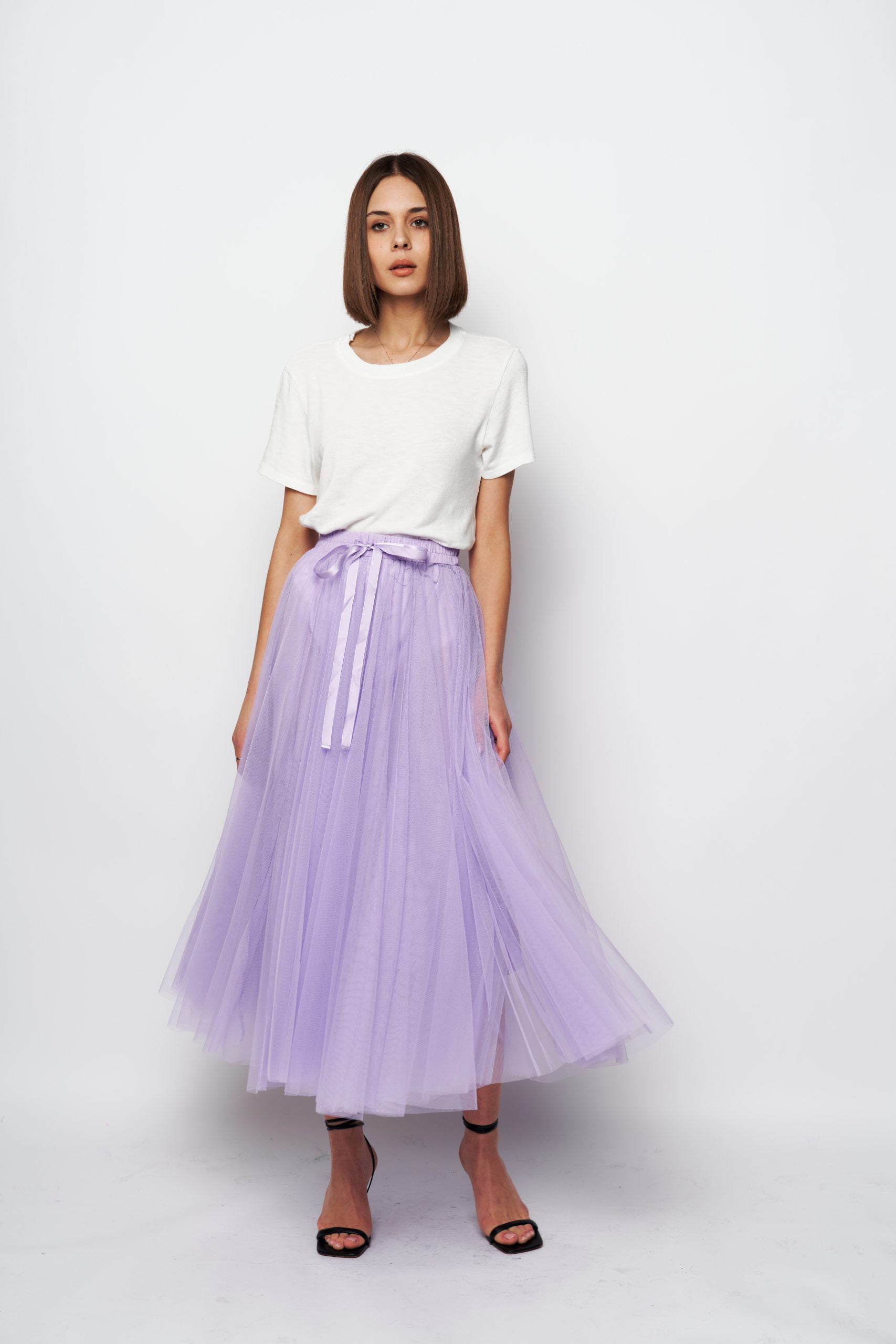 It’s crafted from layers of whisper-weight tulle . Style it with a sweater or blazer to heighten the poetic impression.