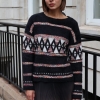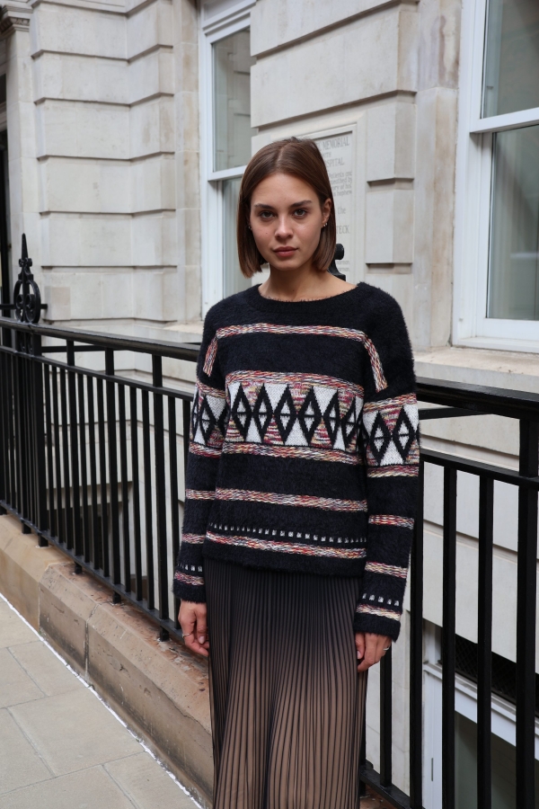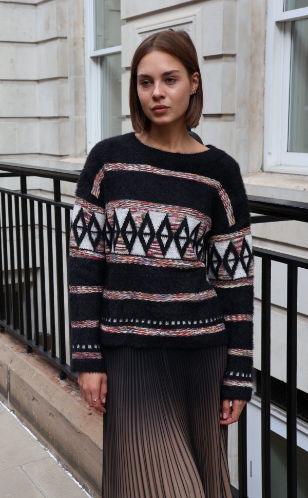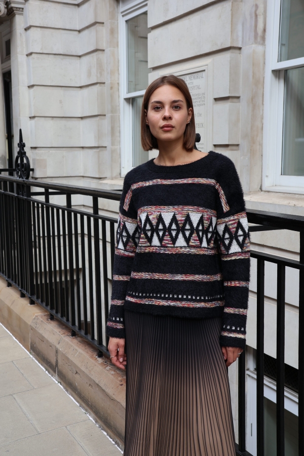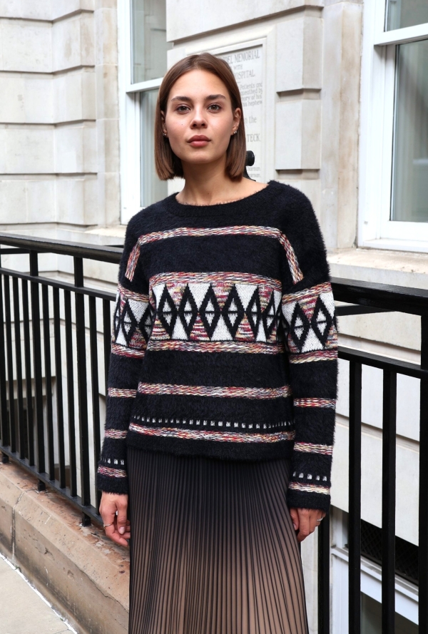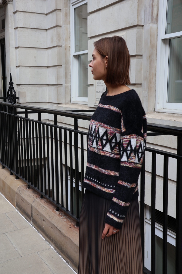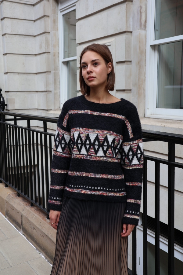 No cold-weather wardrobe would be complete without a cosy Fair Isle sweater. Made from sumptuous wool. It has a relaxed shape with chunky ribbed trims and roomy sleeves. Wear yours with jeans or a mini skirt. Jacquard sweaters are one of those pieces you turn to every season – they truly are timeless. Our version is jacquard-knitted from wool that’s brushed for added softness. It will keep you warm on chilly days. Wear yours with jeans or a mini skirt.