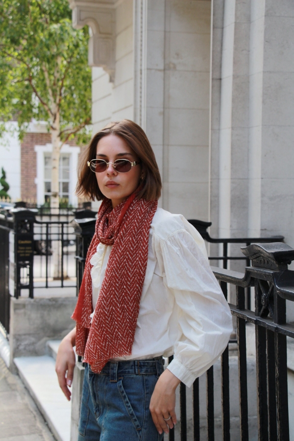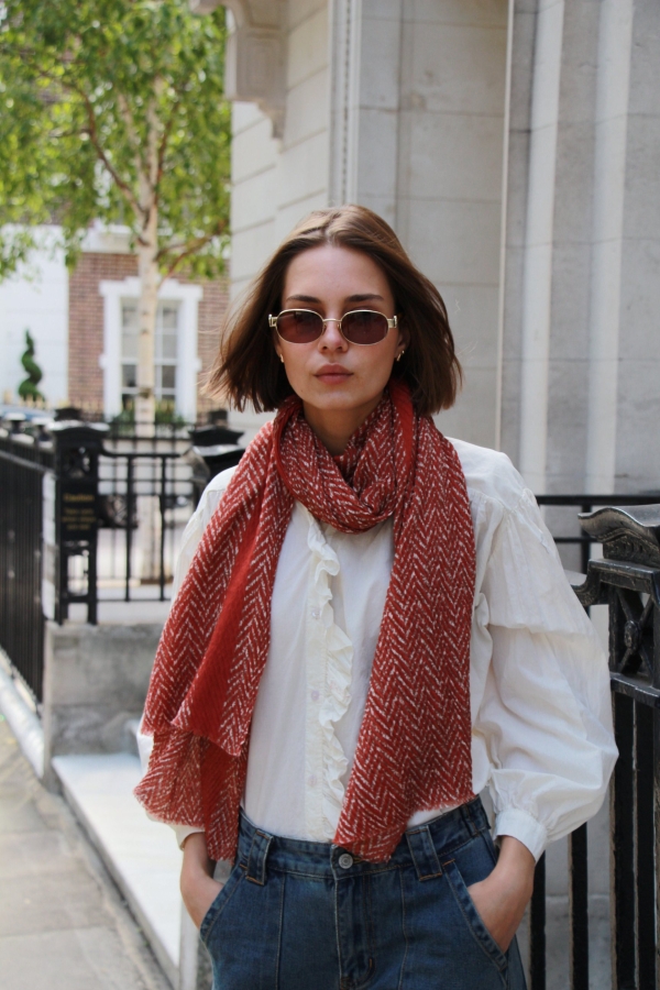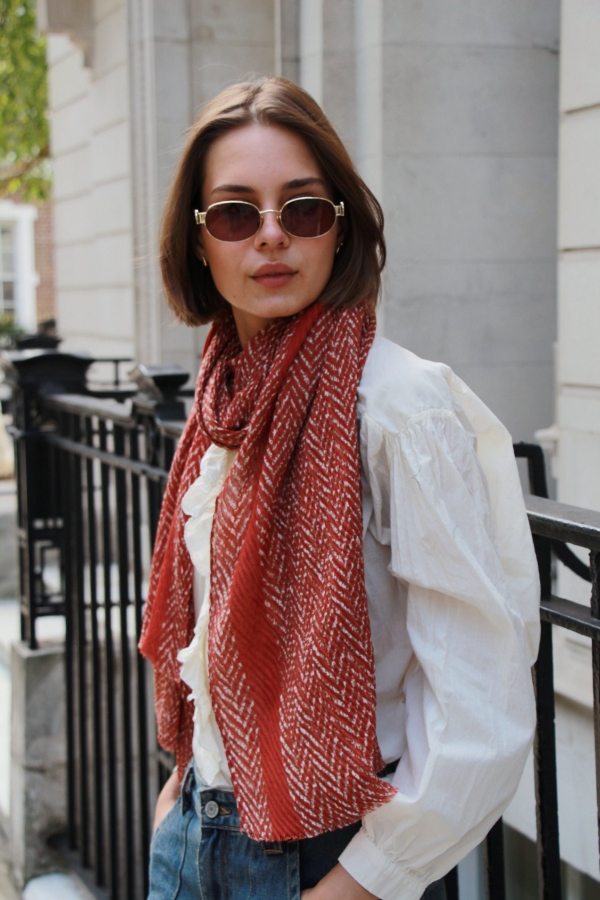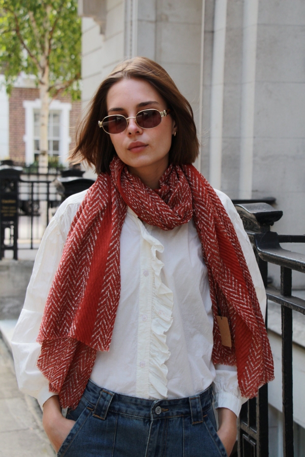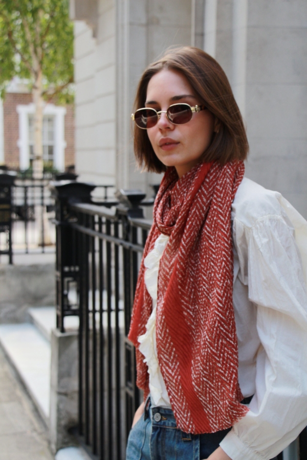 Daphne scarf is cut to a generous size so you can drape it over your shoulders or wrap it around your neck a few times. The scarf has been woven from a light blend of soft viscose. Set against a neutral backdrop, in an array of colours and has delicately frayed edges that emphasize movement. Style it wrapped loosely around your neck or draped over your shoulders.