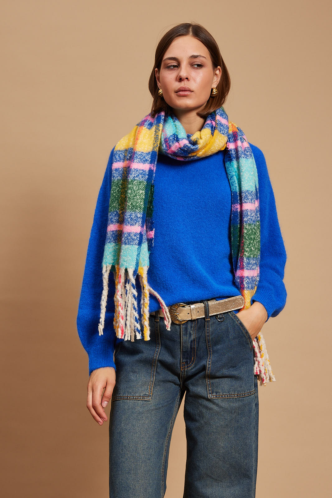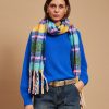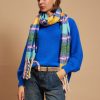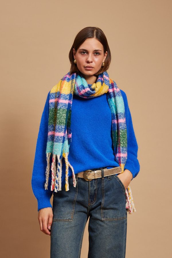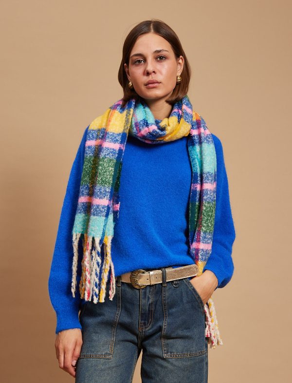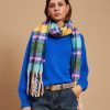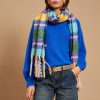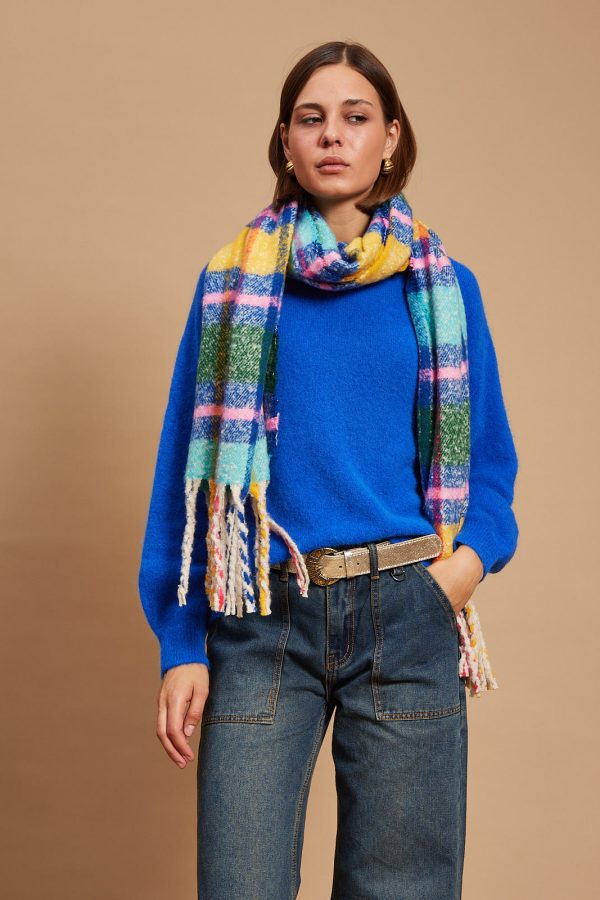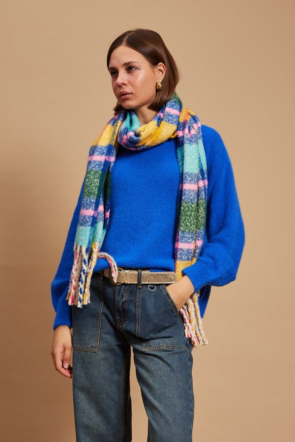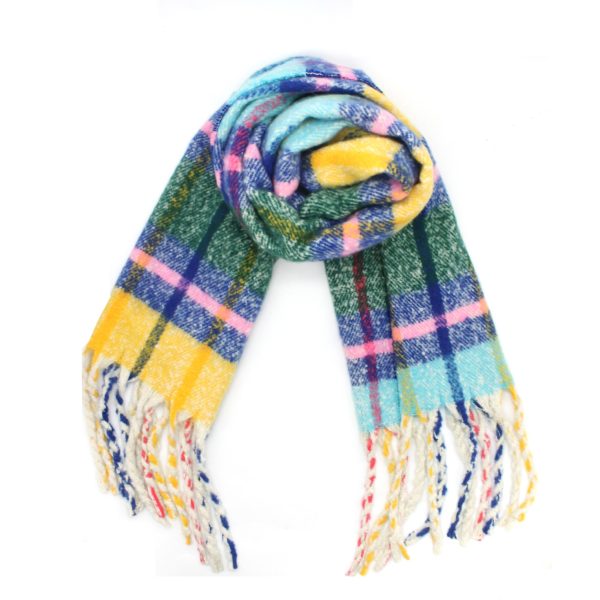 The scarf has been woven from a light blend of soft acrylic. Set against a neutral backdrop, in an array of colors and has delicately frayed edges. Style it wrapped loosely around your neck or draped over your shoulders.