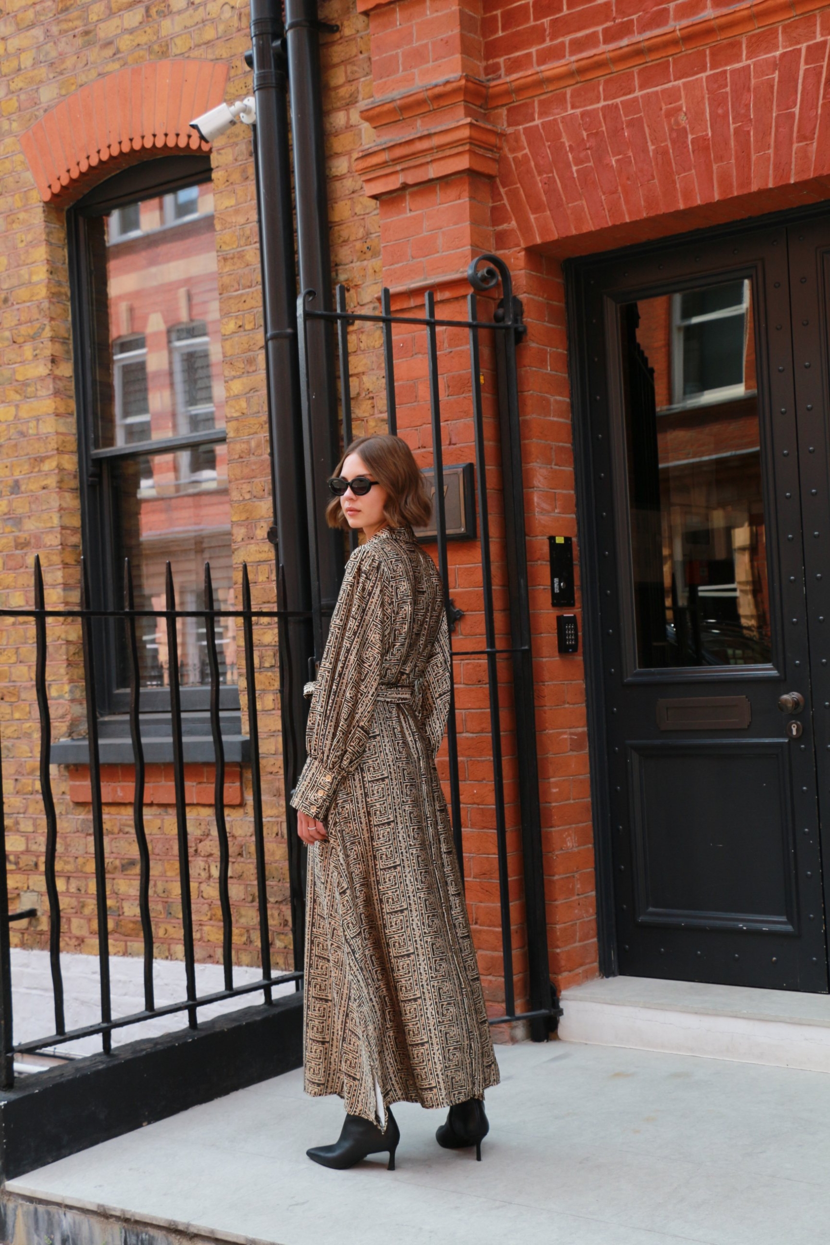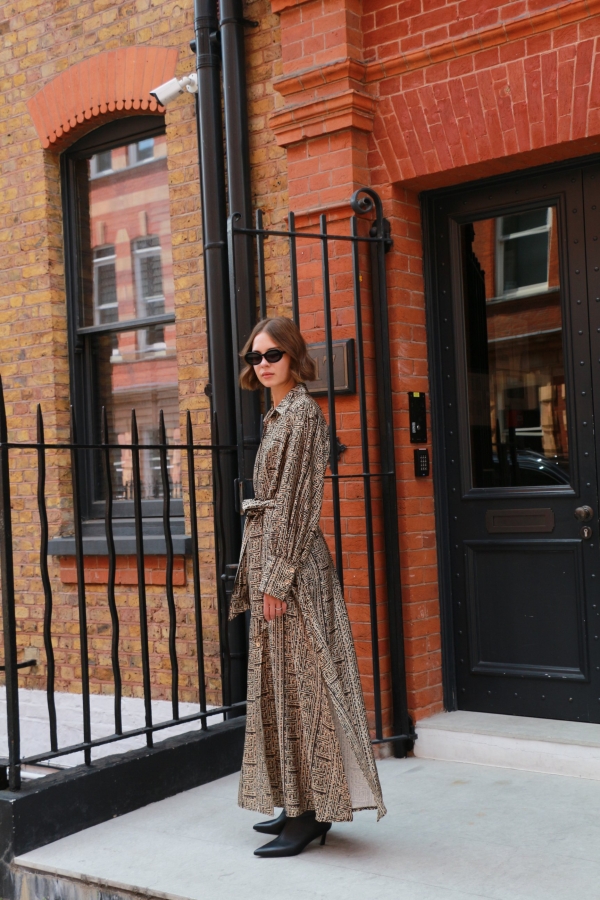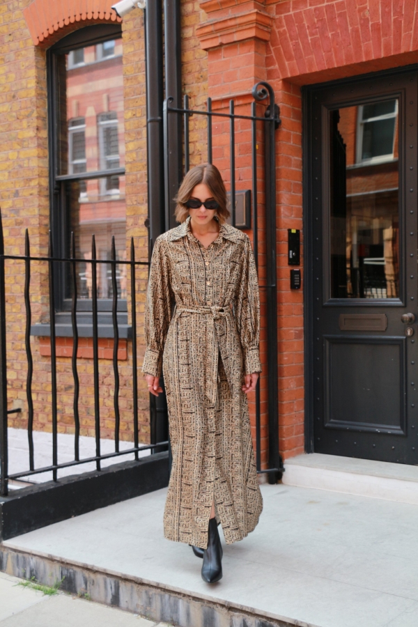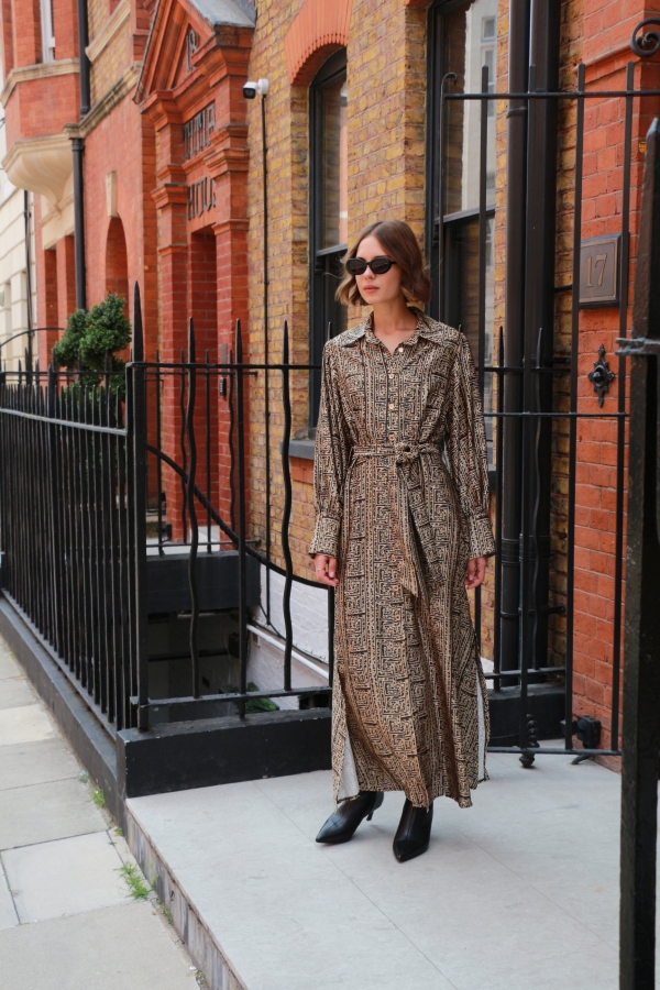 Ella shirt dress is patterned with a abstract motif inspired by retro fabrics. It has elegant blouson sleeves and a swishy, floaty hem. It’s cut from viscose that drapes effortlessly and has floaty hem. Leave the first few buttons undone for a more relaxed take. Wear yours with heels or chunky boots .