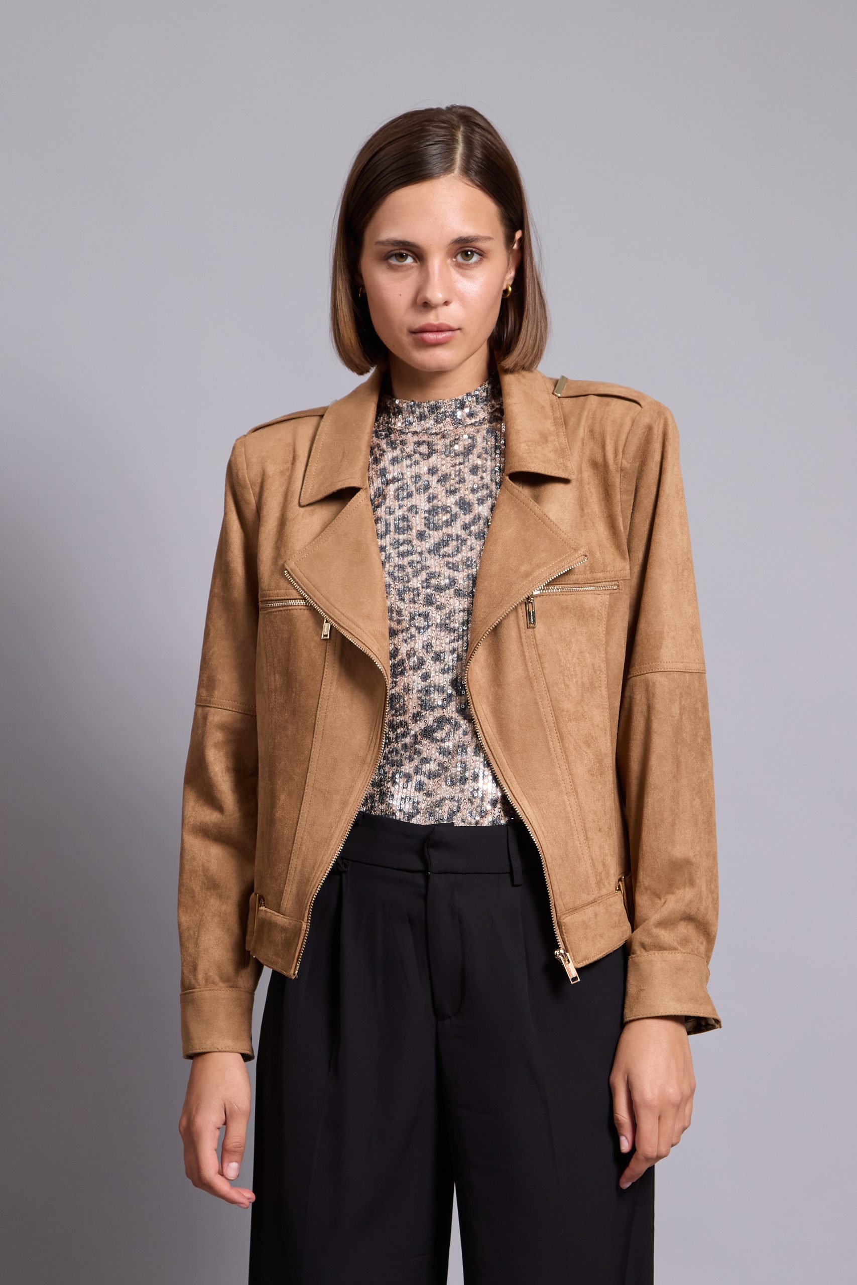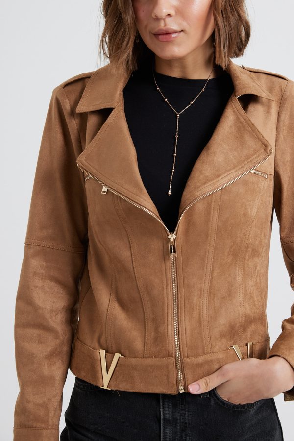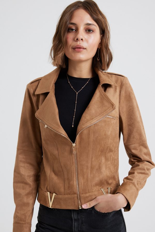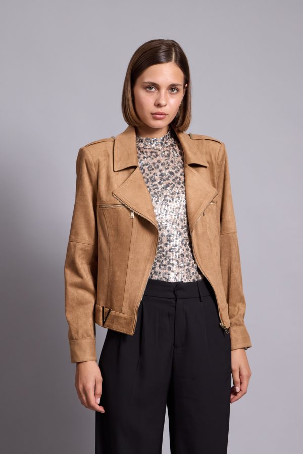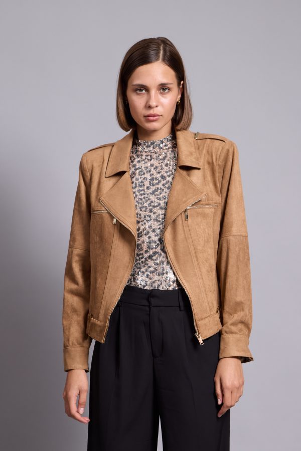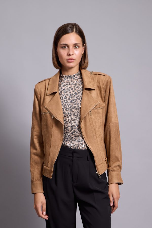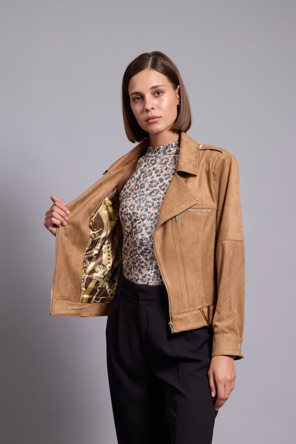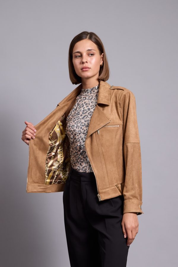 It’s made from lightly faux leather and finished with numerous zips. The satin lining ensures smooth layering over sweaters and dresses. Notice how it transforms any outfit you pair it with.
