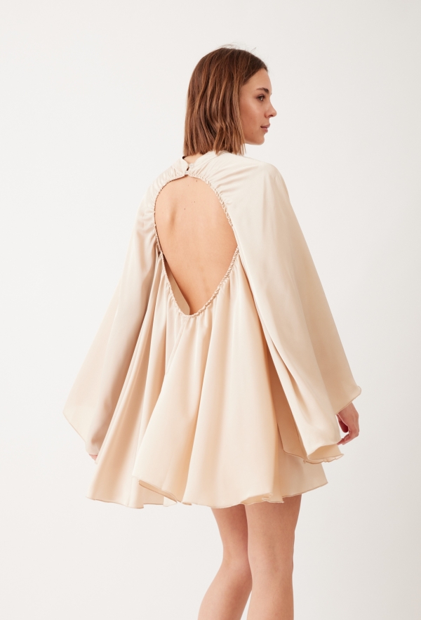 Ylondon dresses are always so striking, even when they’re simply designed. This one is cut from fluid lustrous satin in a jewel-toned colour that almost glistens. It’s detailed with cutout open back that’s artfully ruched along hips which creates a beautiful draped effect. Gala dress is cut for a loose fit and has a voluminous  flared sleeves that calls for a slightly structured equally vibrant clutch . The jewel hue will look even richer with gold jewellery .