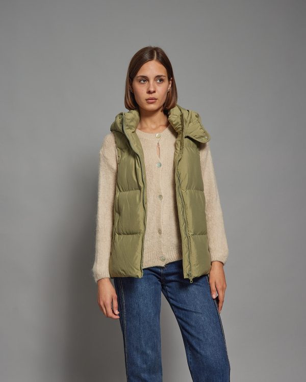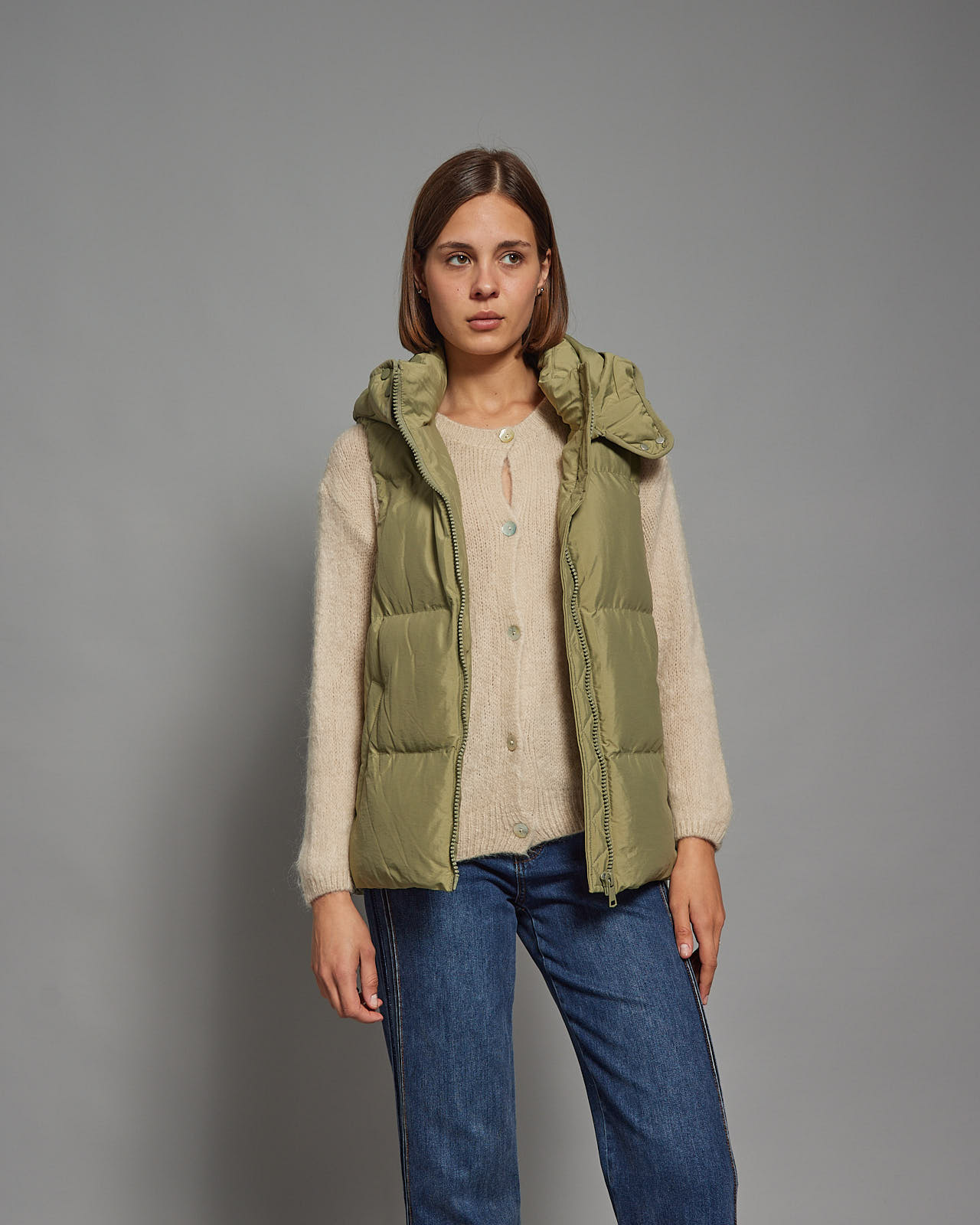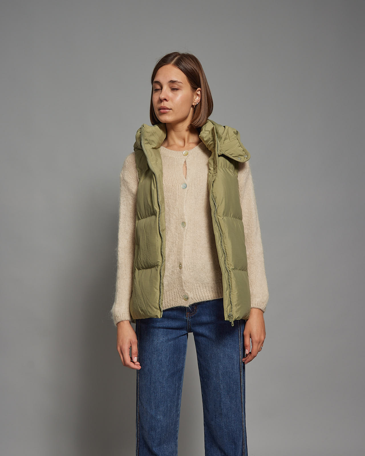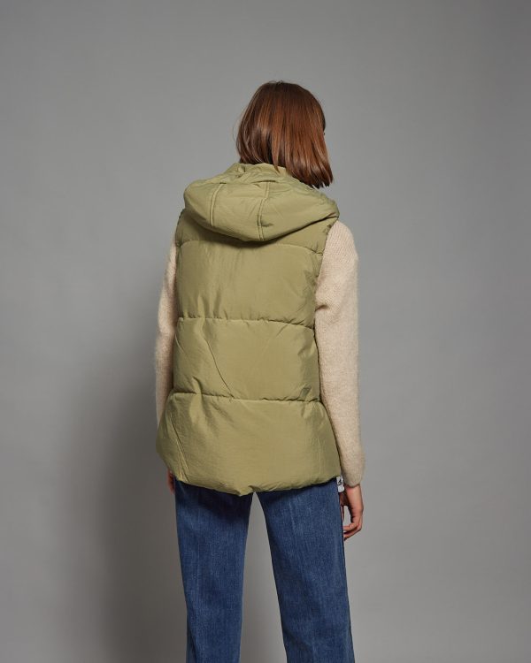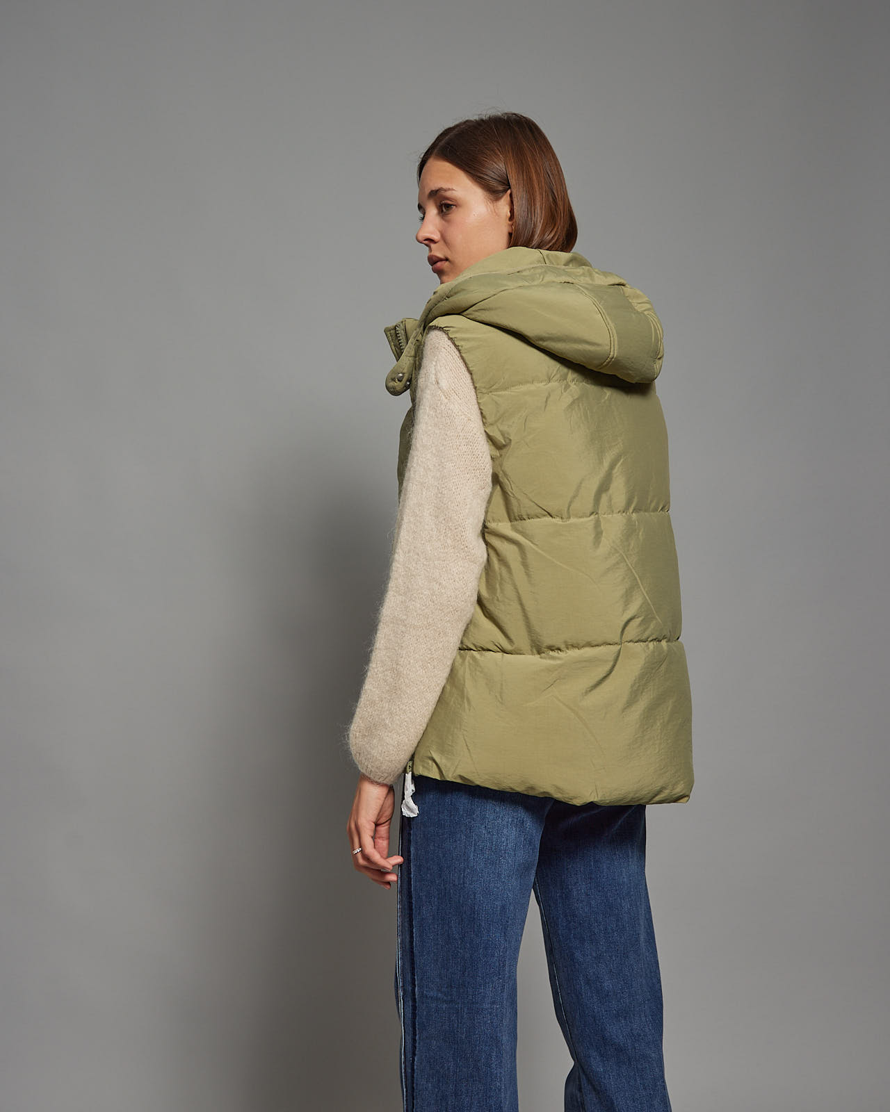 Gena gilet is cut from shell that’s quilted and padded . The roomy hood can be drawn in for added protection against the elements. Padded for insulation, it has a relaxed silhouette with a hood .