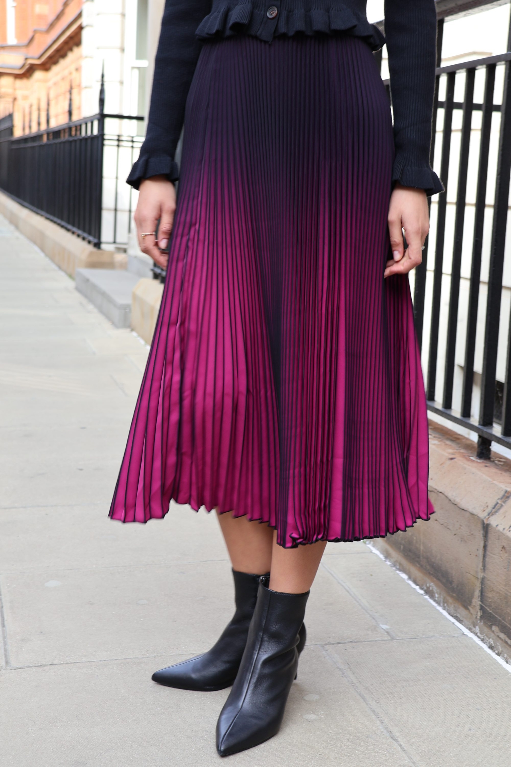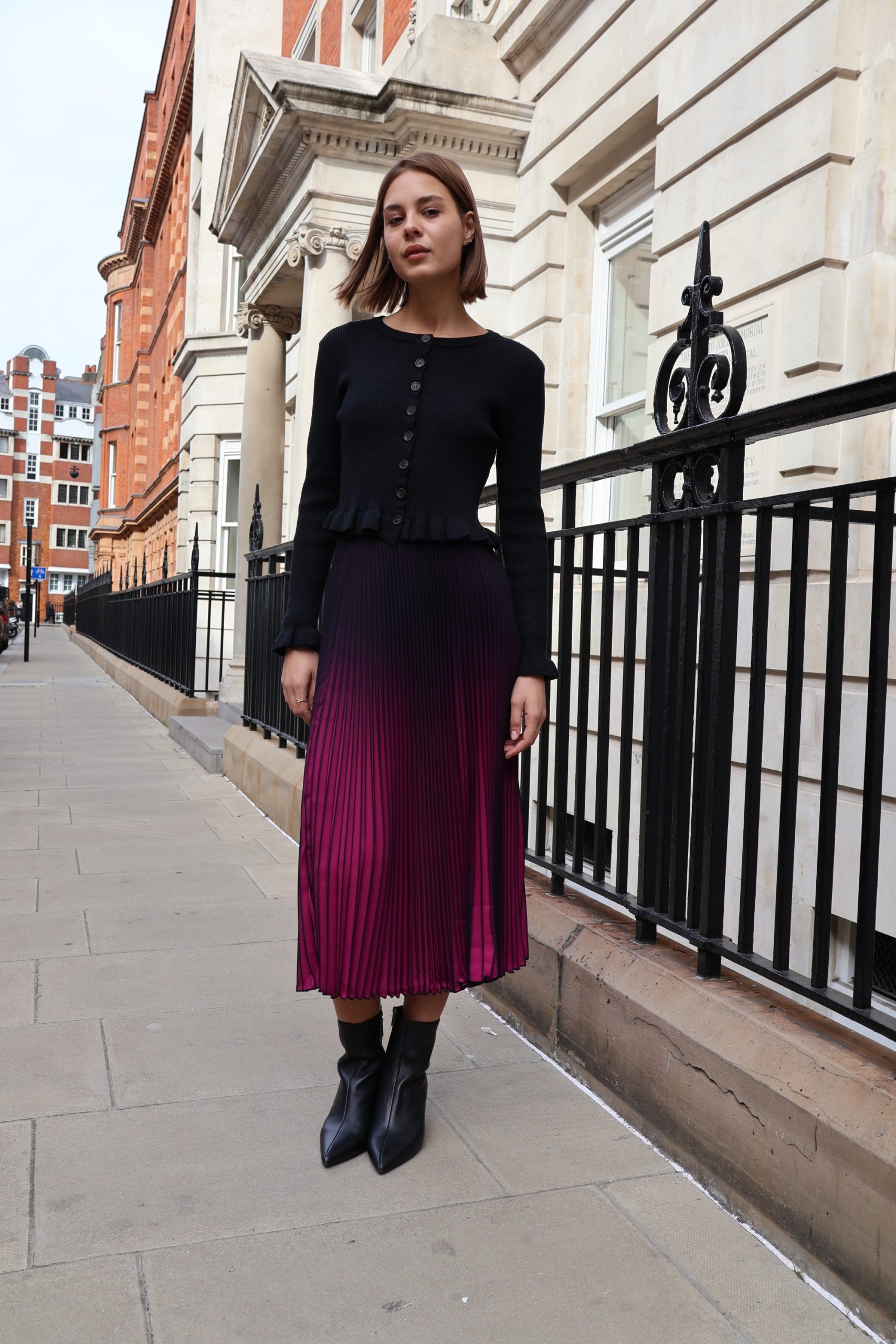 Gena skirt is made with intricate sunray pleats that create beautiful texture and movement. Cut from lightweight shell, it has an elasticated high-rise waist and classic A-line shape. It has rows of precise pleats that move beautifully. Style it with a sweater or cropped top.