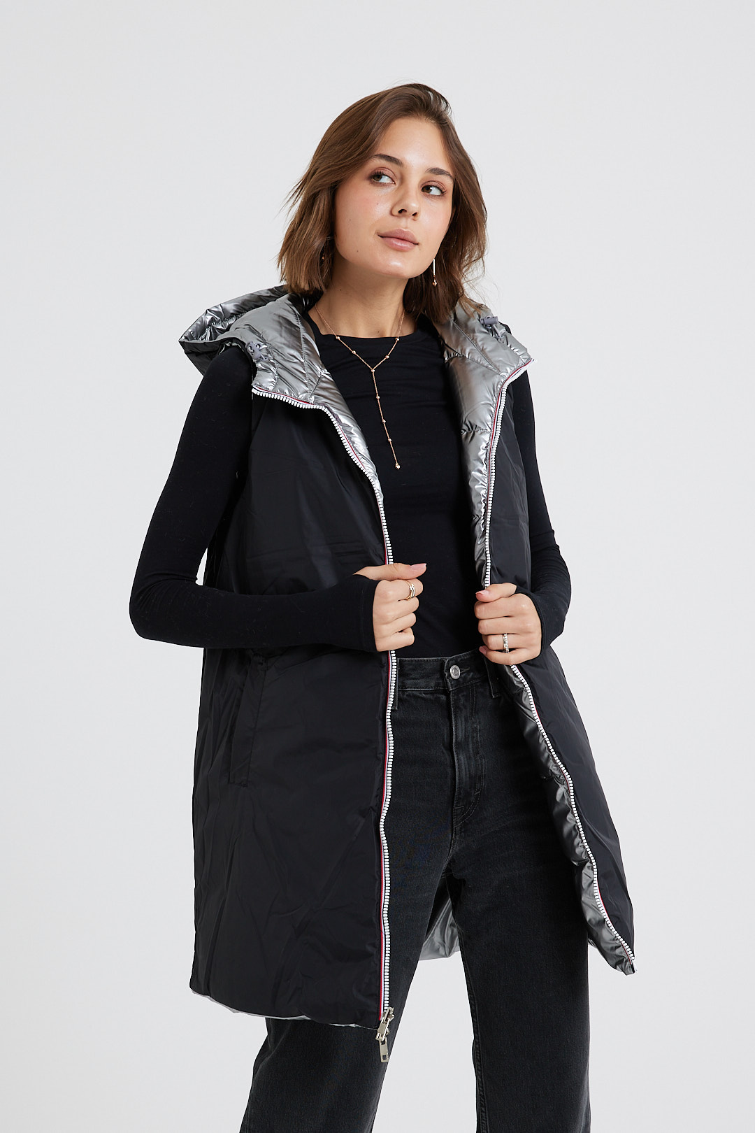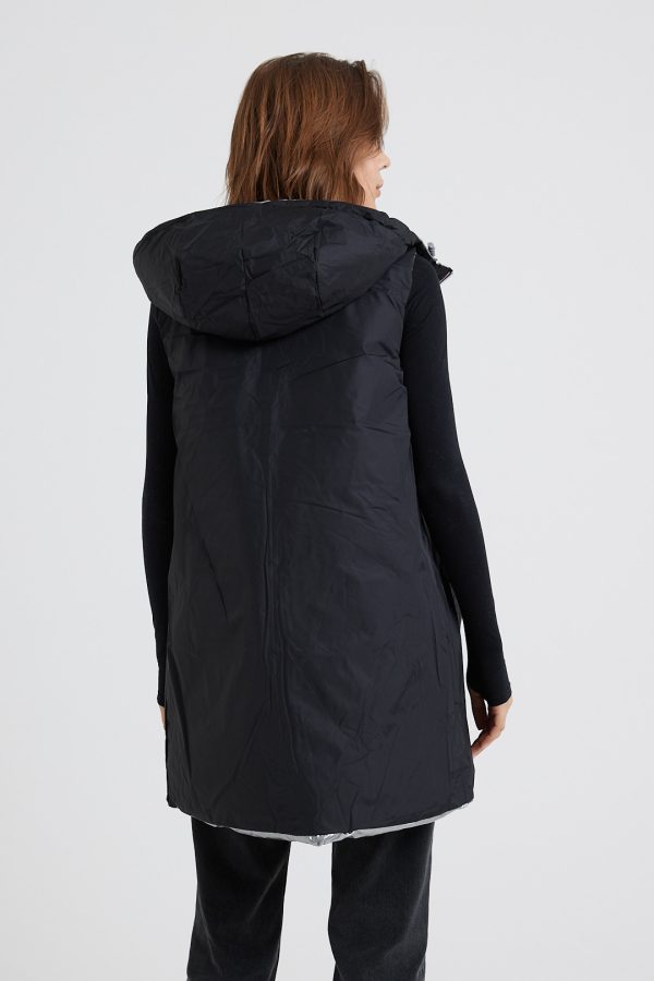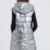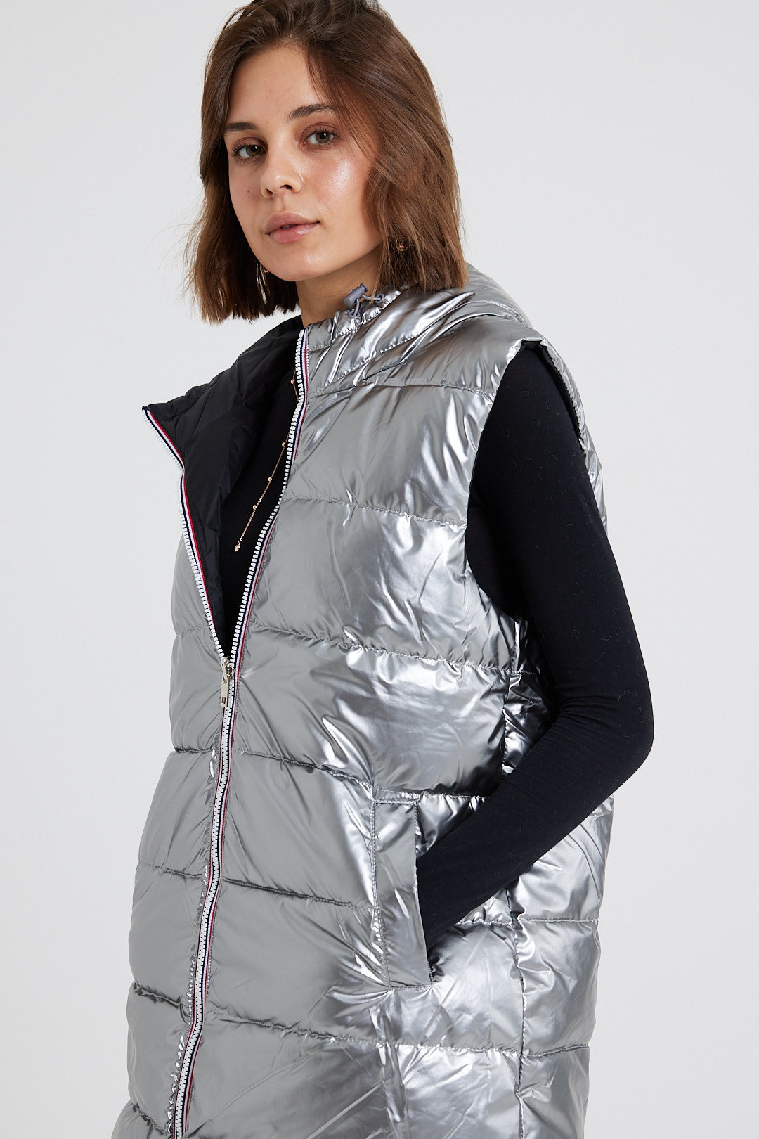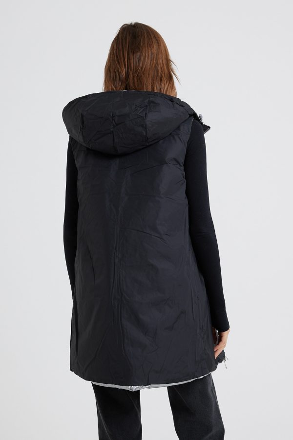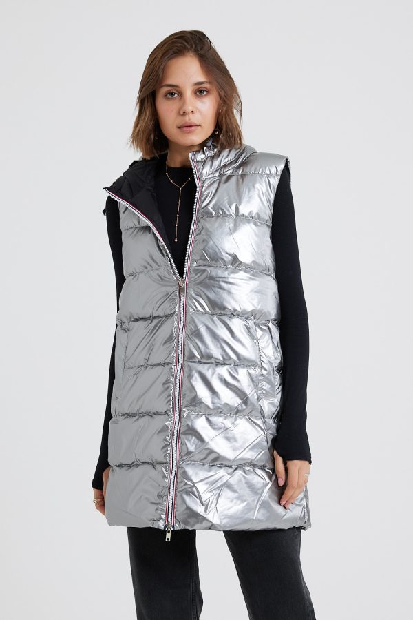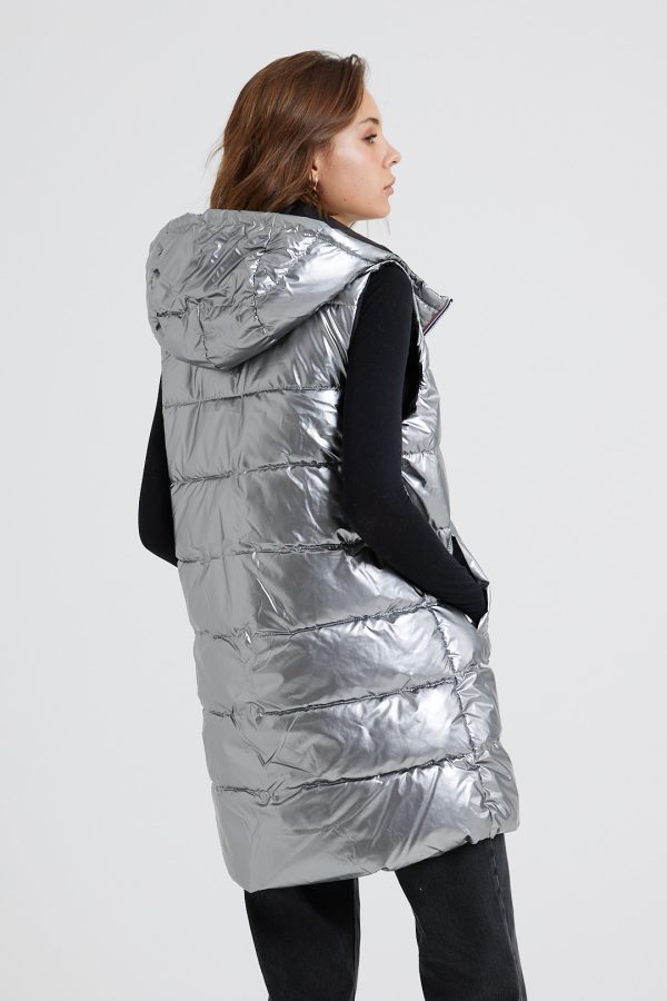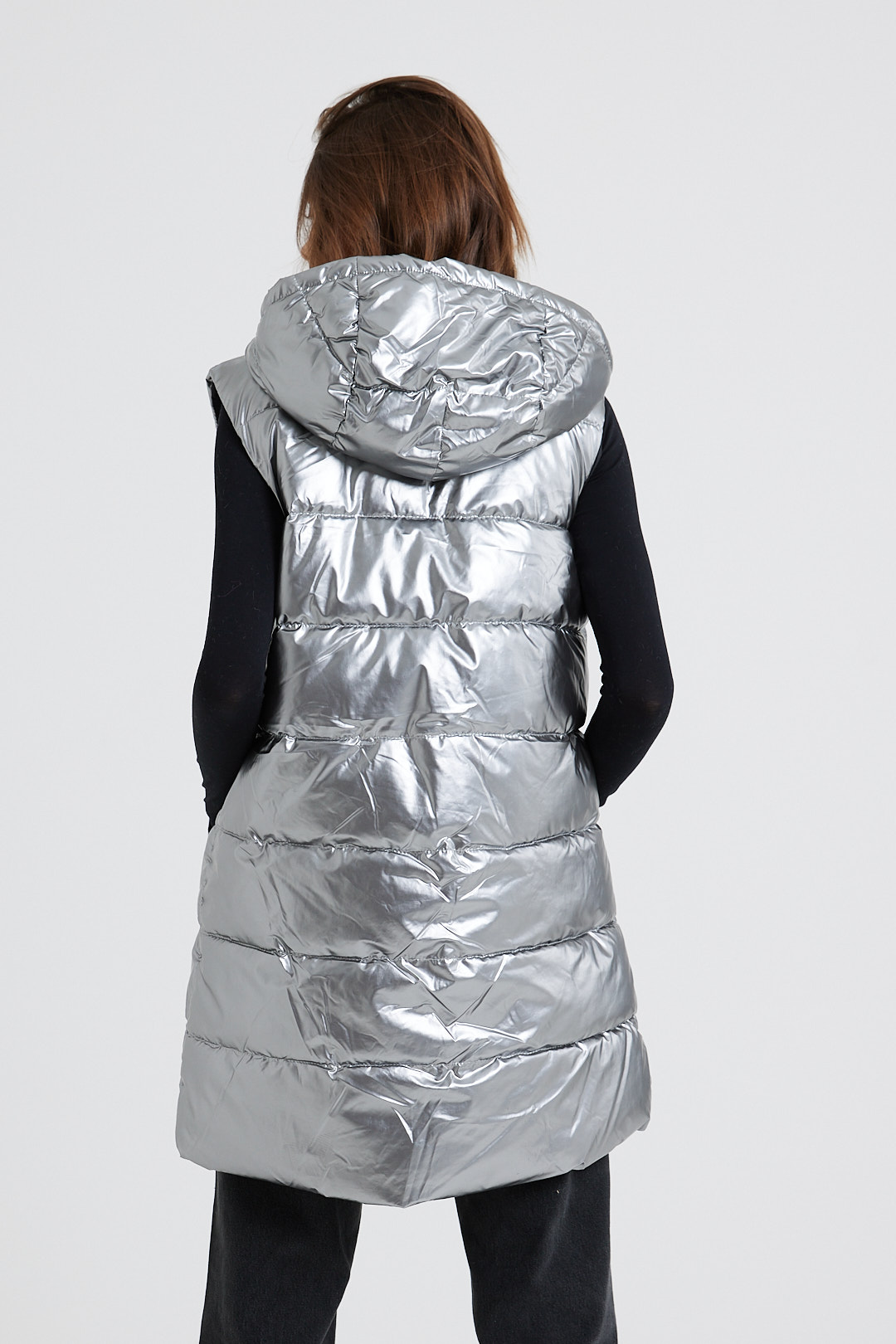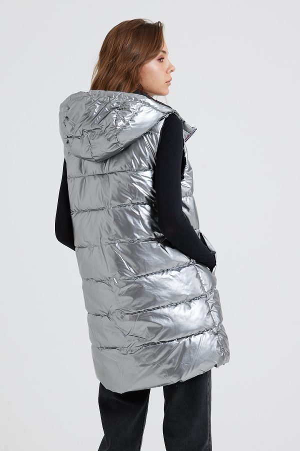 Genna gilet is cut from lightweight shell with a weather-resistant glossy gold finish and padded for warmth. The roomy hood can be drawn in for added protection against the elements. Padded for insulation, it has a relaxed, longline silhouette with a detachable hood .Wear yours during transitional weather, layering it with slim sweaters or overcoats.