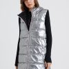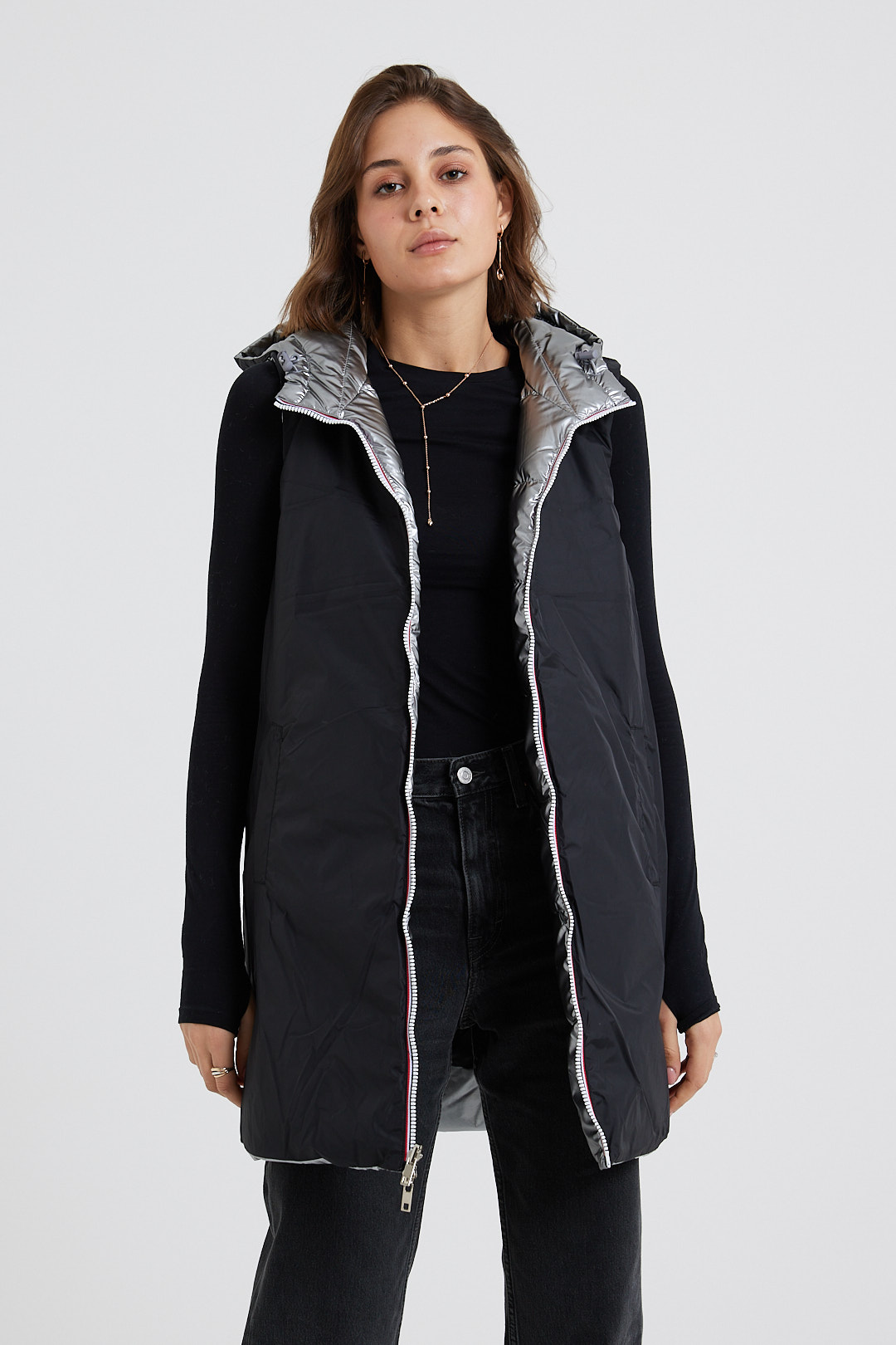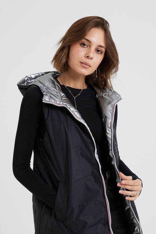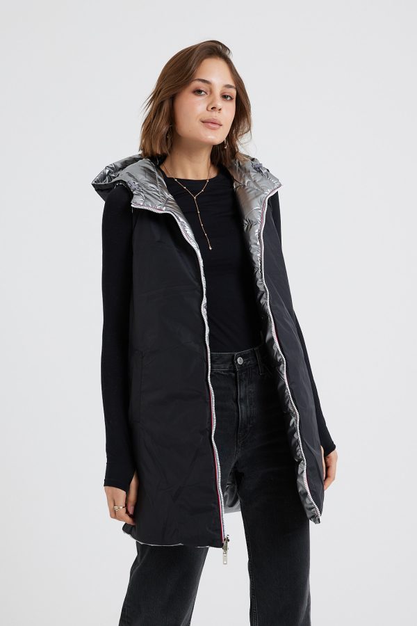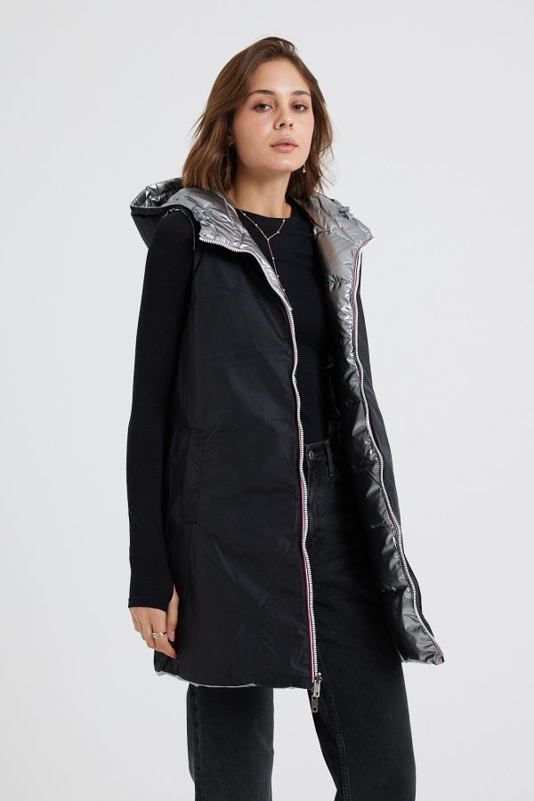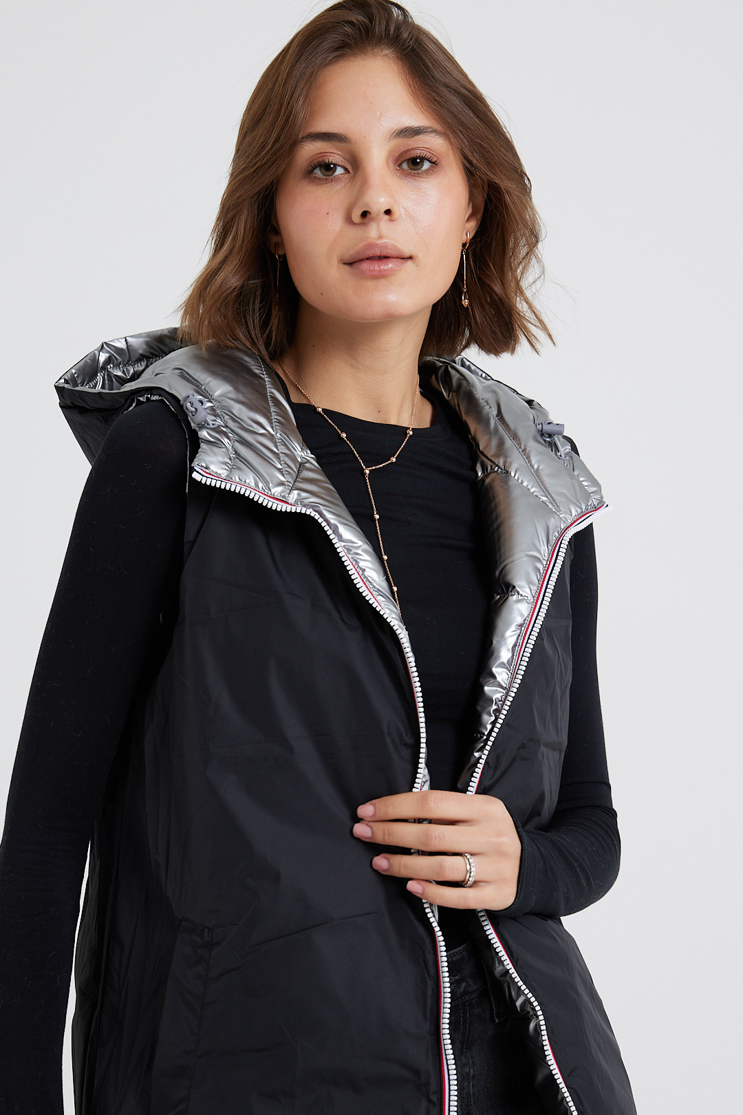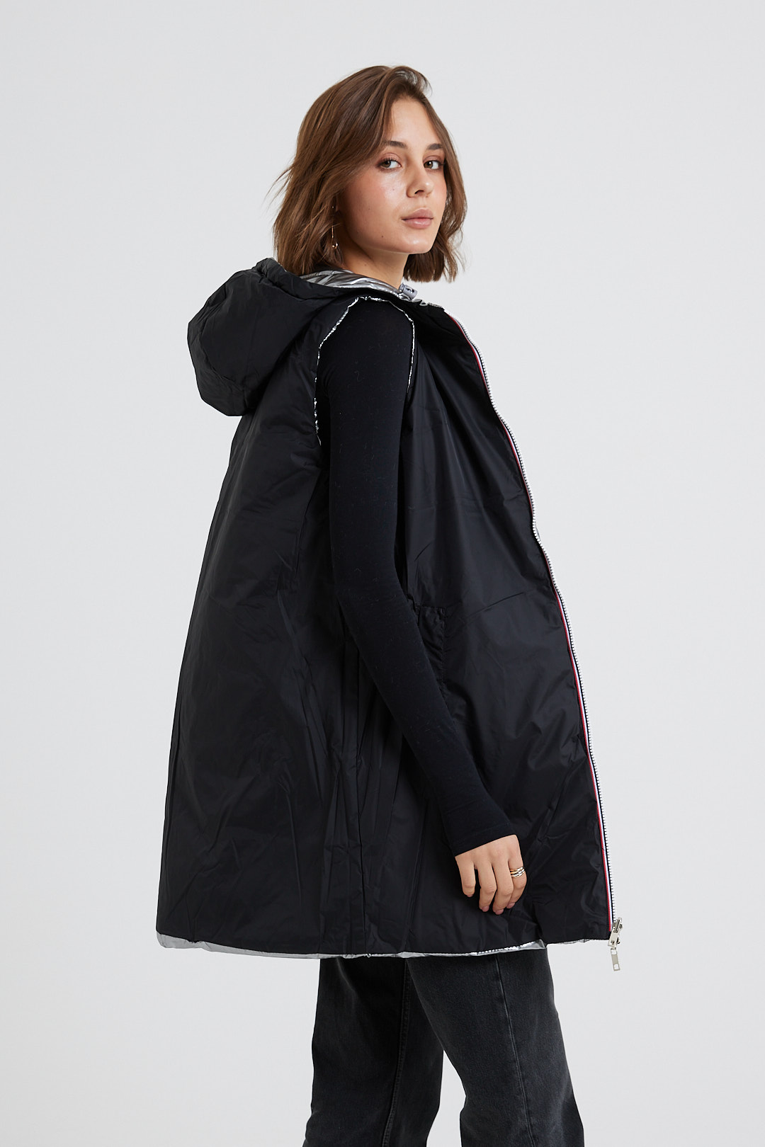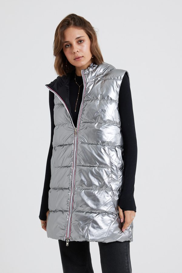 Genna gilet is cut from lightweight shell with a weather-resistant glossy gold finish and padded for warmth. The roomy hood can be drawn in for added protection against the elements. Padded for insulation, it has a relaxed, longline silhouette with a detachable hood .Wear yours during transitional weather, layering it with slim sweaters or overcoats.