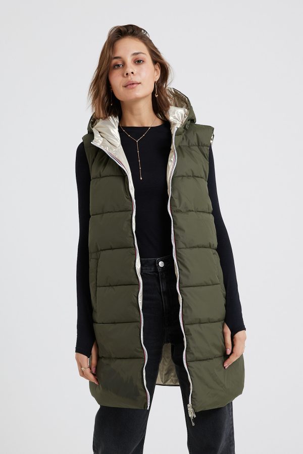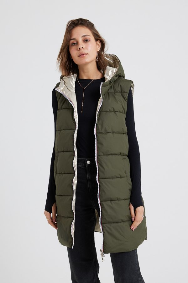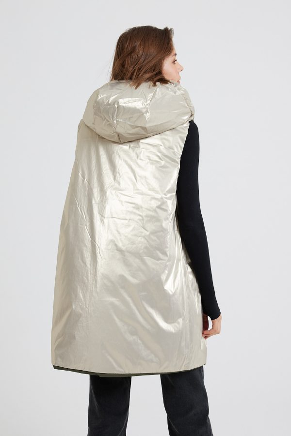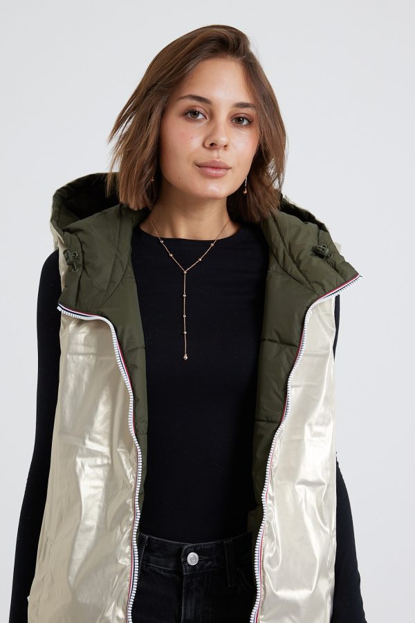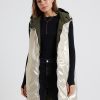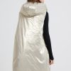 Genna gilet is cut from lightweight shell with a weather-resistant glossy gold finish and padded for warmth. The roomy hood can be drawn in for added protection against the elements. Padded for insulation, it has a relaxed, longline silhouette with a detachable hood .Wear yours during transitional weather, layering it with slim sweaters or overcoats.
