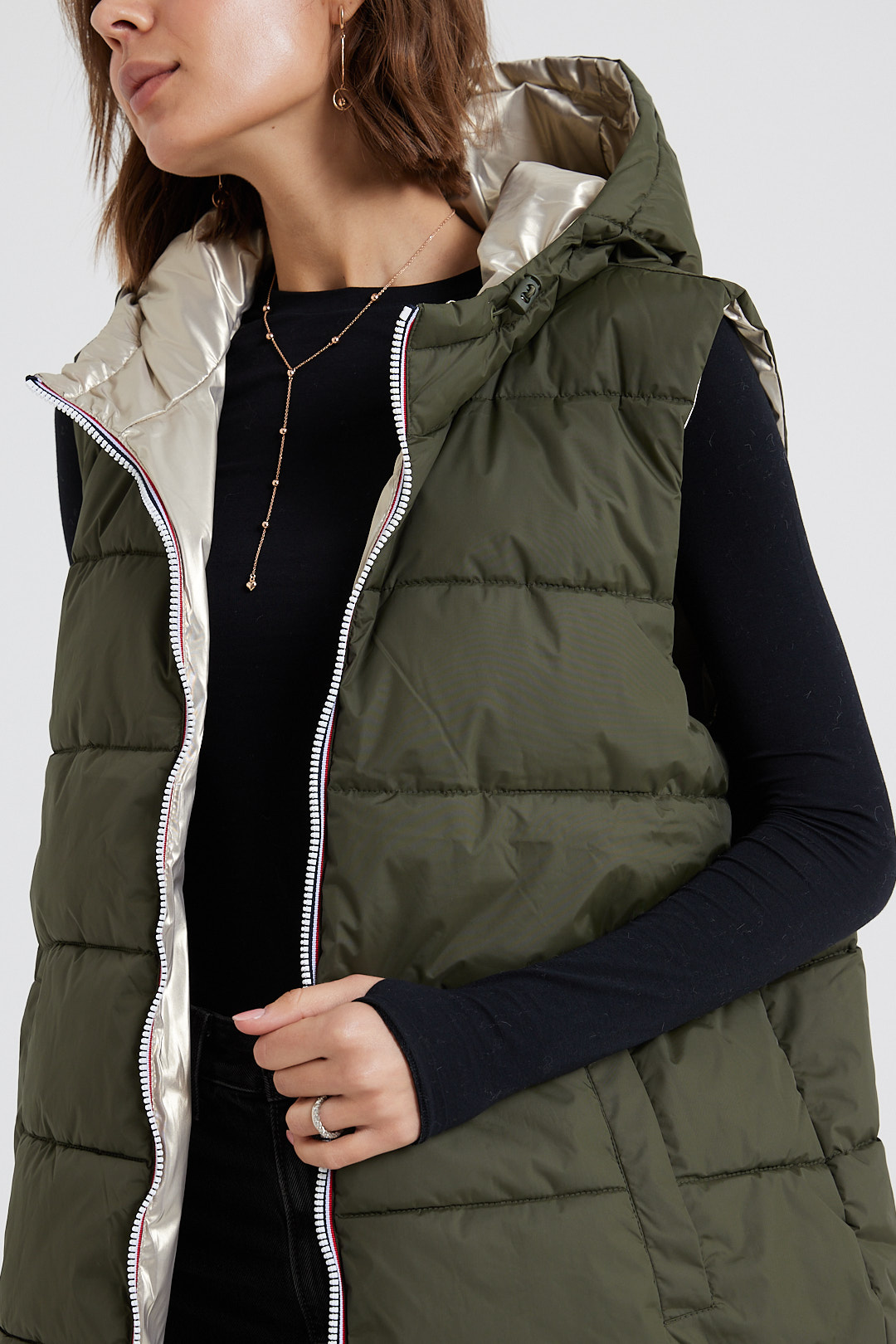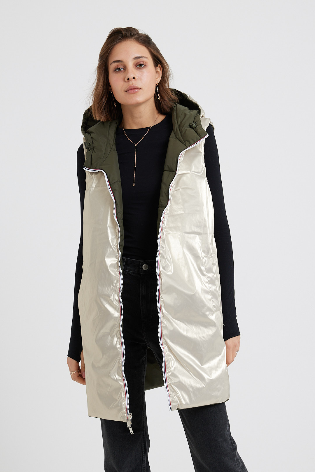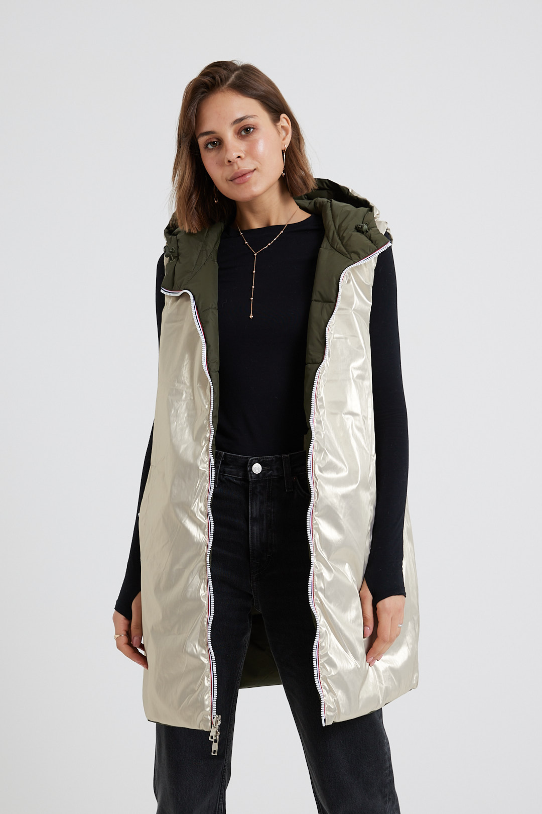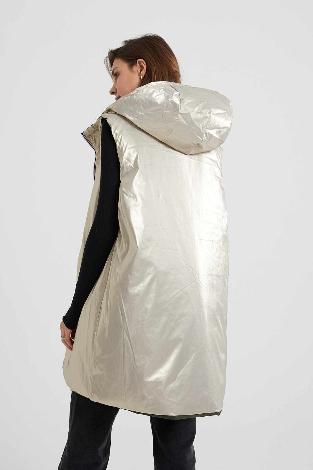 Genna gilet is cut from lightweight shell with a weather-resistant glossy gold finish and padded for warmth. The roomy hood can be drawn in for added protection against the elements. Padded for insulation, it has a relaxed, longline silhouette with a detachable hood .Wear yours during transitional weather, layering it with slim sweaters or overcoats.