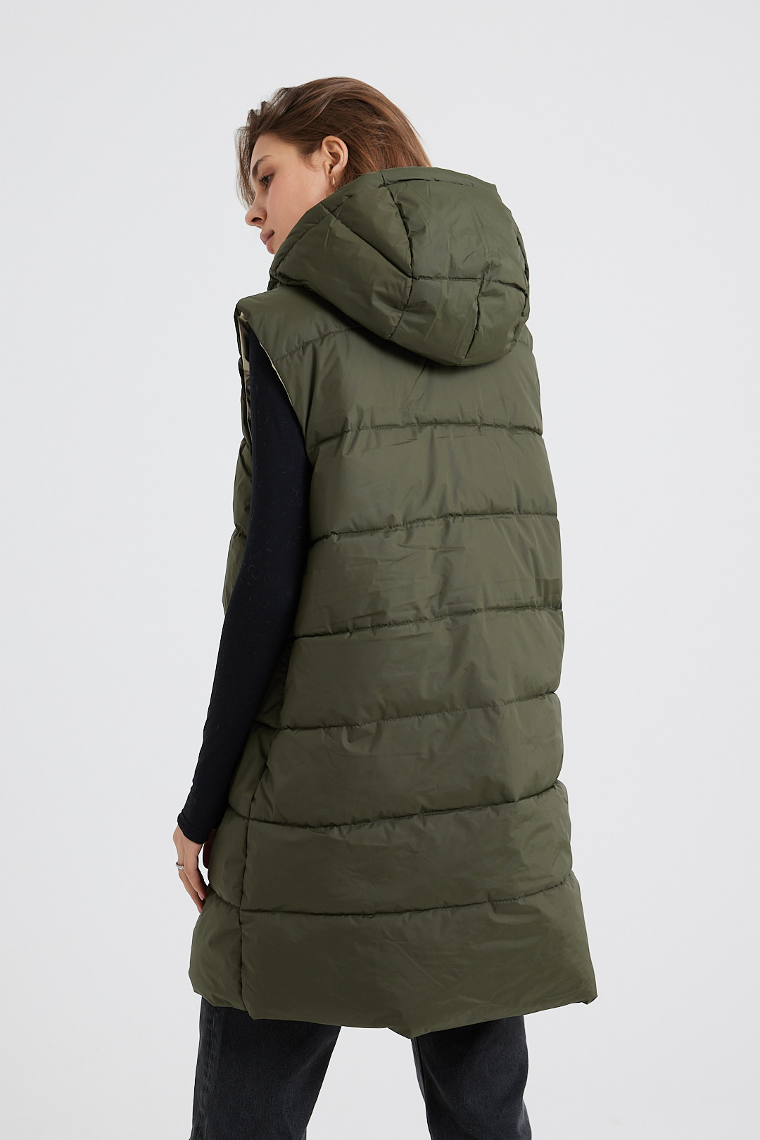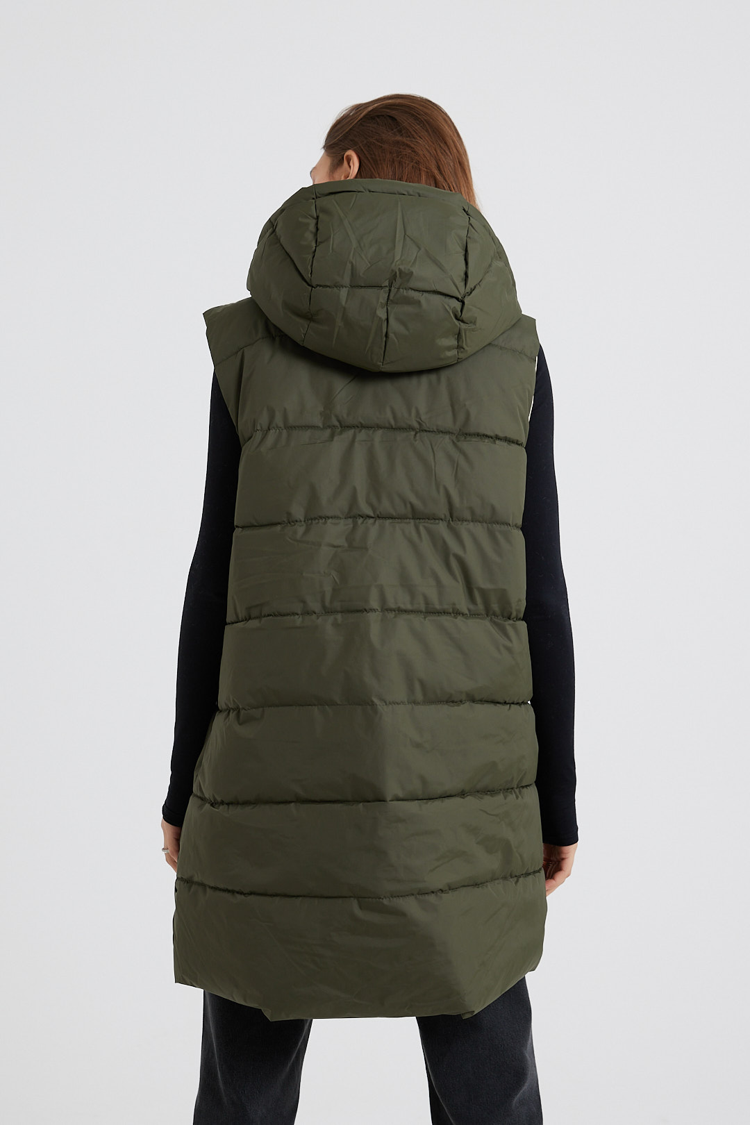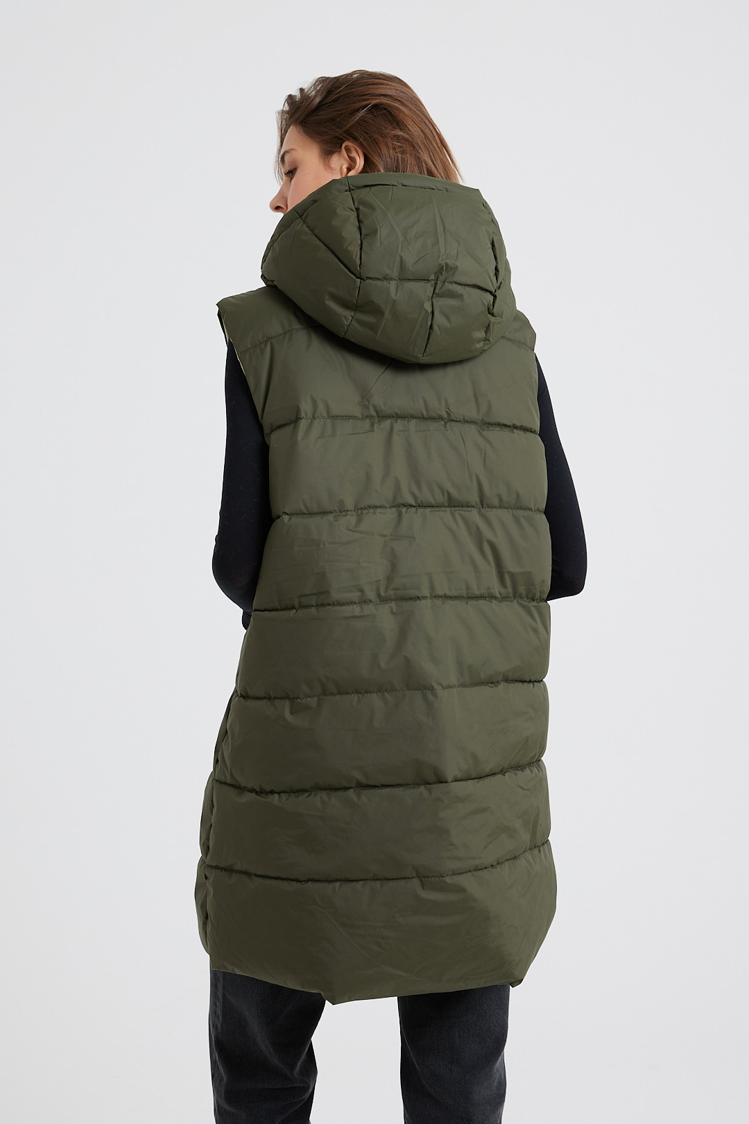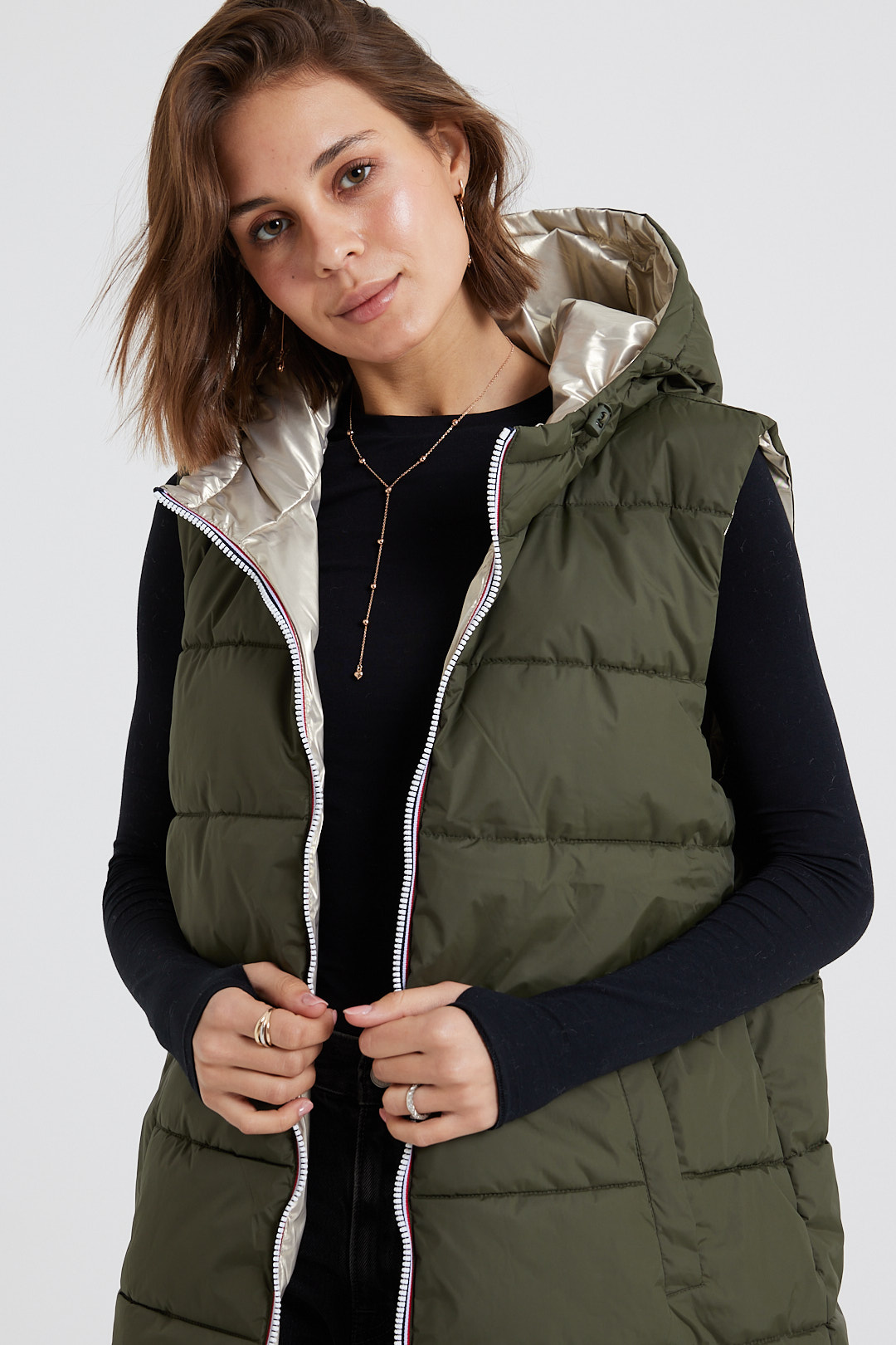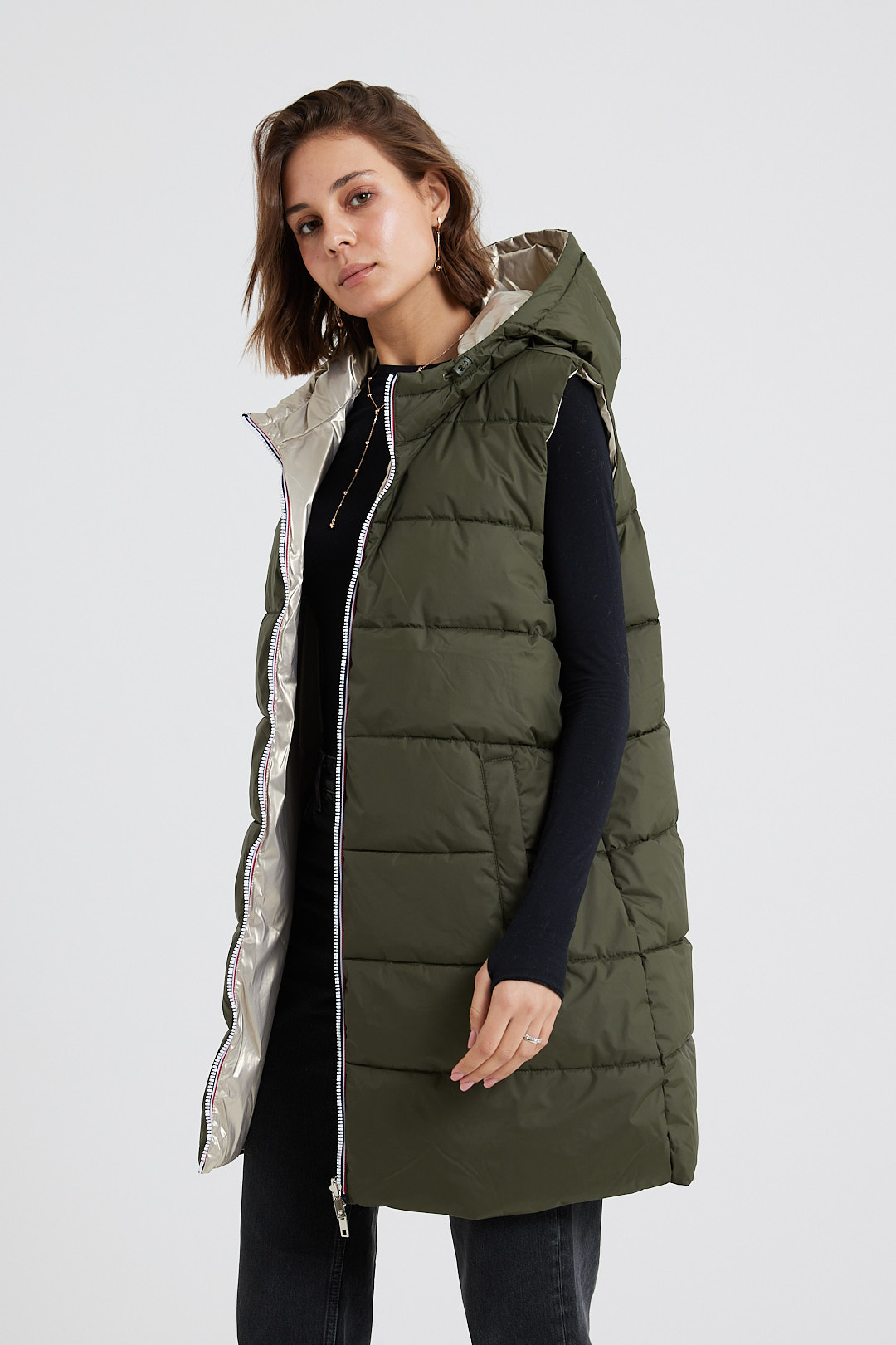 Genna gilet is cut from lightweight shell with a weather-resistant glossy gold finish and padded for warmth. The roomy hood can be drawn in for added protection against the elements. Padded for insulation, it has a relaxed, longline silhouette with a detachable hood .Wear yours during transitional weather, layering it with slim sweaters or overcoats.