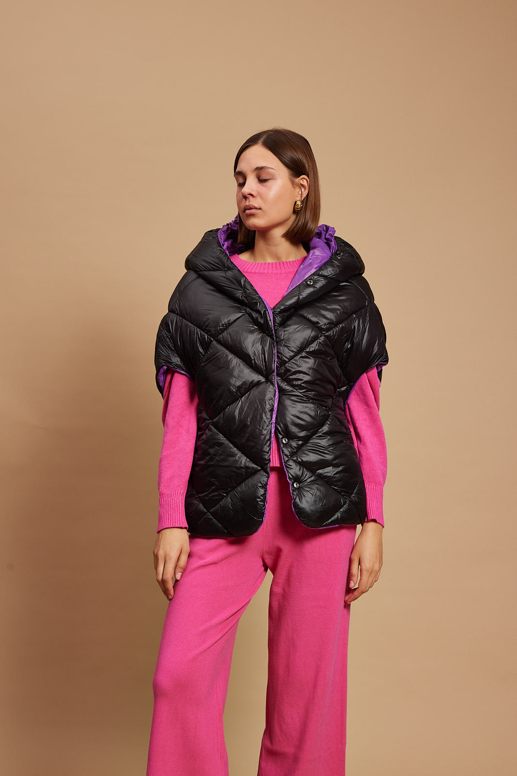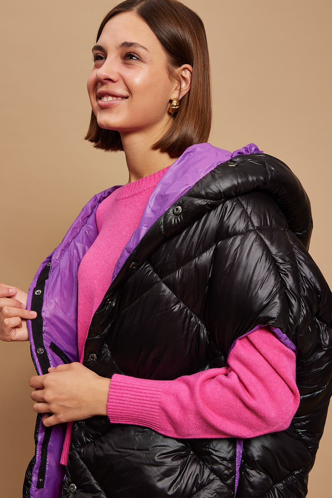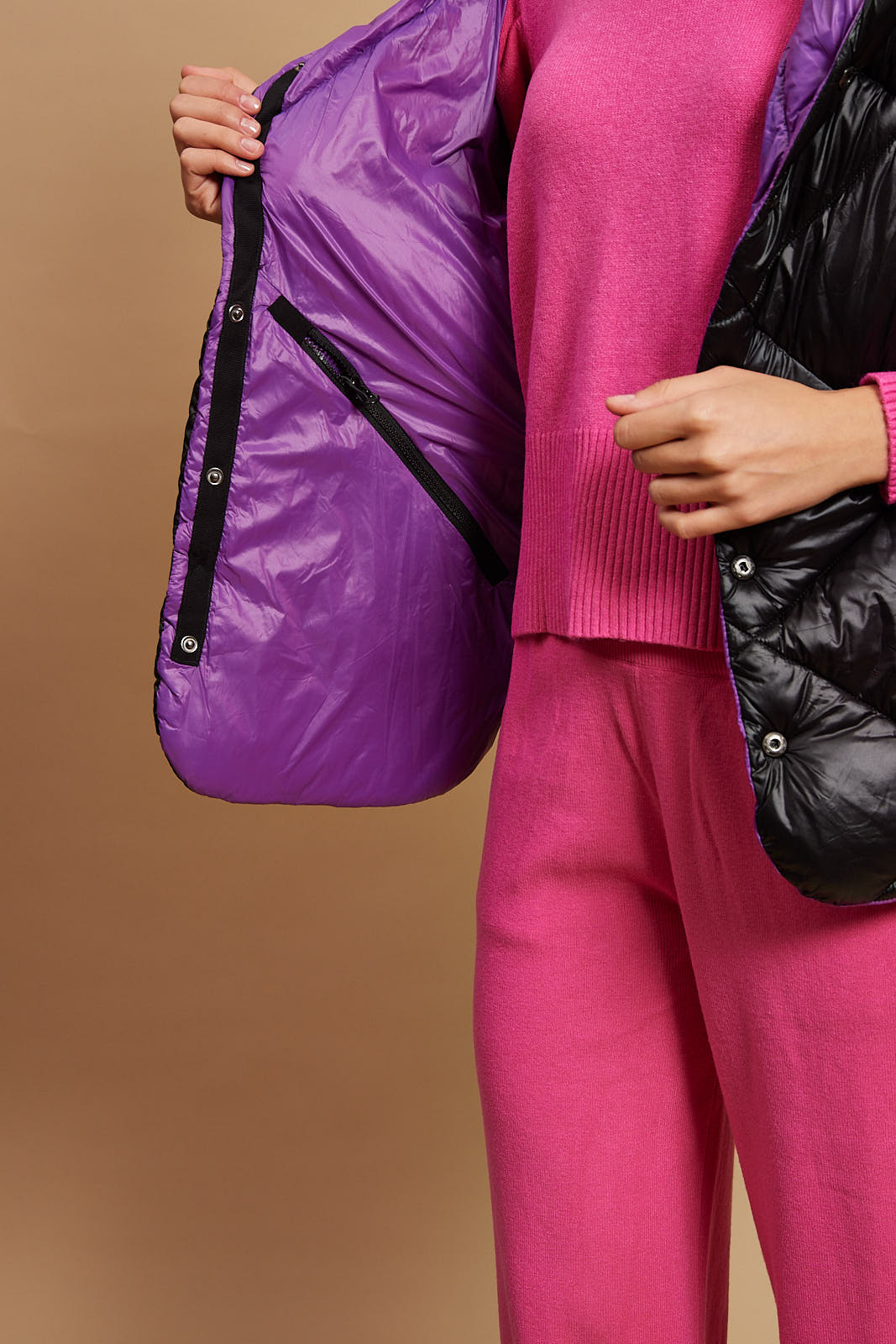 Georgia quilted gilet is reversible, so you can wear it whichever way best matches your outfit. It is cut from lightweight shell with a weather-resistant glossy black and purple finish and padded for warmth. The roomy hood can be drawn in for added protection against the elements. Wear yours during transitional weather, layering it with slim sweaters or overcoats.