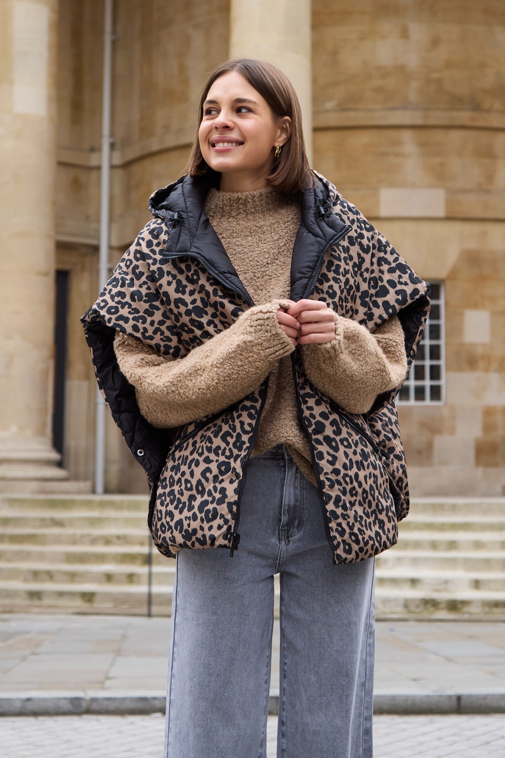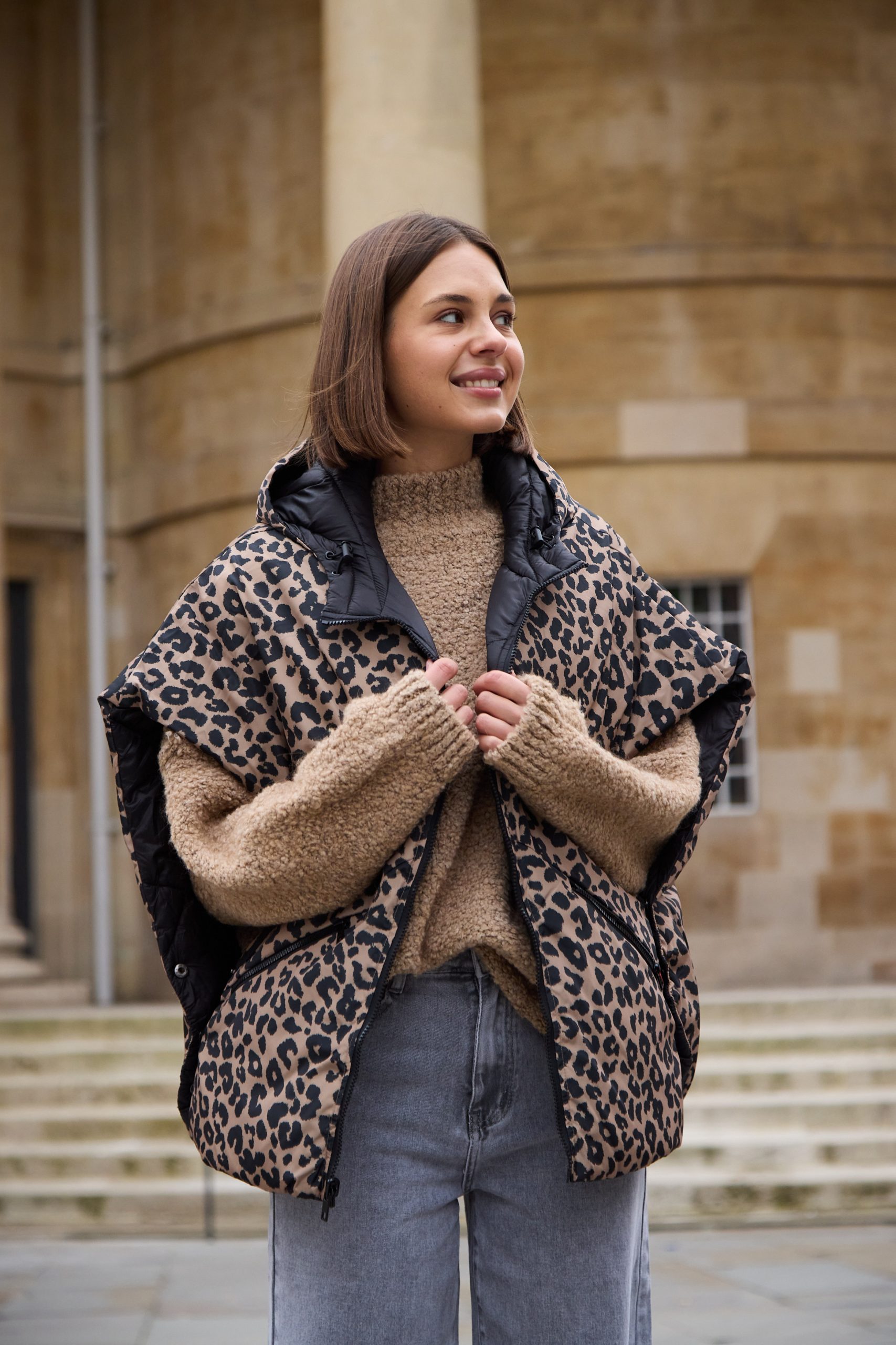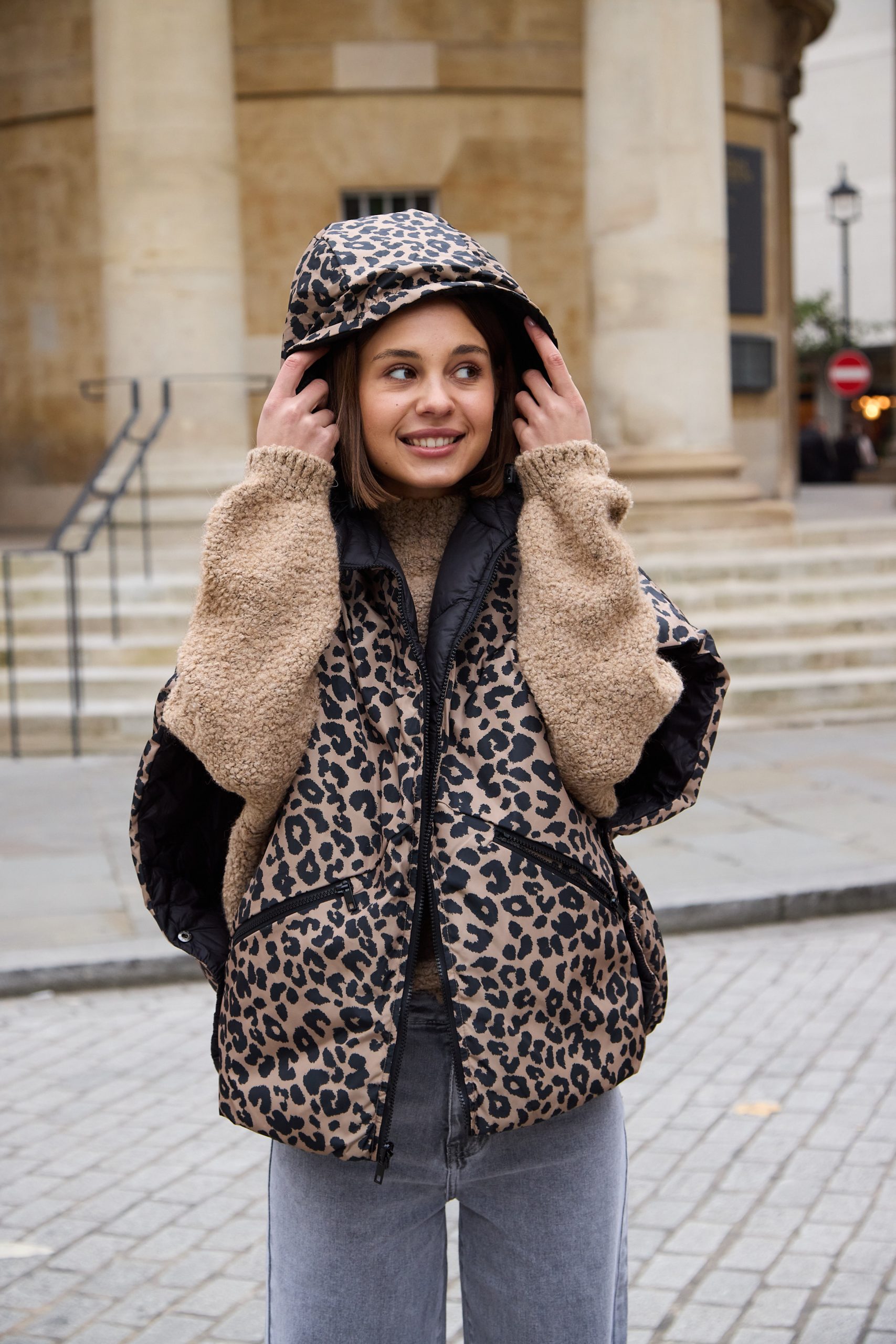 Georgina quilted gilet is reversible, so you can wear it whichever way best matches your outfit. It is cut from lightweight shell with a weather-resistant glossy black and leopard finish and padded for warmth. The roomy hood can be drawn in for added protection against the elements. Wear yours during transitional weather, layering it with slim sweaters or overcoats.