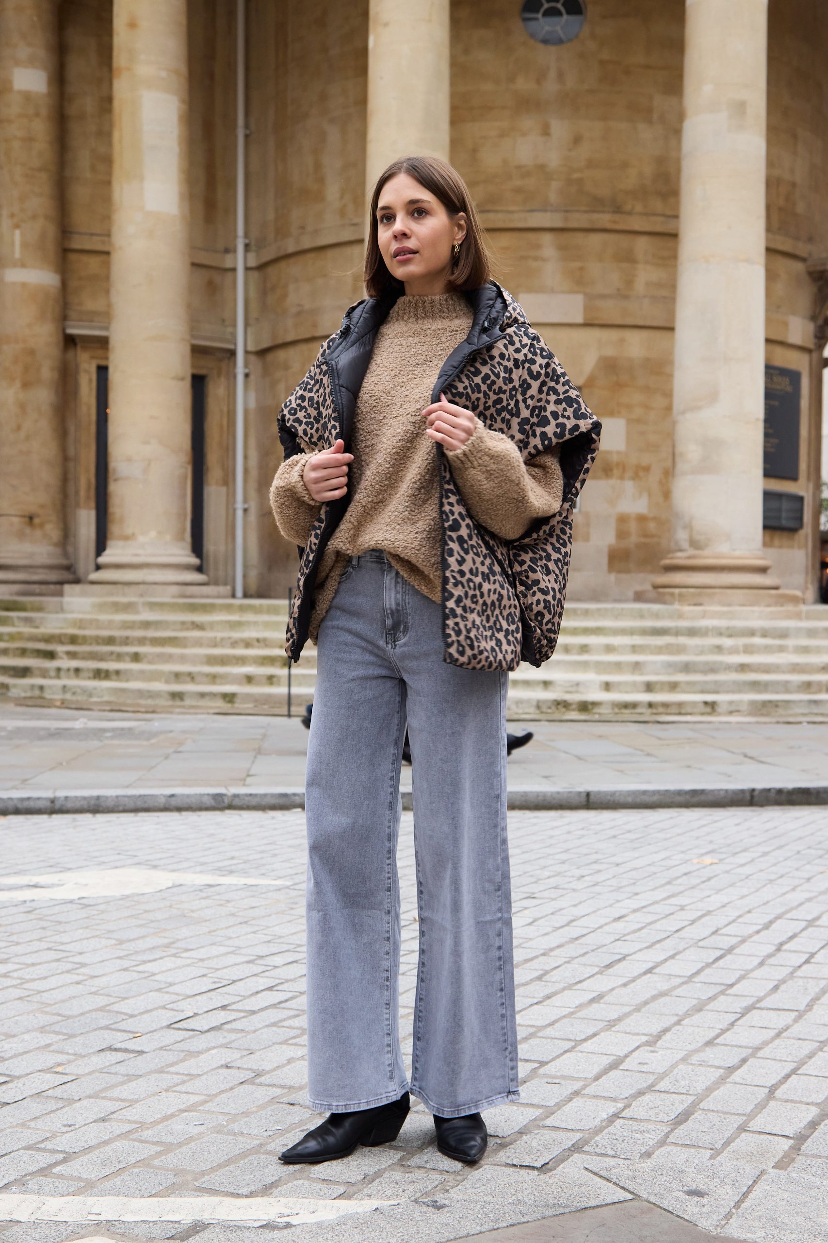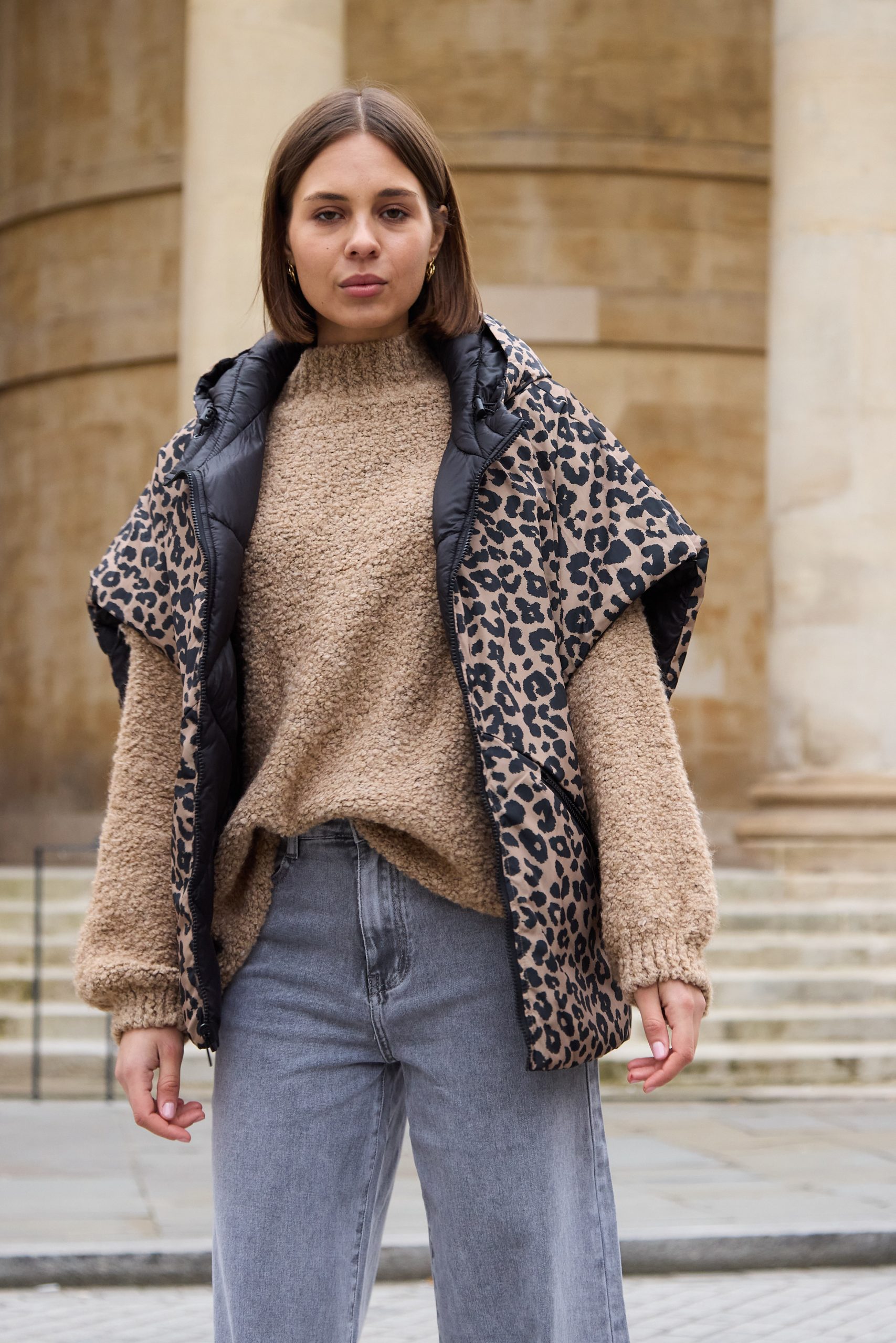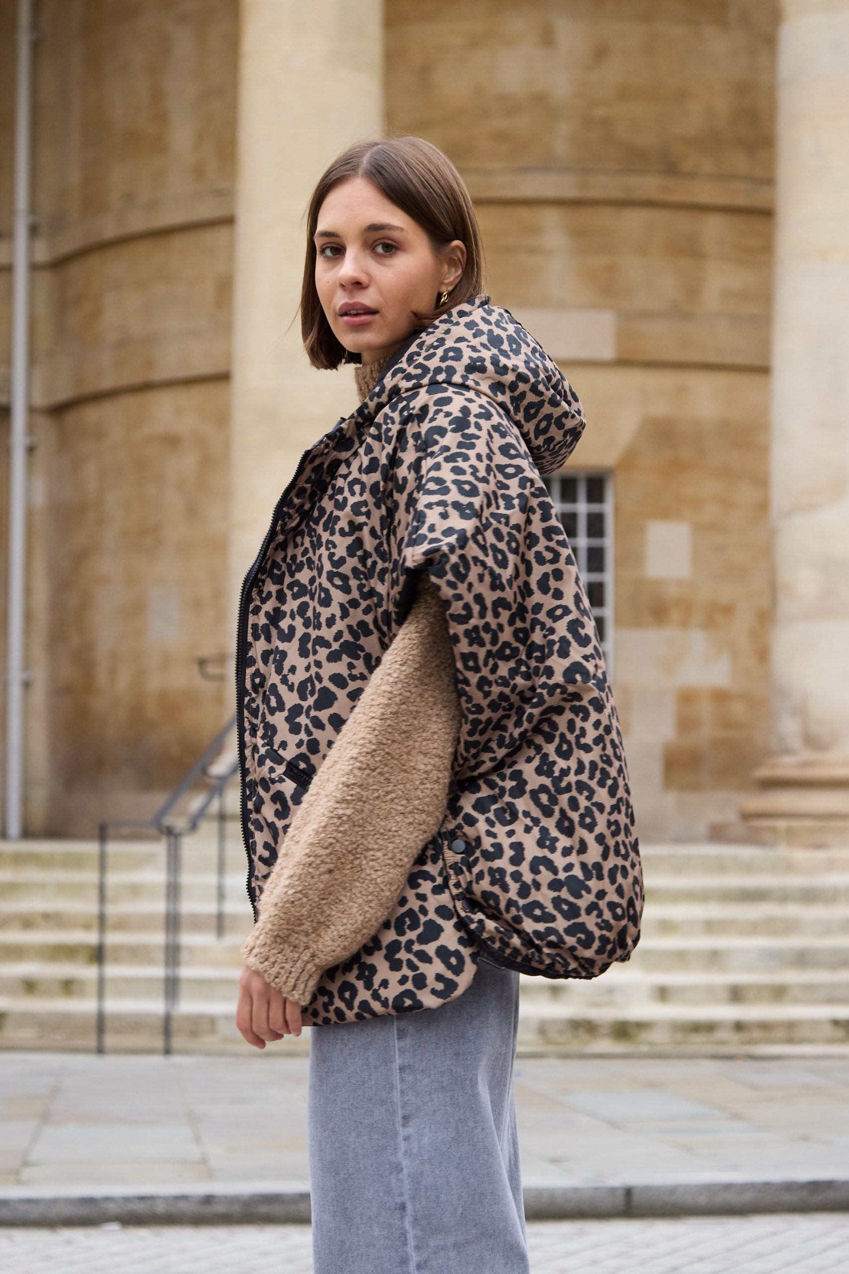 Georgina quilted gilet is reversible, so you can wear it whichever way best matches your outfit. It is cut from lightweight shell with a weather-resistant glossy black and leopard finish and padded for warmth. The roomy hood can be drawn in for added protection against the elements. Wear yours during transitional weather, layering it with slim sweaters or overcoats.