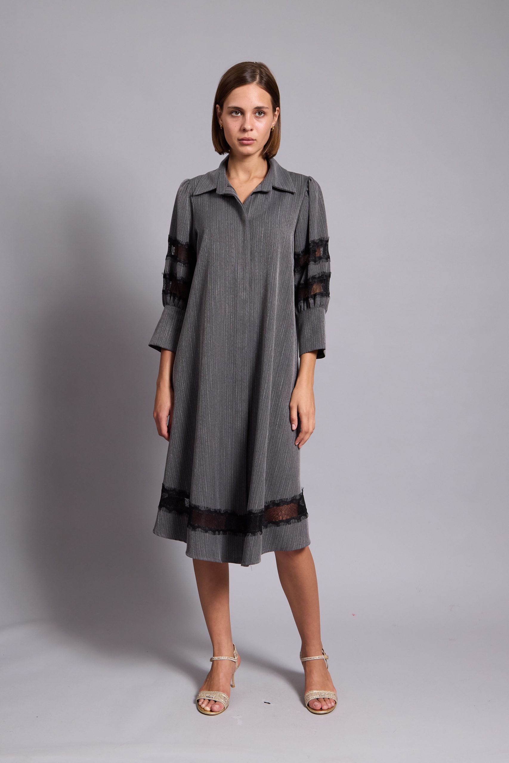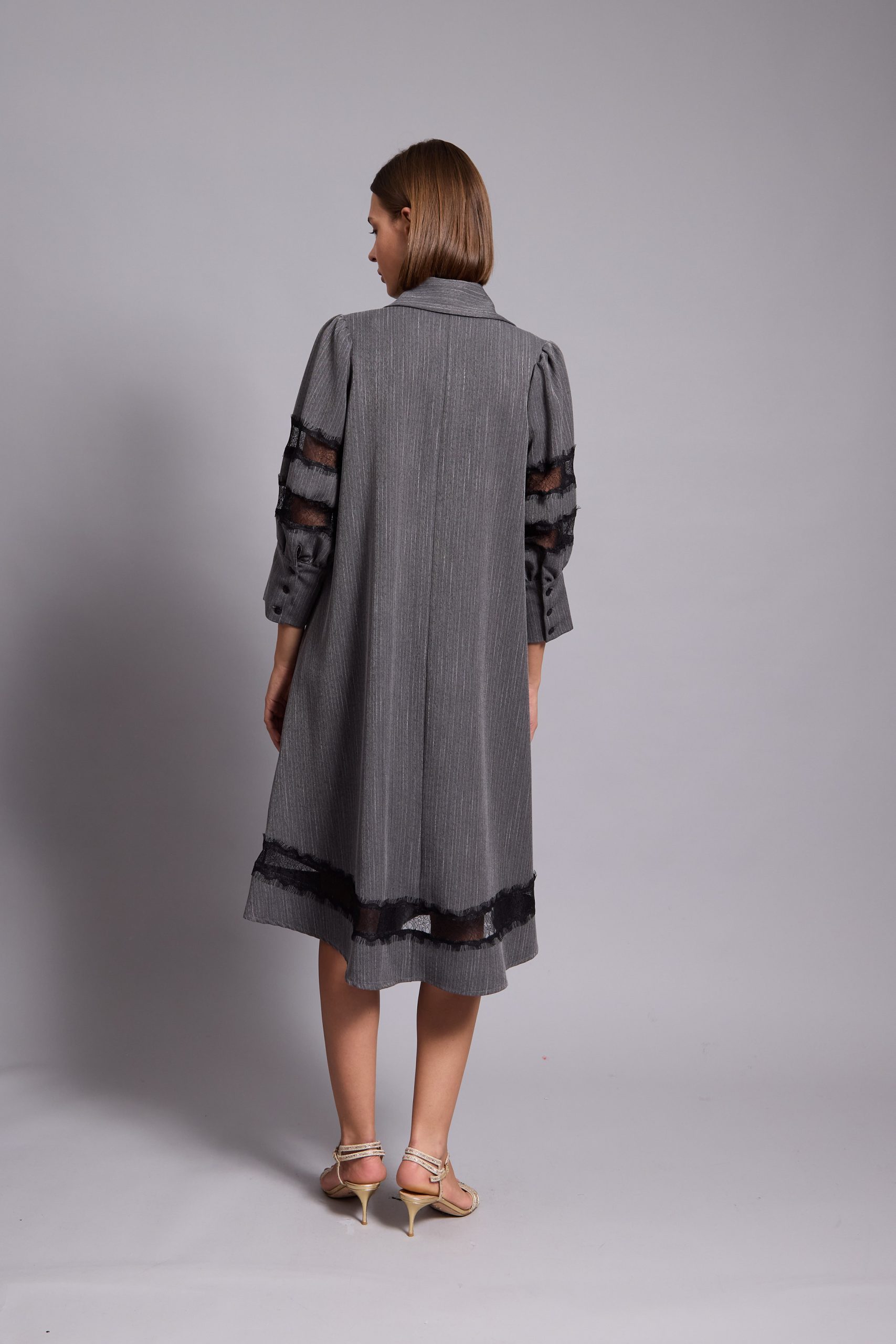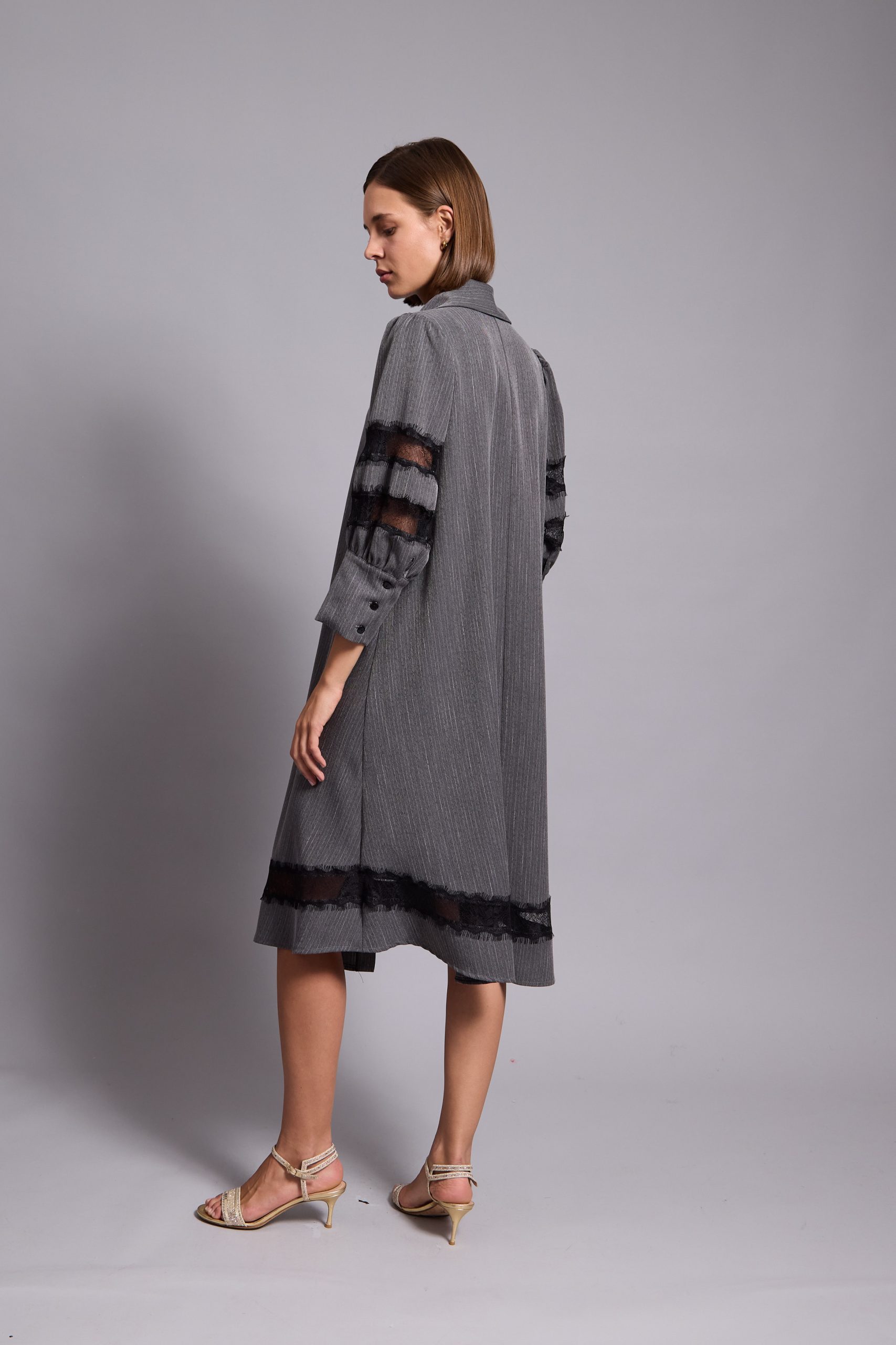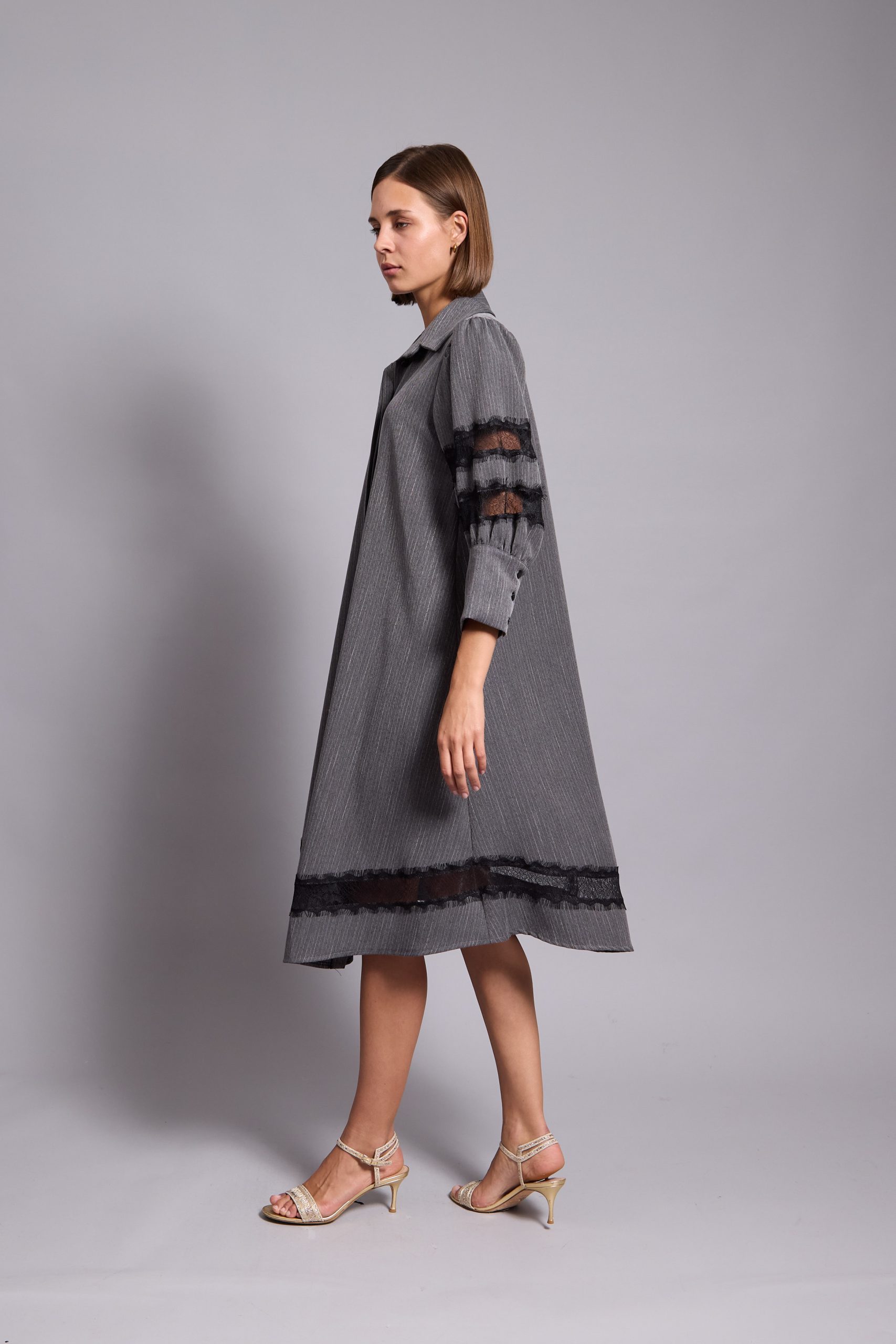 Gloria- Pinstripe Lace Embellished Midi Shirt Dress In grey