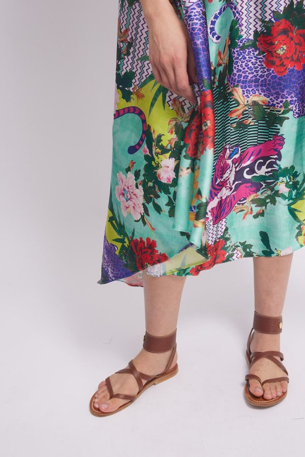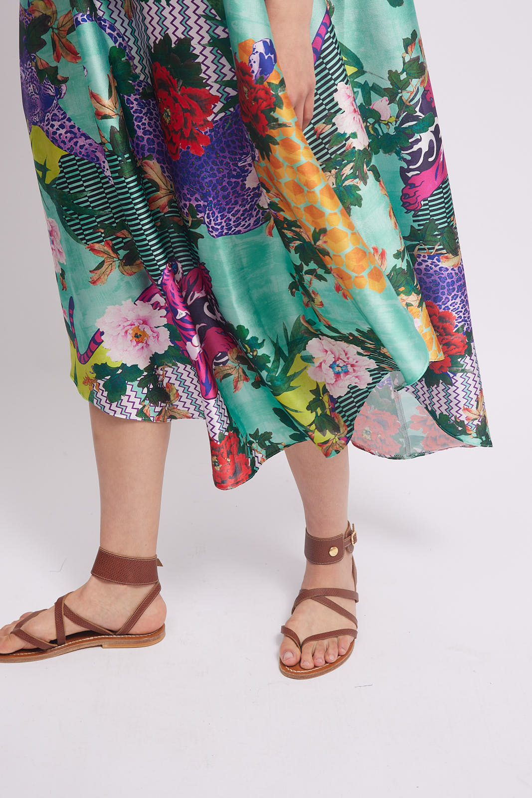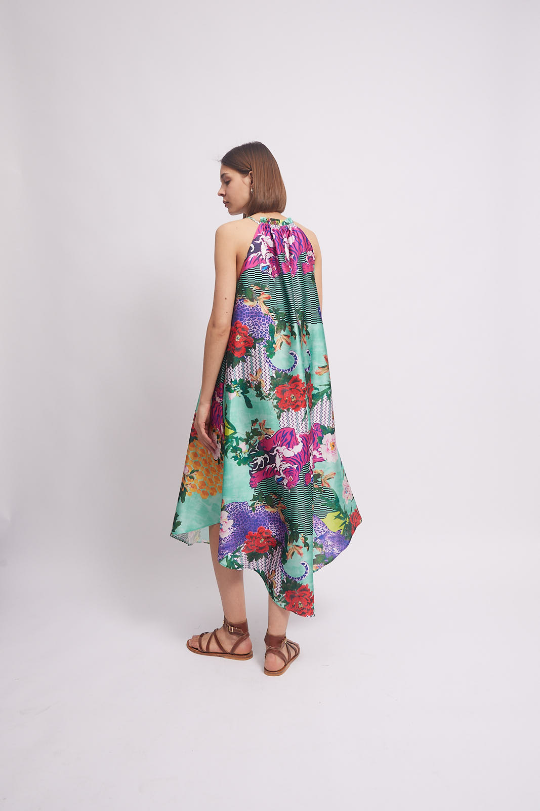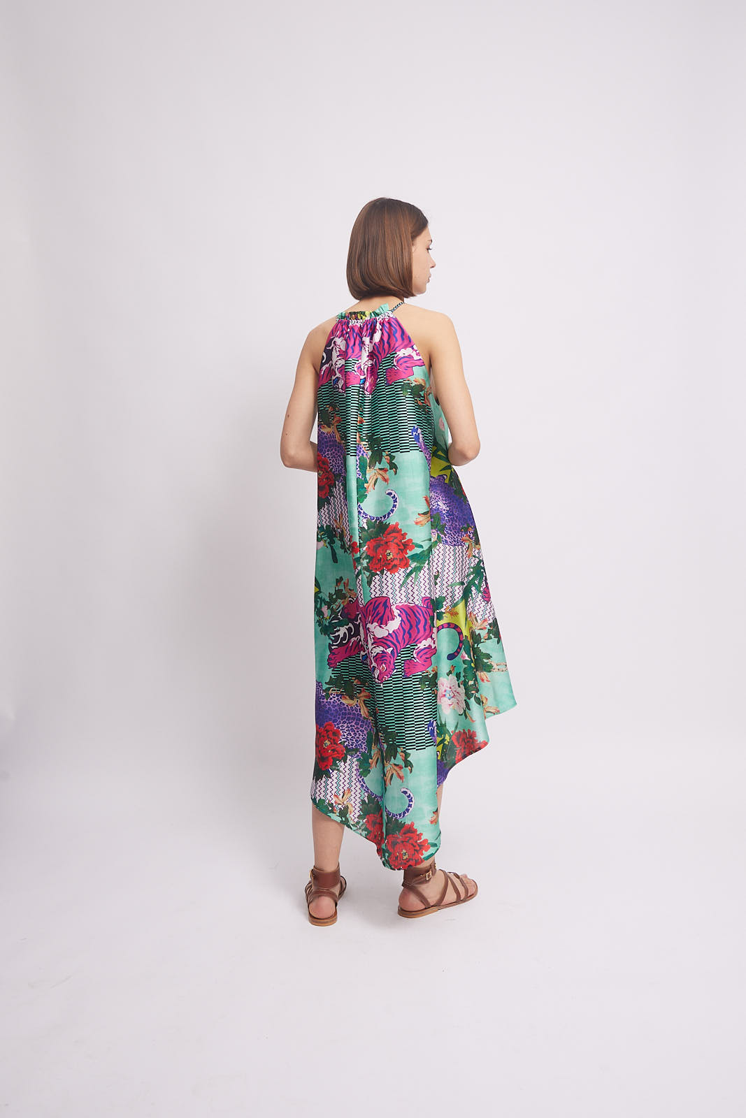 Holly -Gathered floral Satin halterneck midi dress in aqua