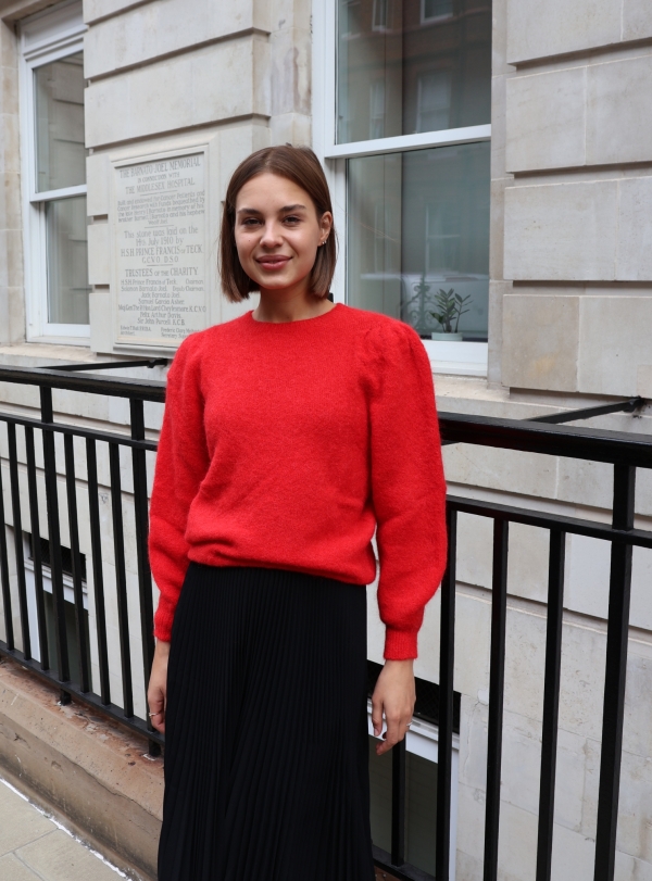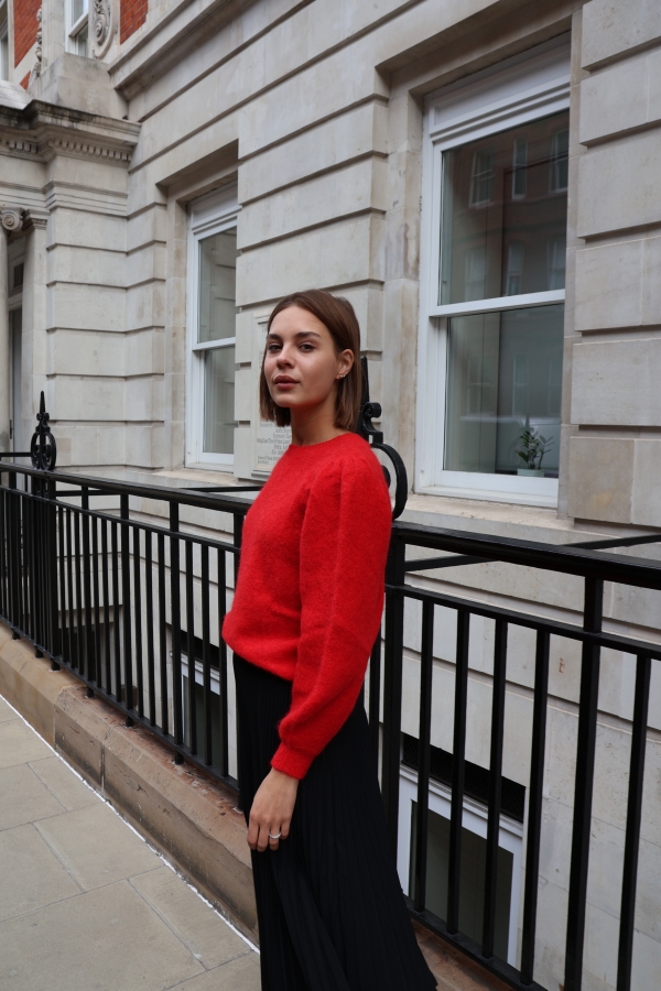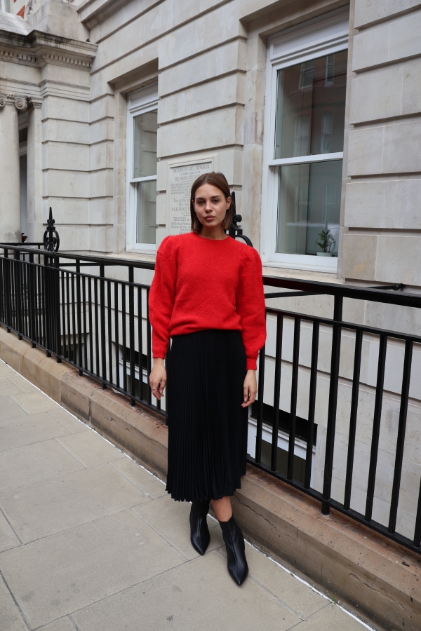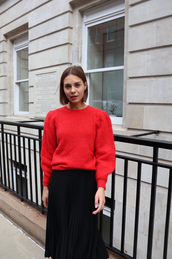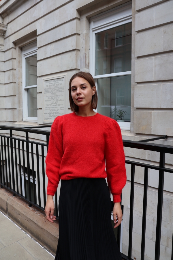 Isabelle knit makes the perfect building blocks for your casual wardrobe. This  sweater is finely knitted with touches of  alpaca  for a really lightweight and breathable handle. The striking  hue will instantly freshen up your complexion and complements everything from neutral tones to dark denim. Designed in a classic crew-neck shape,  in a relaxed fit enhanced by lightly puffed  shoulders . Switch between styling it with boyfriend jeans, slouchy tailoring and tulle skirts. Style it solo or layered over a crisp shirt.