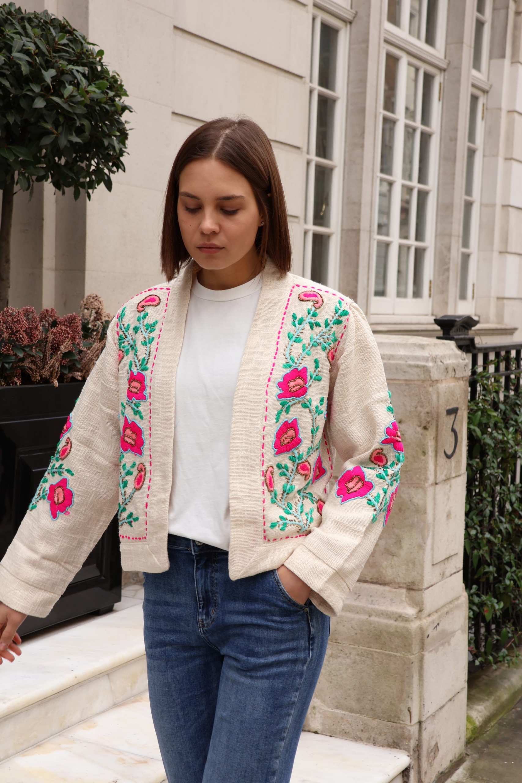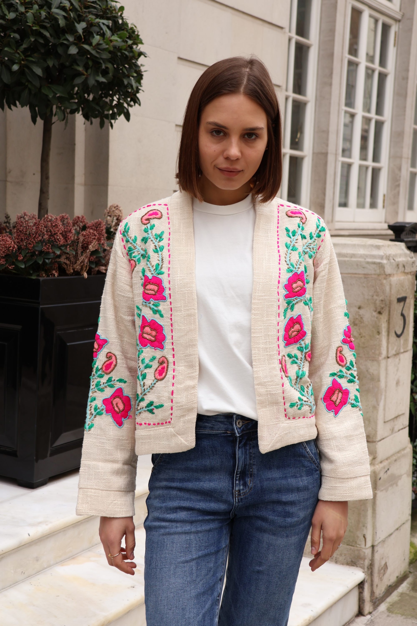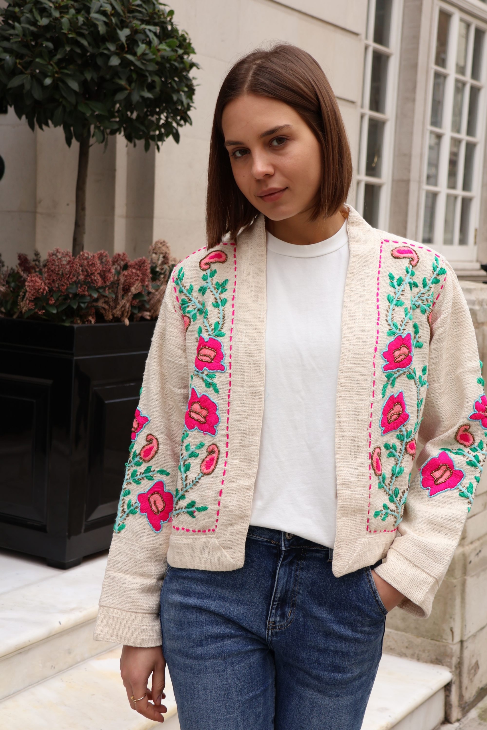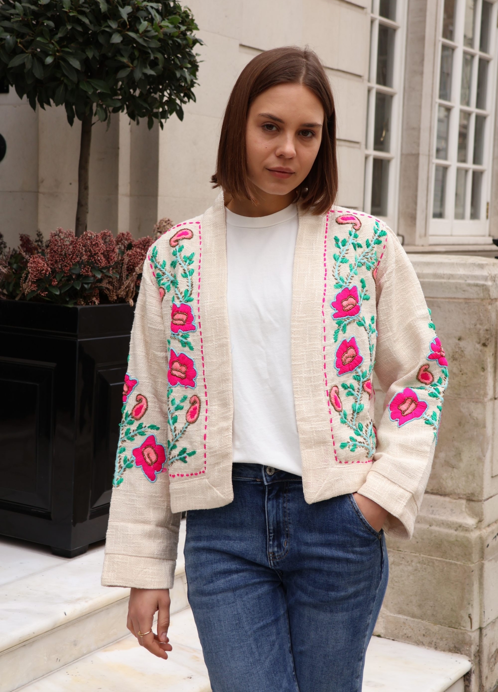 The Isla jacket is a statement layering piece crafted from breathable cotton and beautifully embellished with colourful beads for a touch of artisanal charm. Designed with an open front and no fastenings, it drapes effortlessly for an easy, relaxed silhouette.