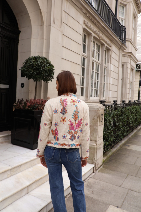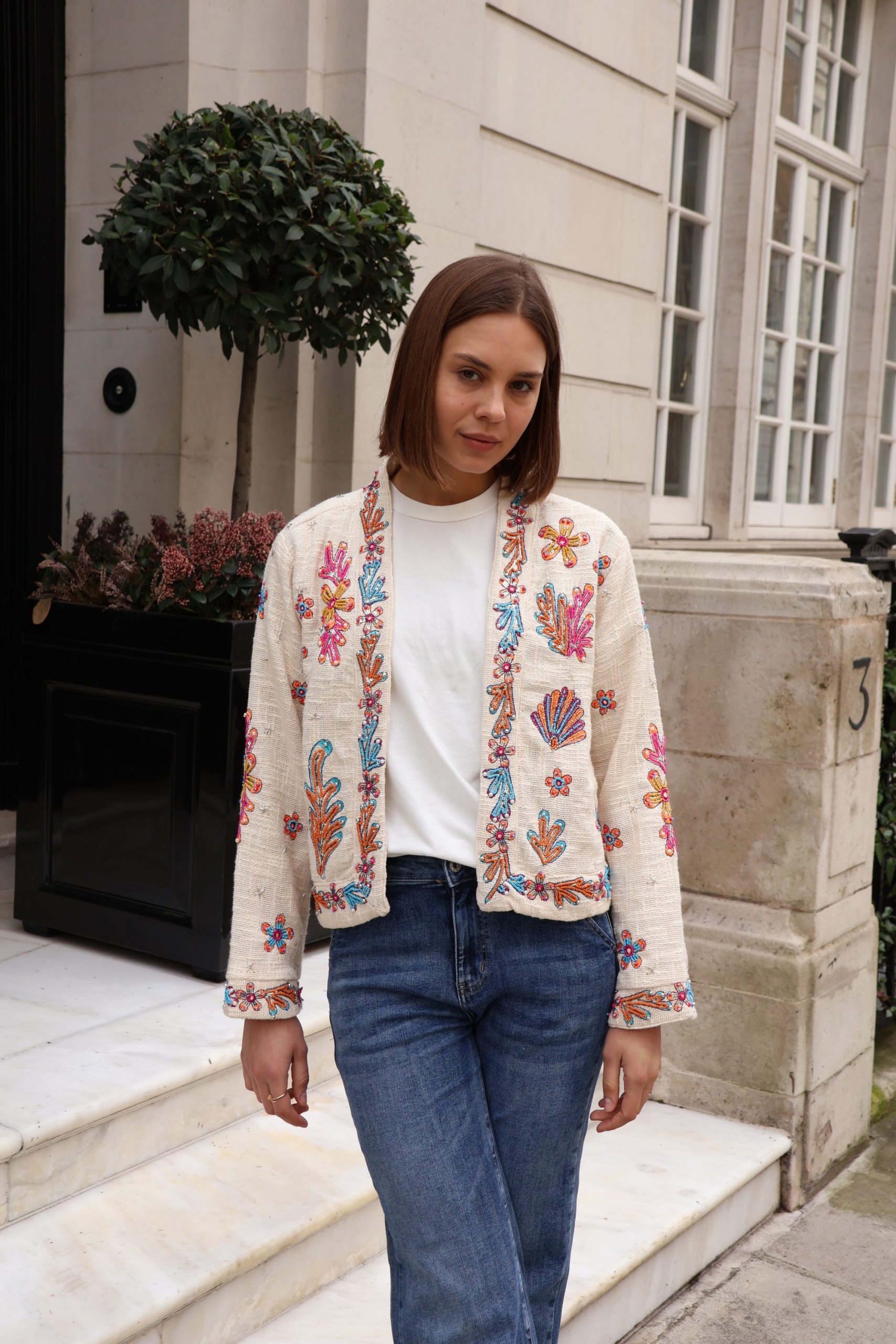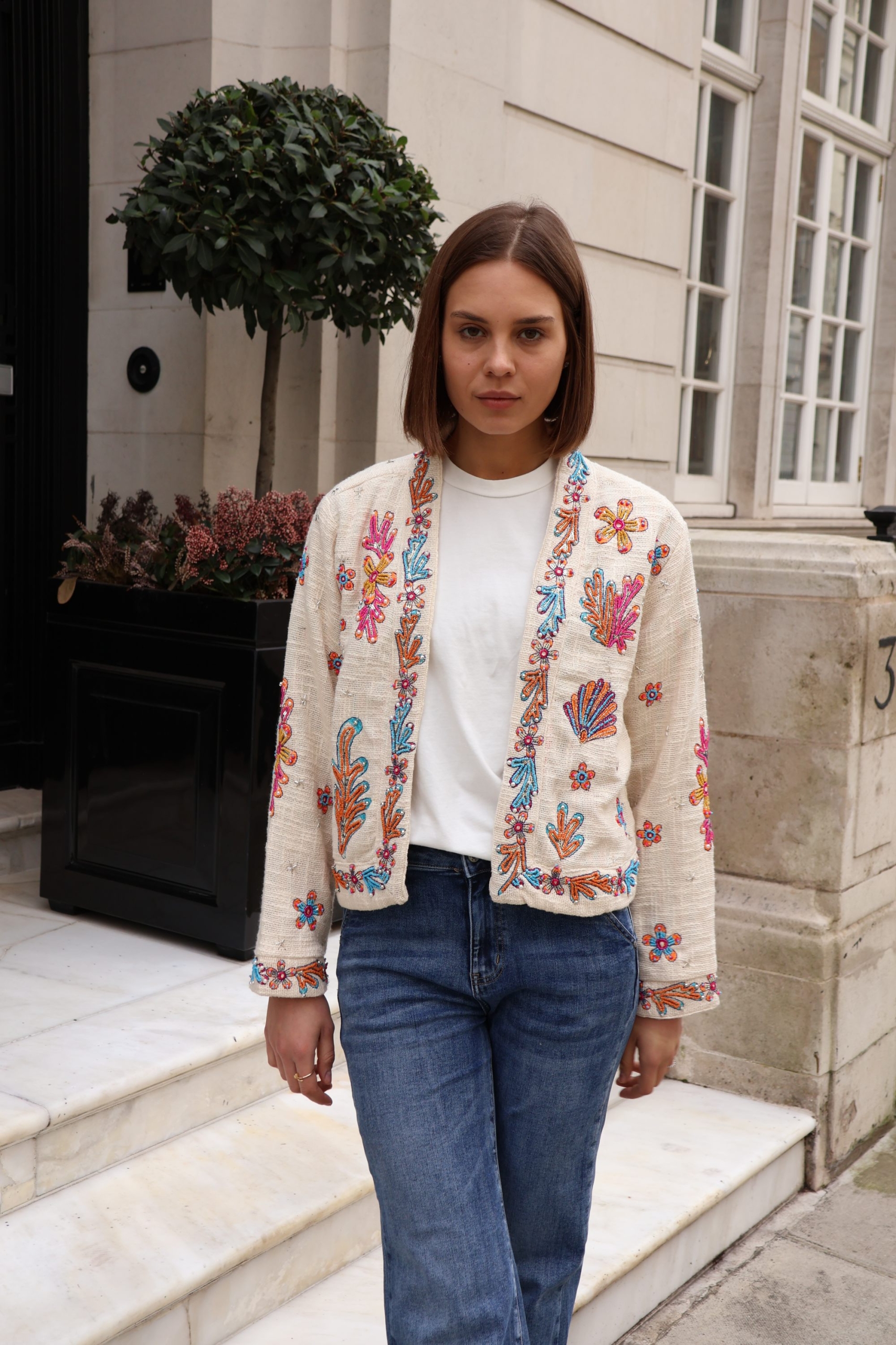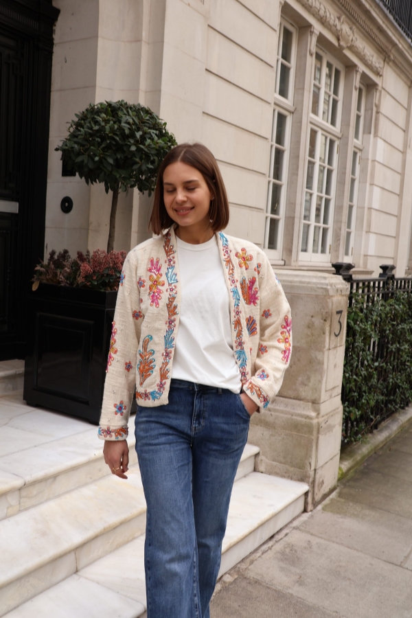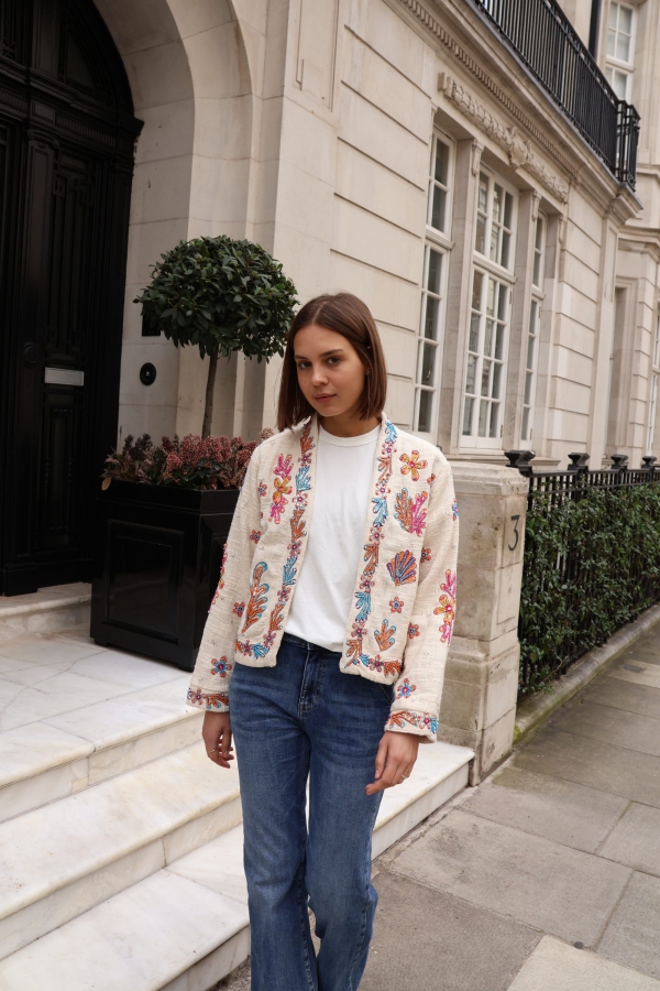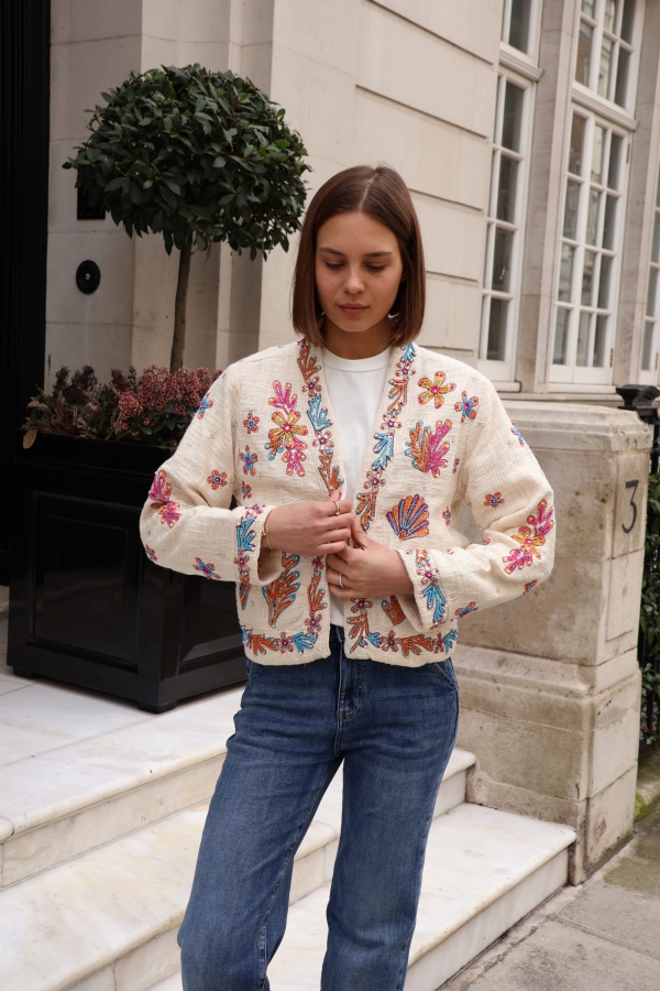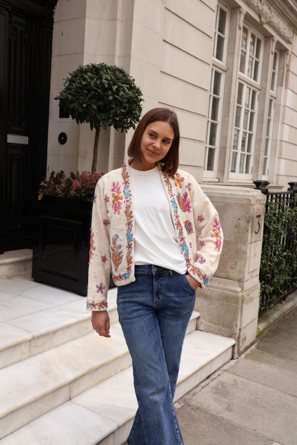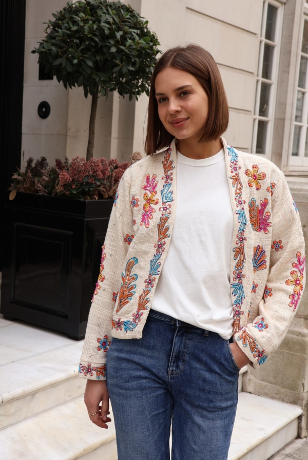 The Isla jacket is a statement layering piece crafted from breathable cotton and beautifully embellished with colourful beads for a touch of artisanal charm. Designed with an open front and no fastenings, it drapes effortlessly for an easy, relaxed silhouette.