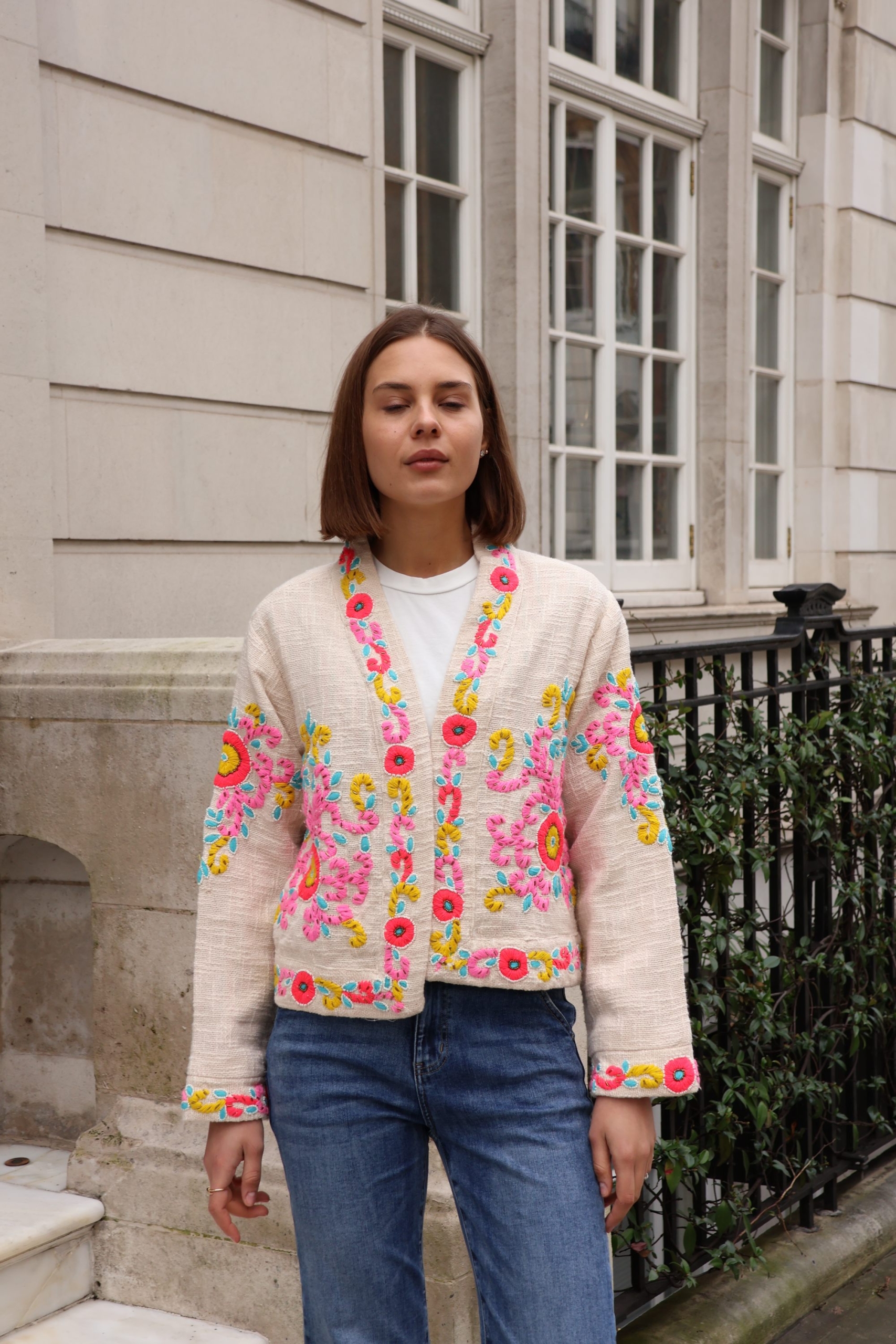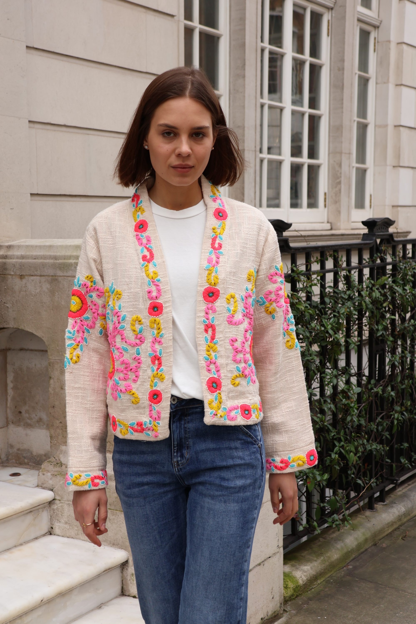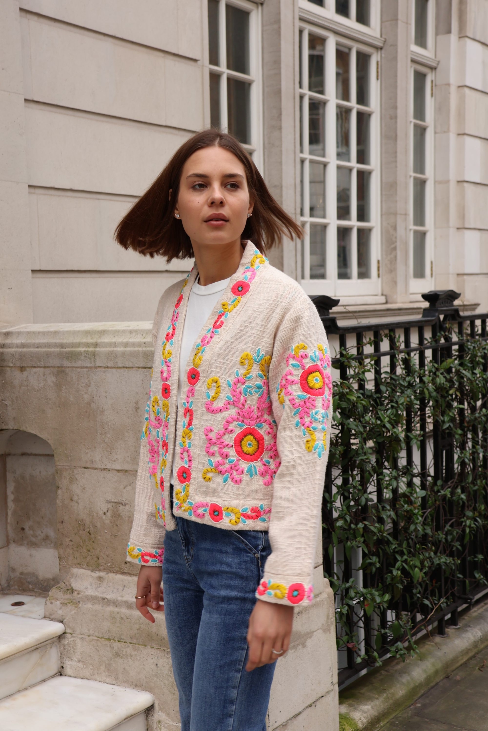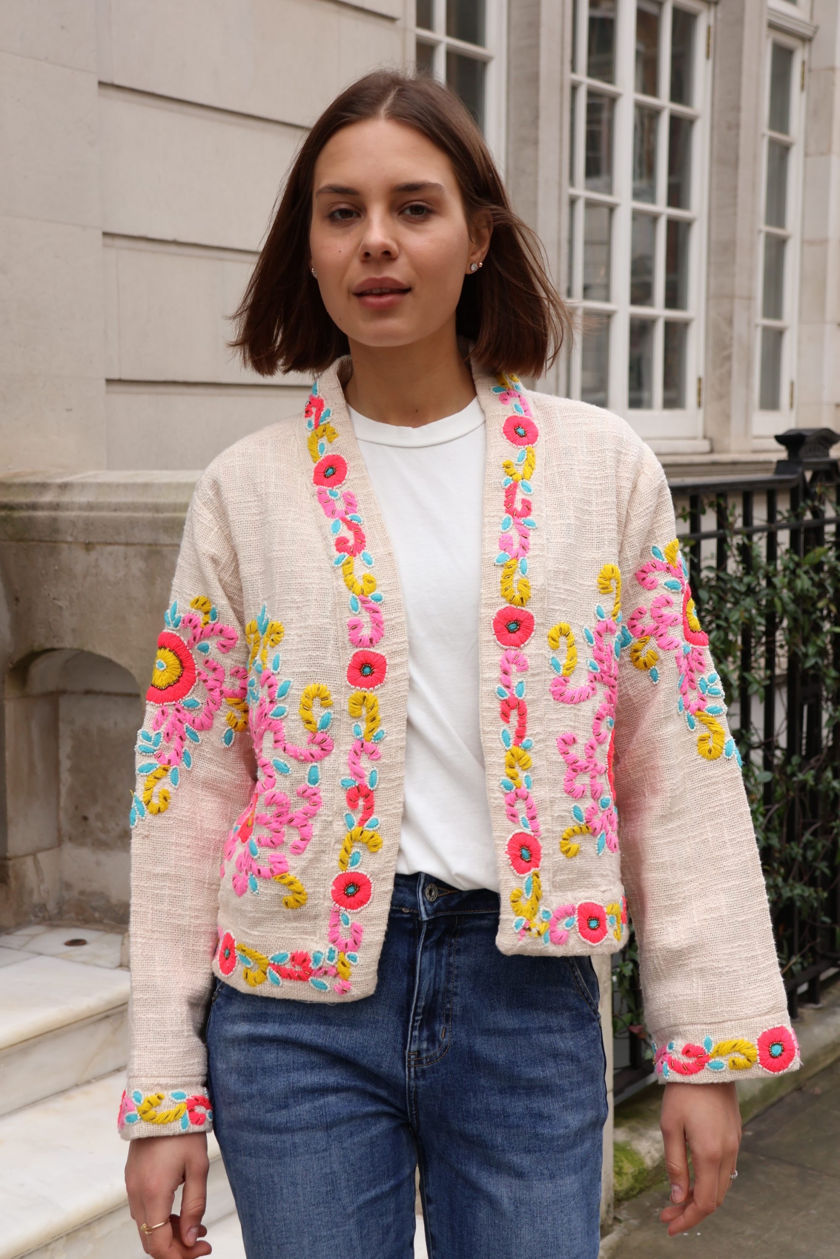 Isla – Beaded Cotton Open-Front Jacket Pink Floral