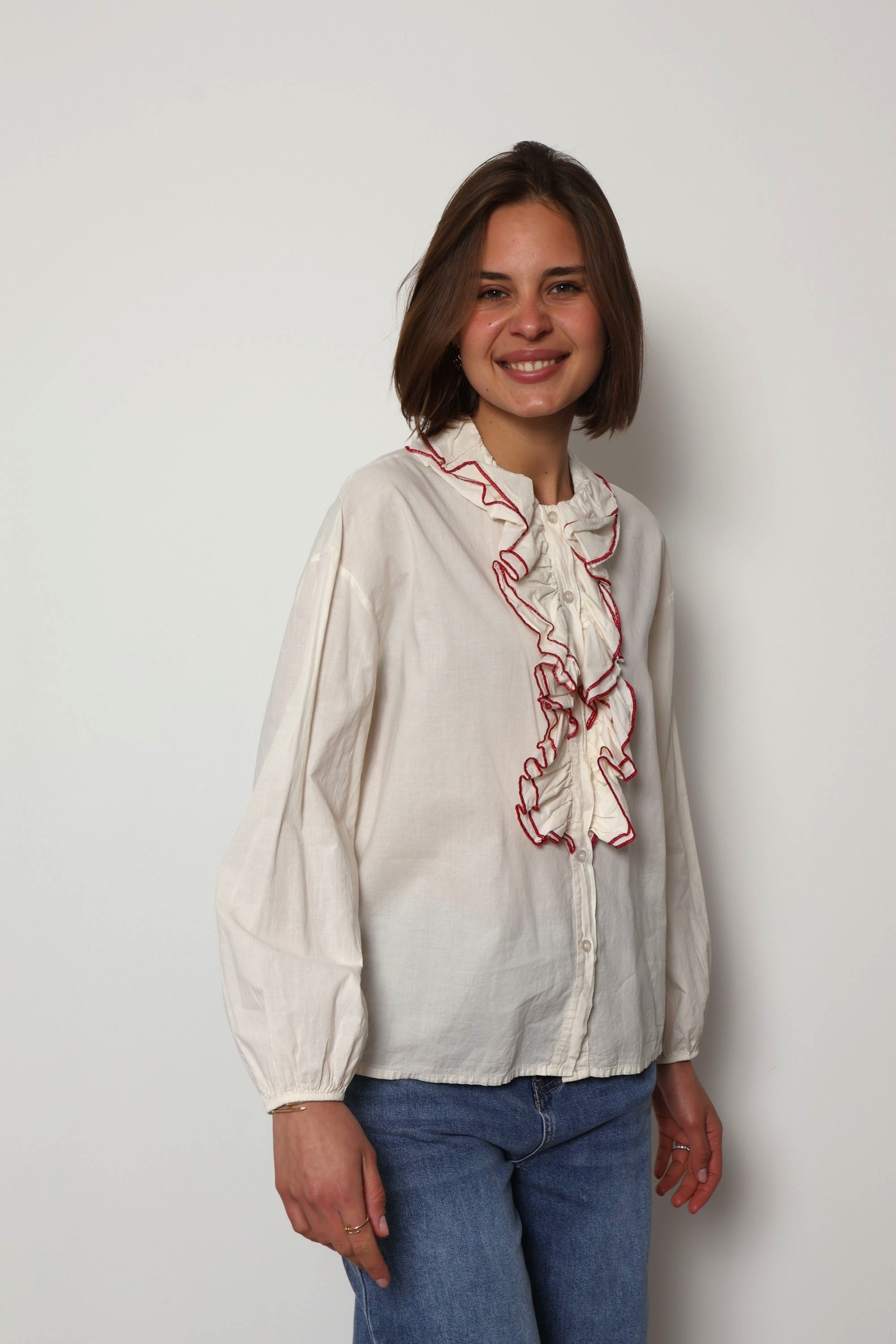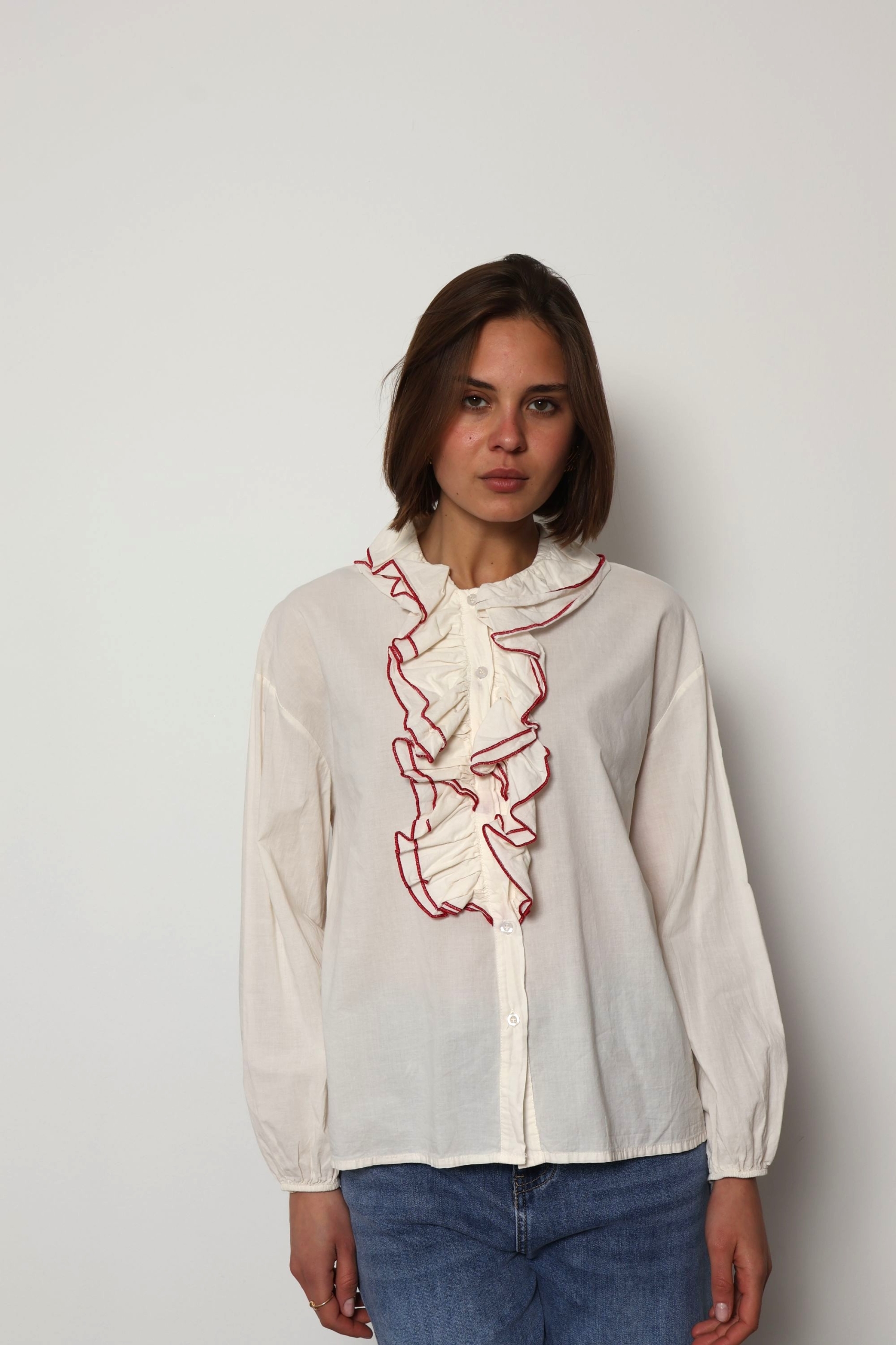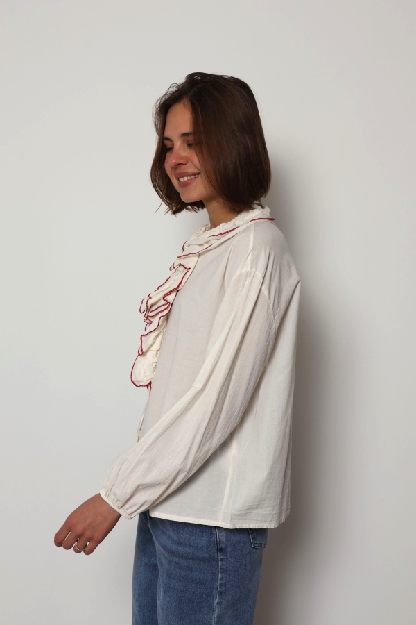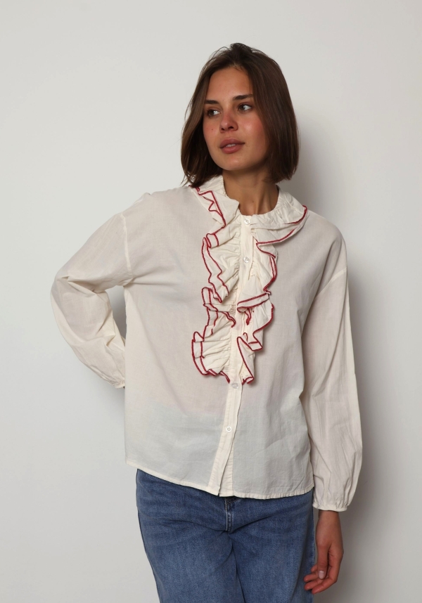 The Jaqueline shirt is a feminine cotton piece designed with soft ruffle detailing and elegant contrast colour trim that highlights the edges of the ruffles. The contrasting trim adds a refined accent, giving the shirt a fresh and distinctive look while keeping the overall style light and effortless.