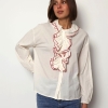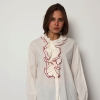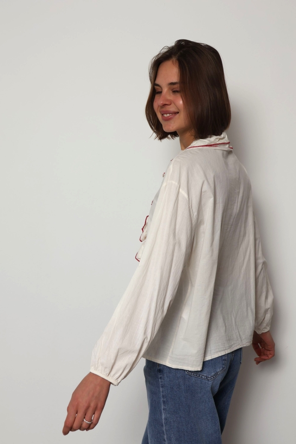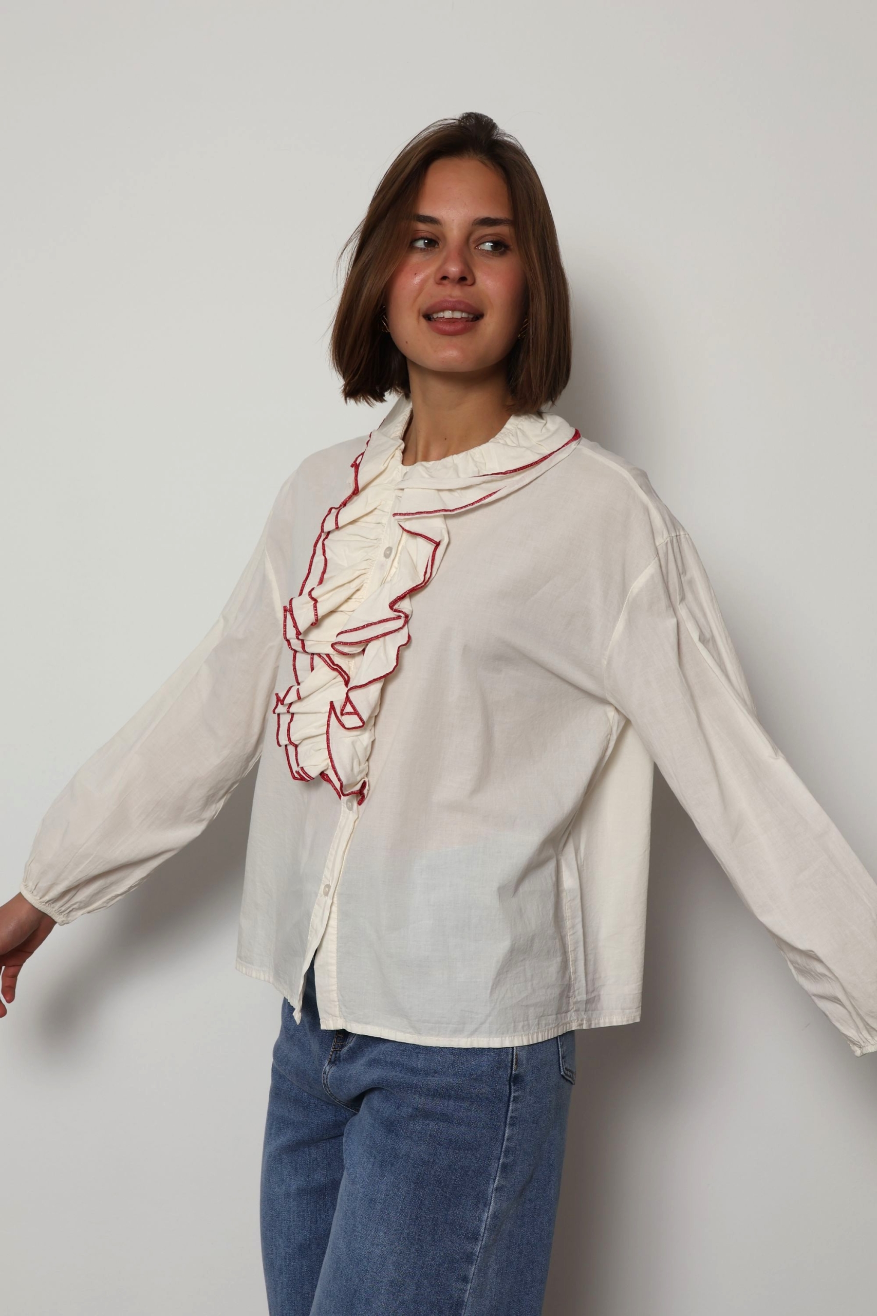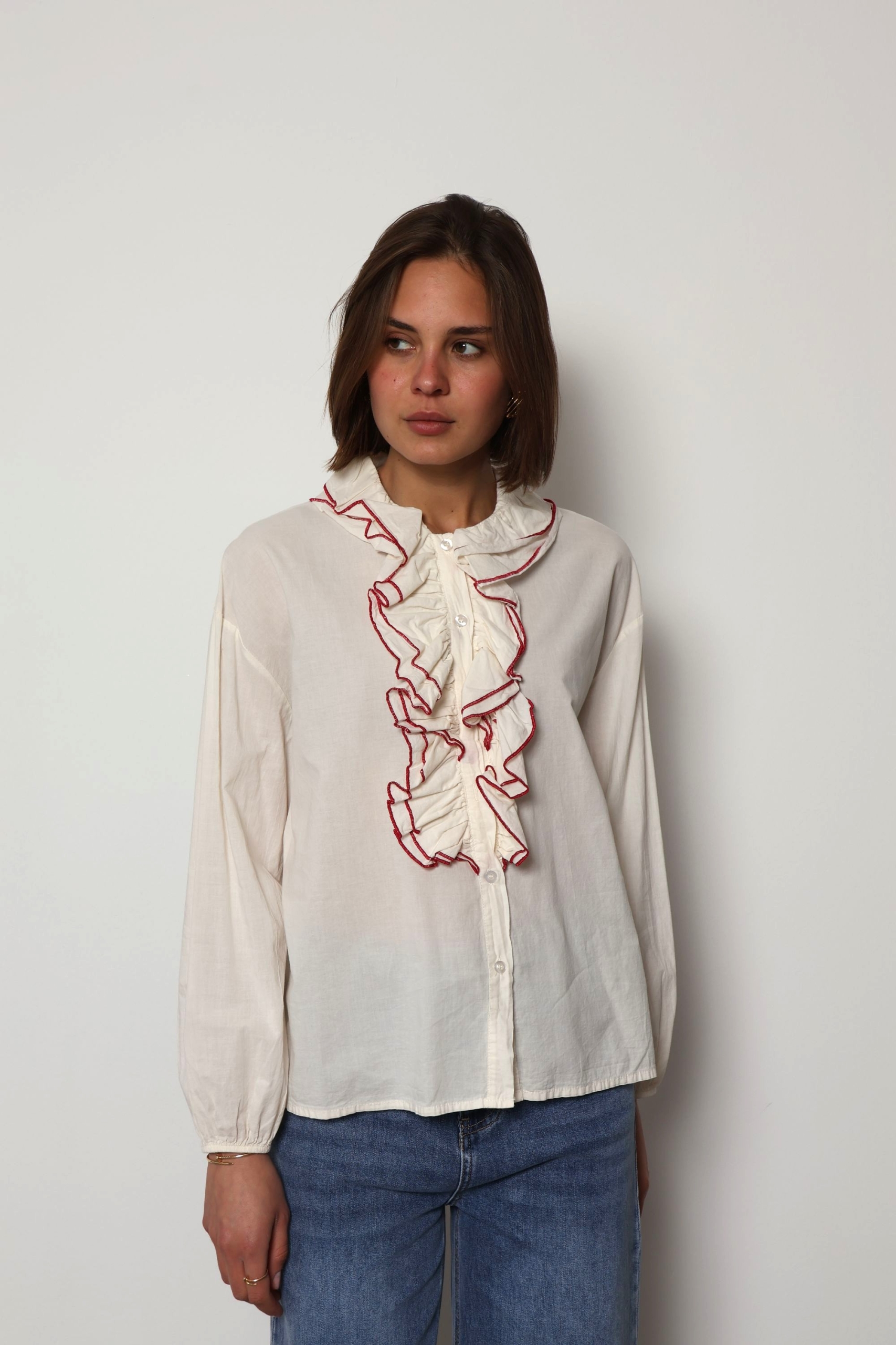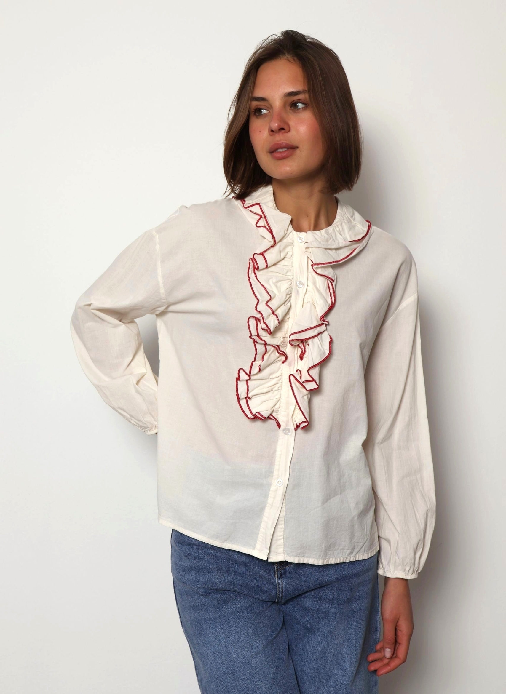 The Jaqueline shirt is a feminine cotton piece designed with soft ruffle detailing and elegant contrast colour trim that highlights the edges of the ruffles. The contrasting trim adds a refined accent, giving the shirt a fresh and distinctive look while keeping the overall style light and effortless.