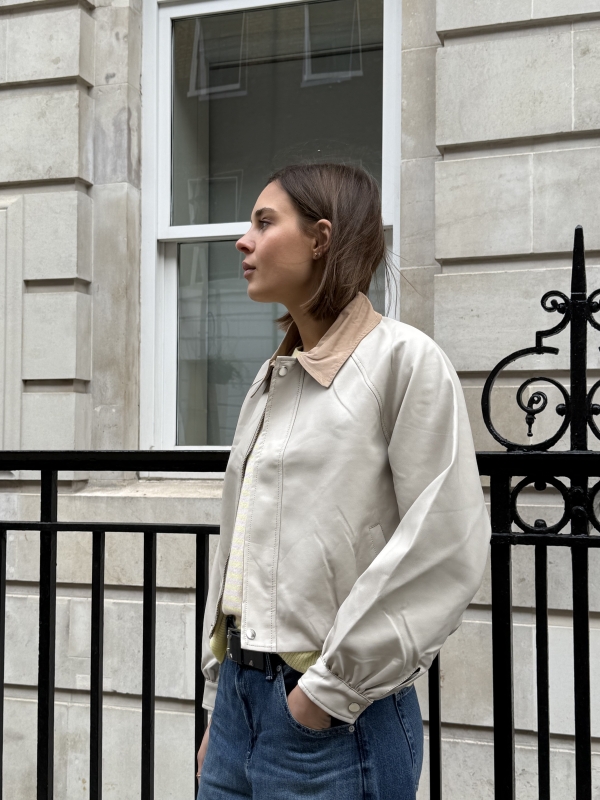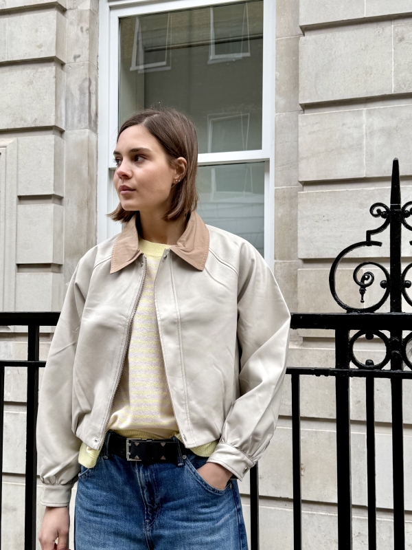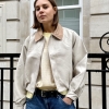 Add a chic touch to your wardrobe with the Kaylie Faux Leather Bomber Jacket. Designed in a soft beige tone, this stylish piece features a contrast tan collar that elevates its classic bomber silhouette.