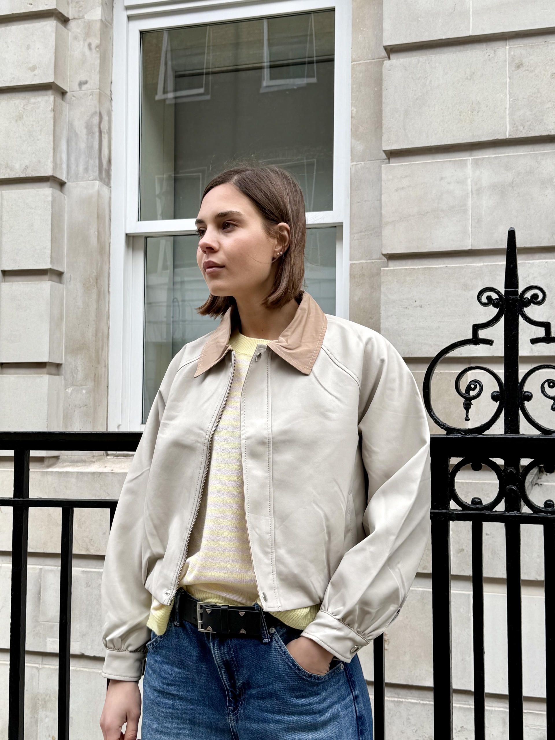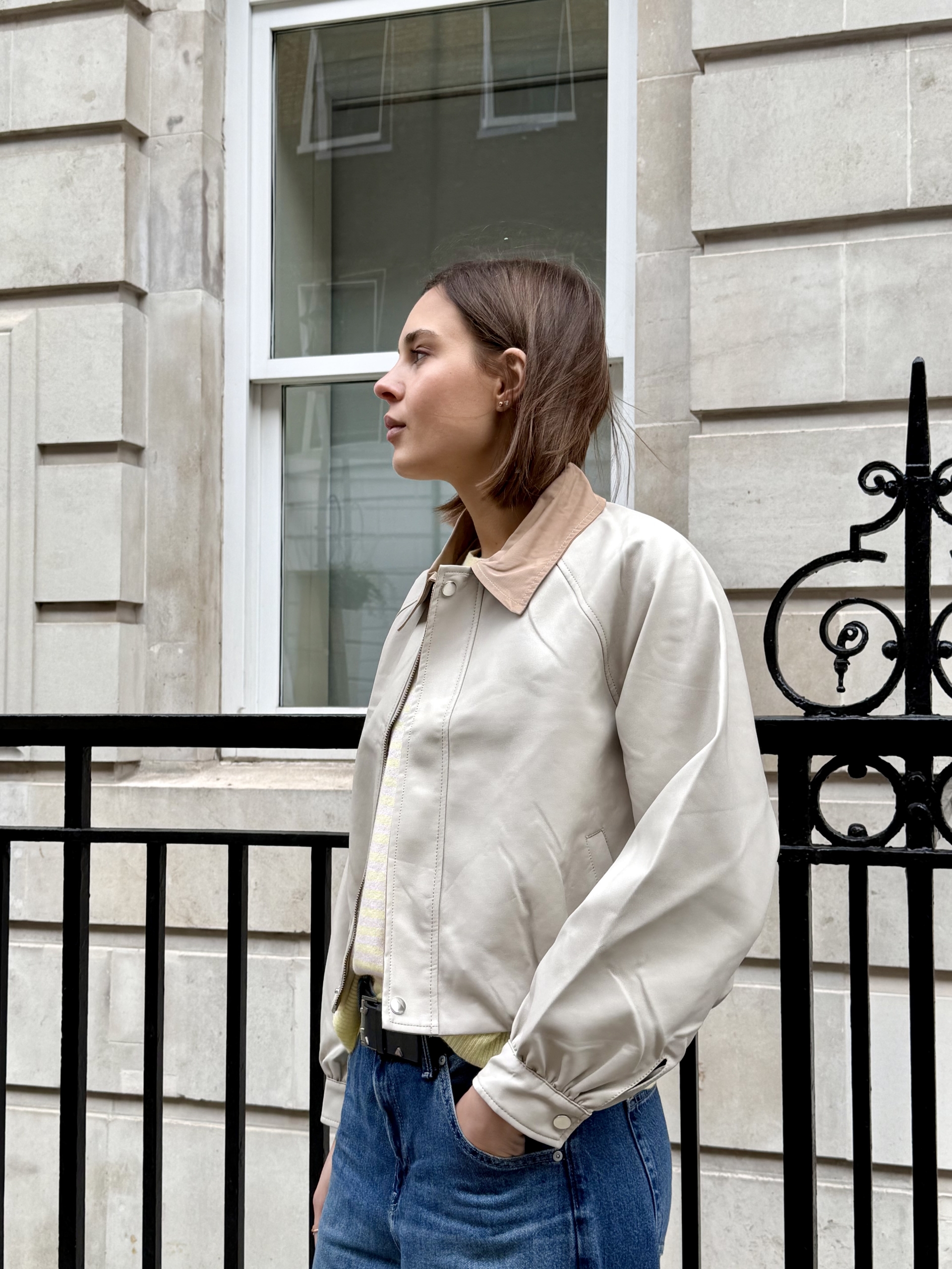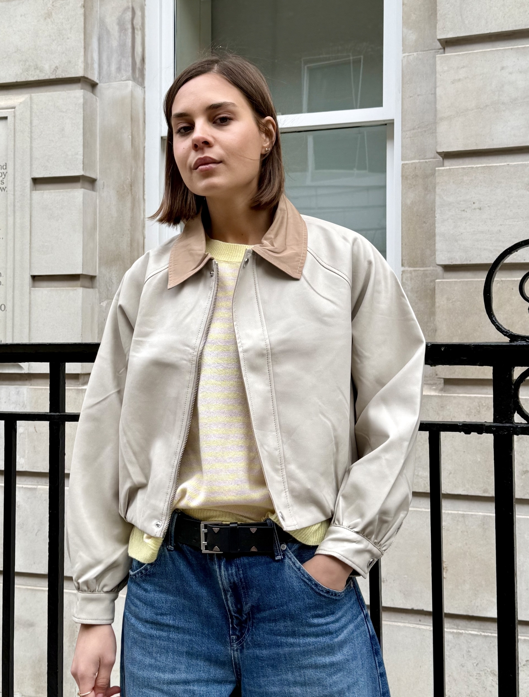 Add a chic touch to your wardrobe with the Kaylie Faux Leather Bomber Jacket. Designed in a soft beige tone, this stylish piece features a contrast tan collar that elevates its classic bomber silhouette.