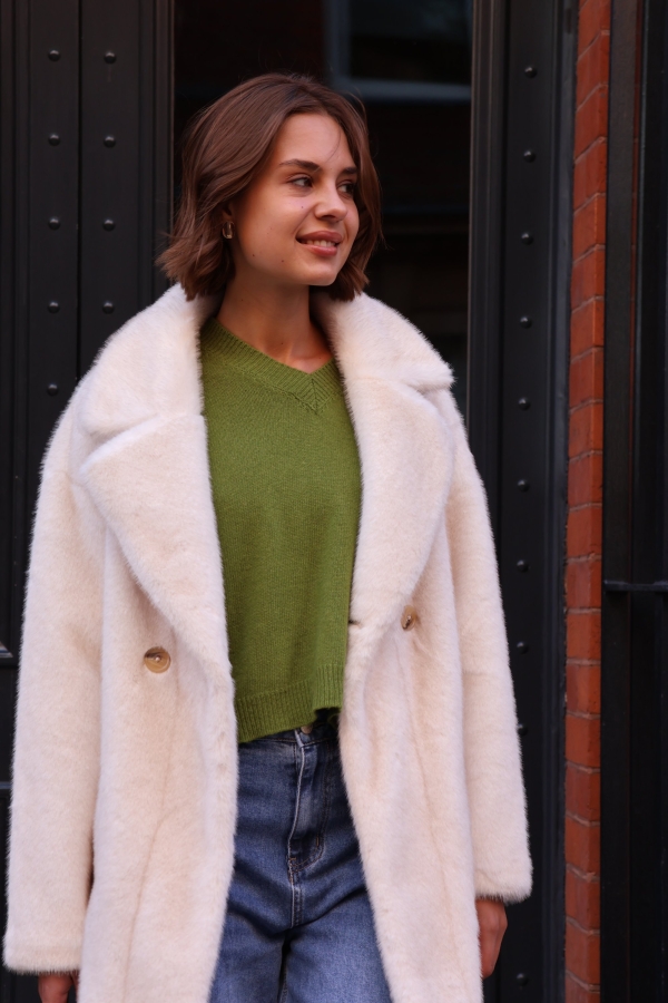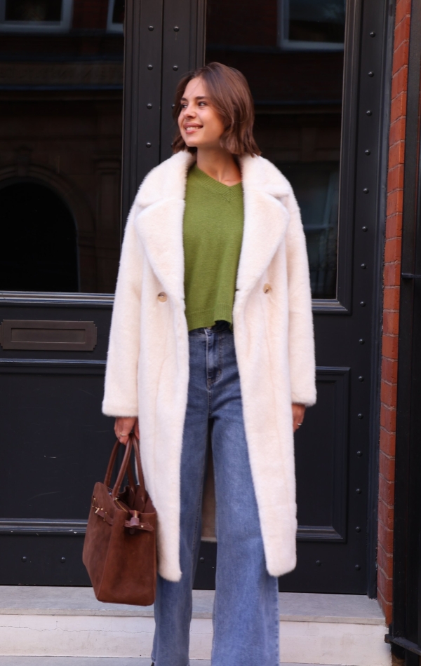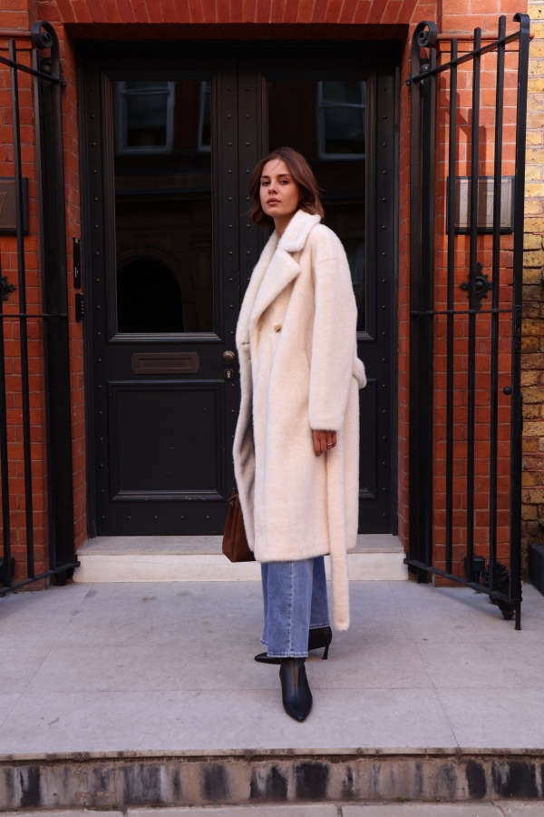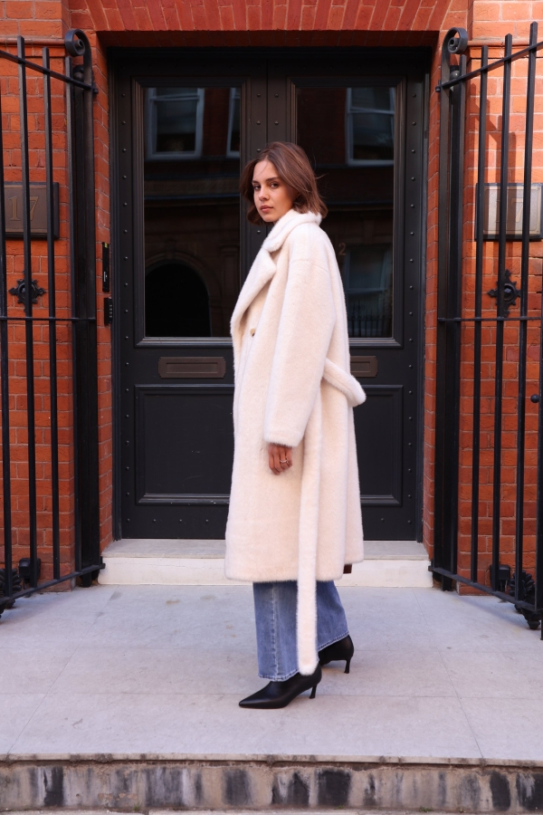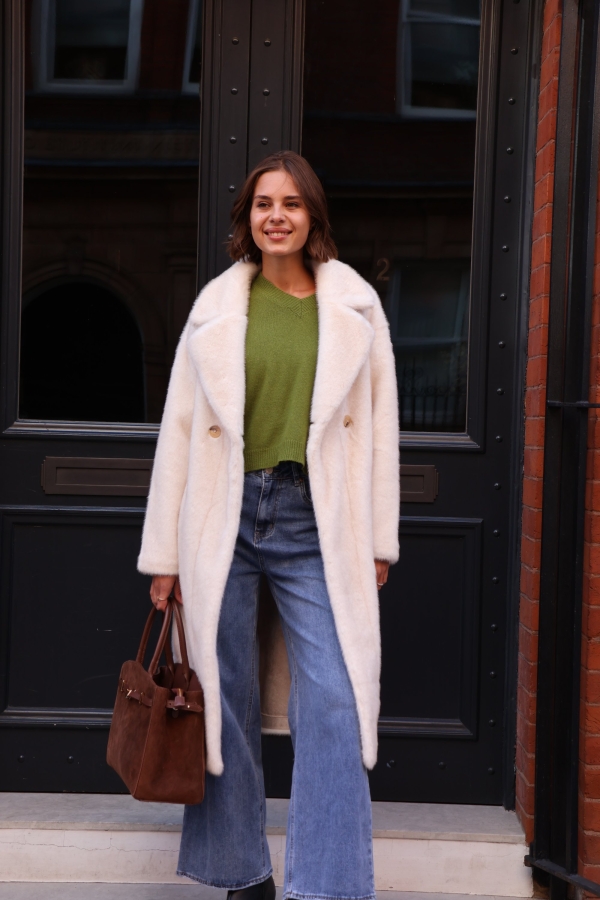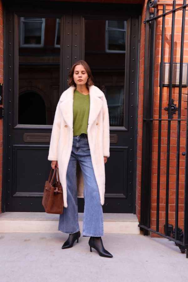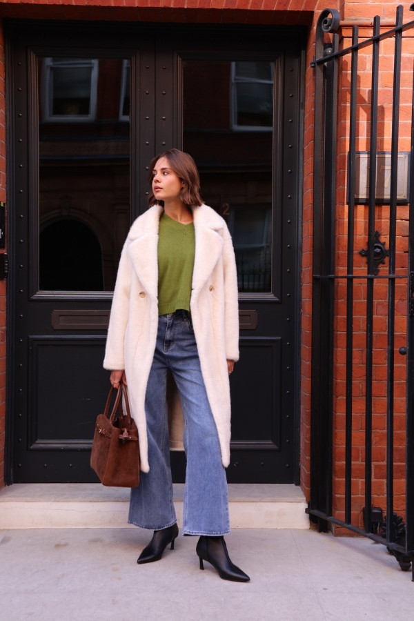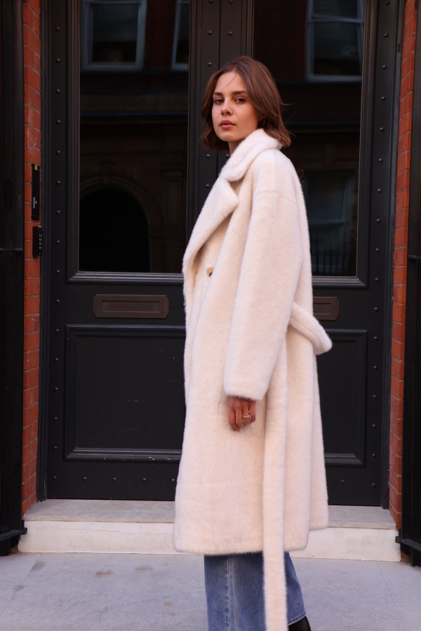 Kelly outerwear feels so soft and luxurious, you’re guaranteed to be reaching for it on rotation all season long. This  style has been made from plush faux fur . The minimal design is enhanced by  a classic storm flap neckline , while the smooth satin lining ensures easy layering. Kelly coat offers the look of chic luxury while offering plenty of warmth.  Discreet pockets come in handy for stowing essentials on the go. Lean into the relaxed mood by styling yours with just  about anything. Slip it on over a turtleneck sweater or shirt dress.