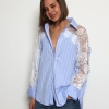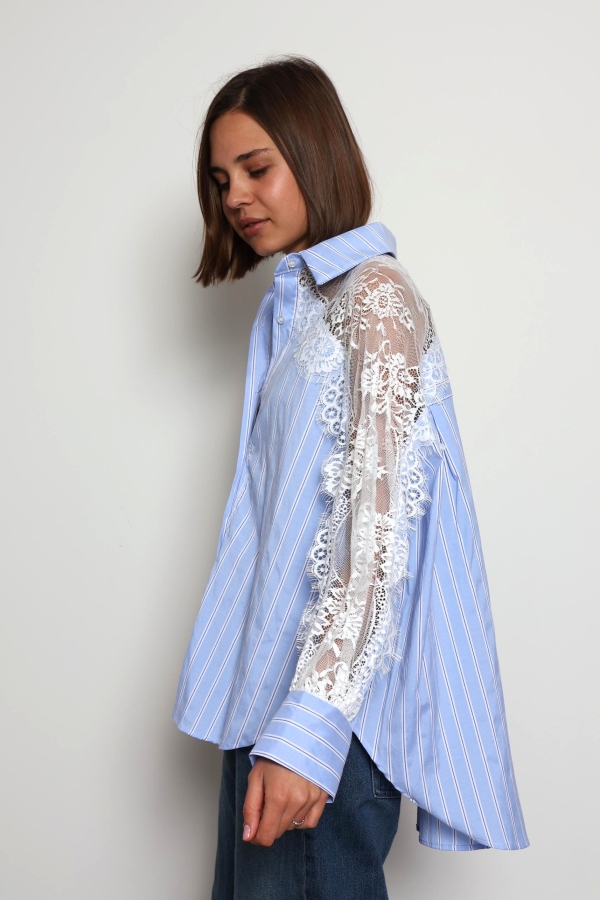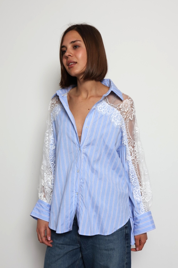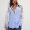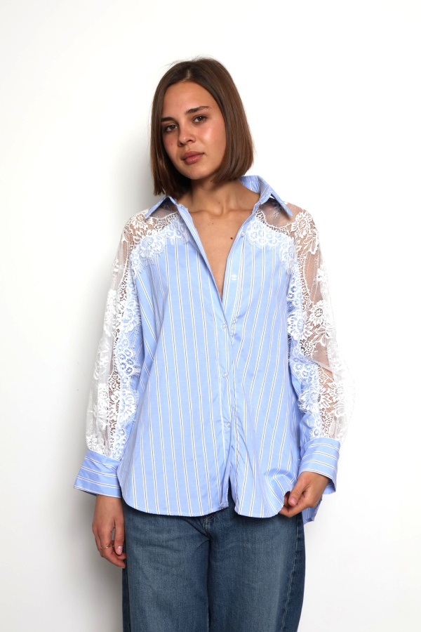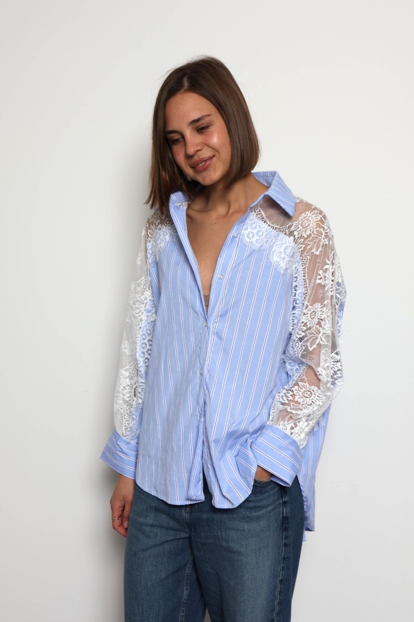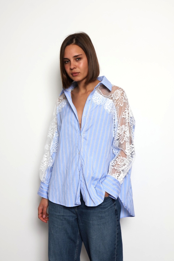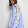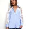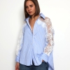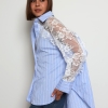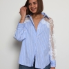 Khloe -Cotton Blouse with Lace Sleeve Details In Striped Blue