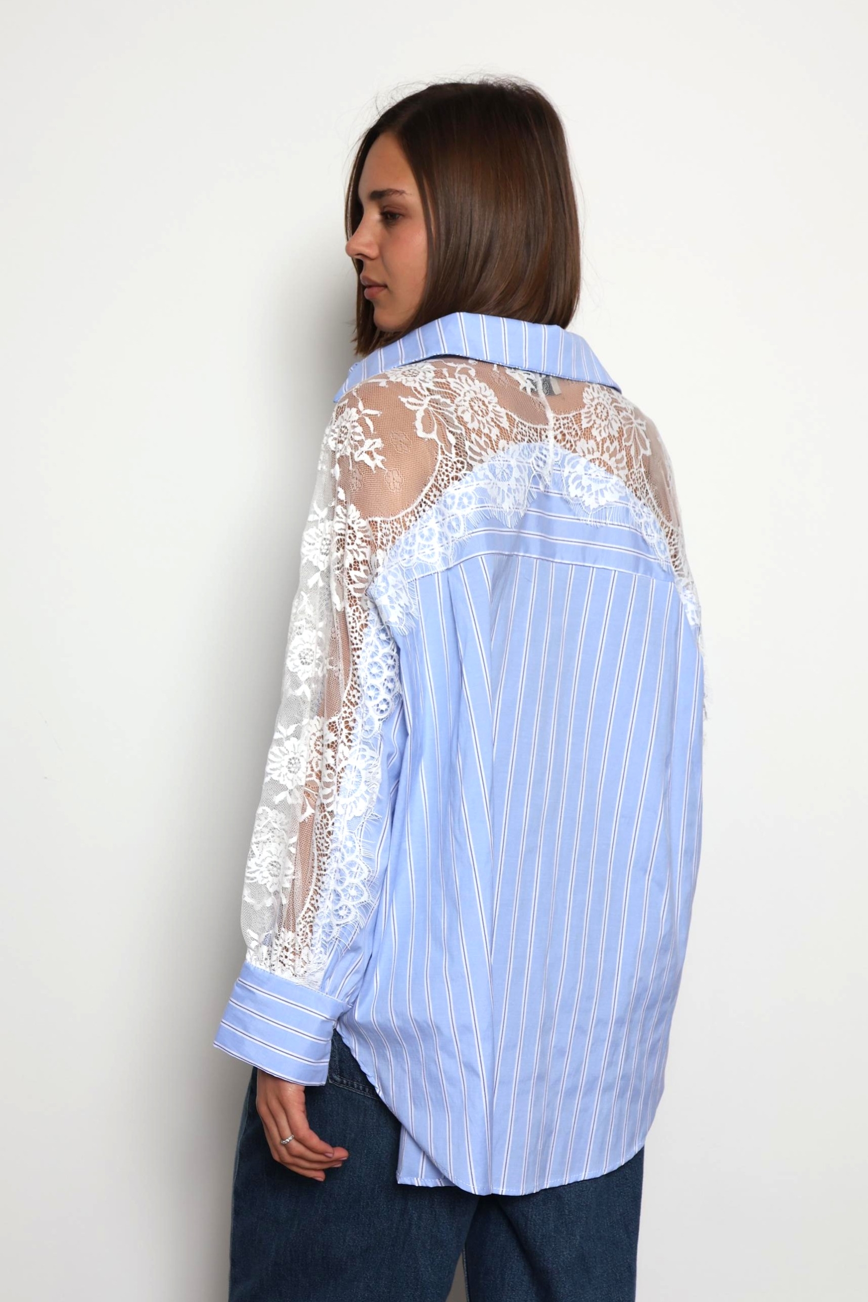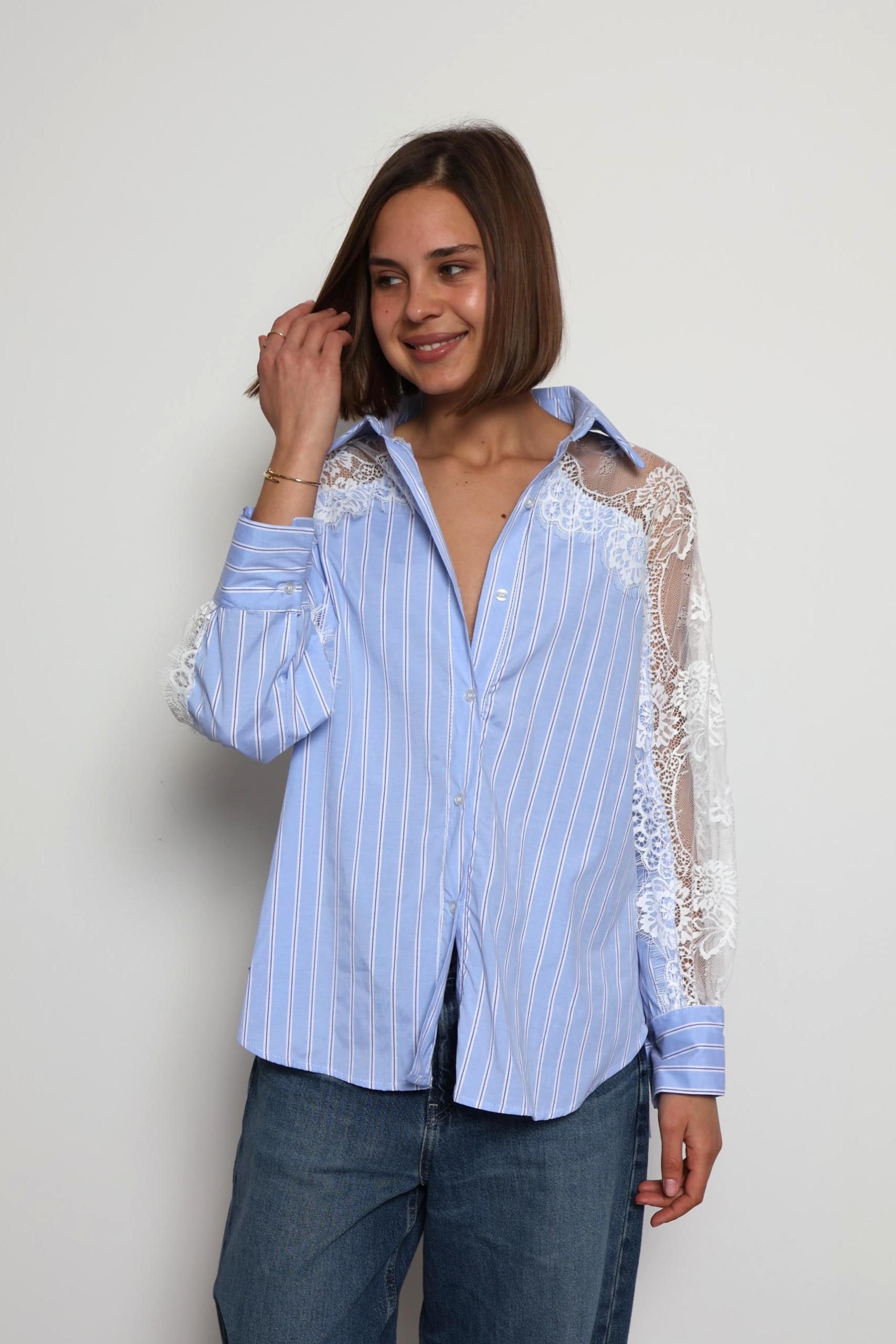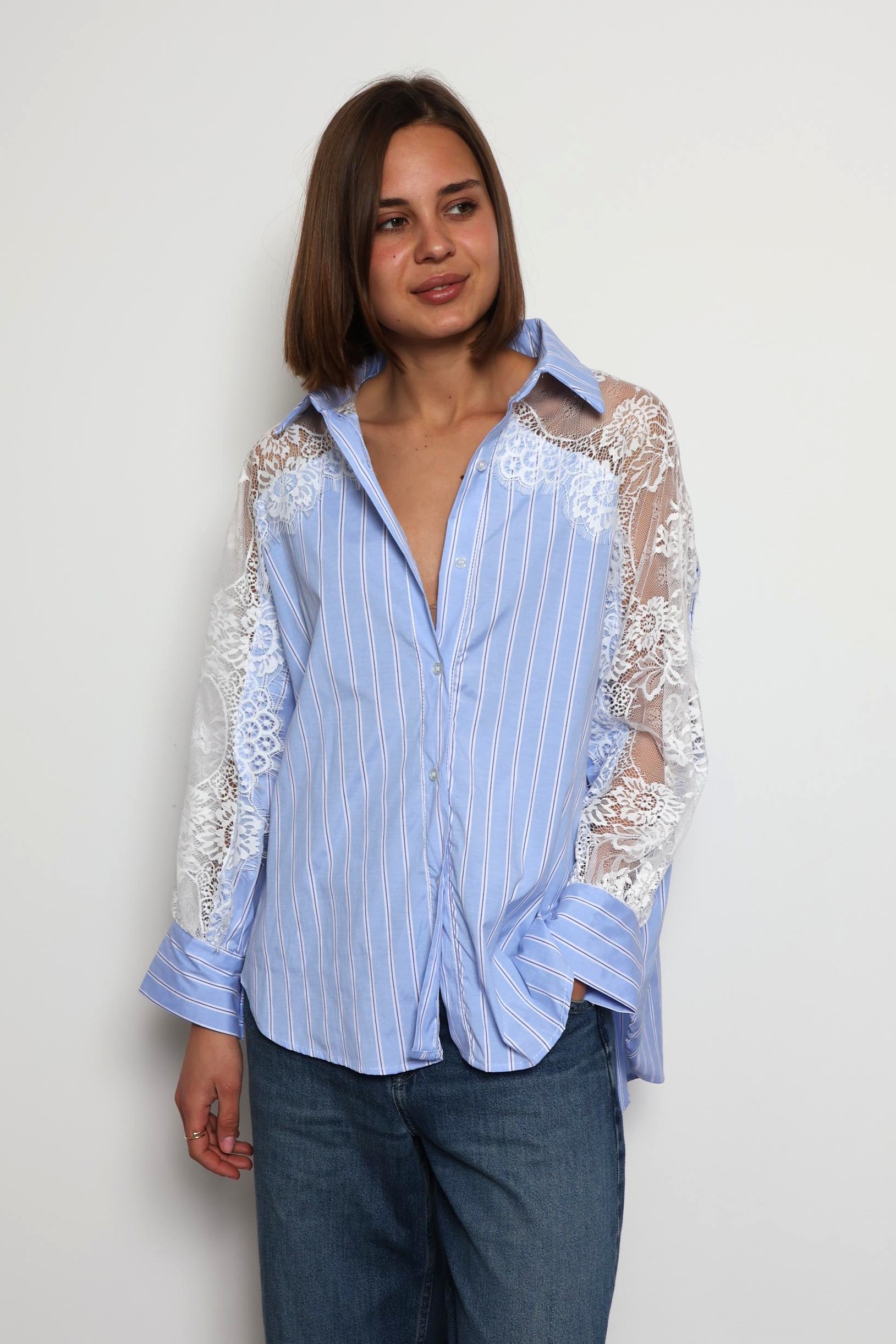 Khloe -Cotton Blouse with Lace Sleeve Details In Striped Blue
