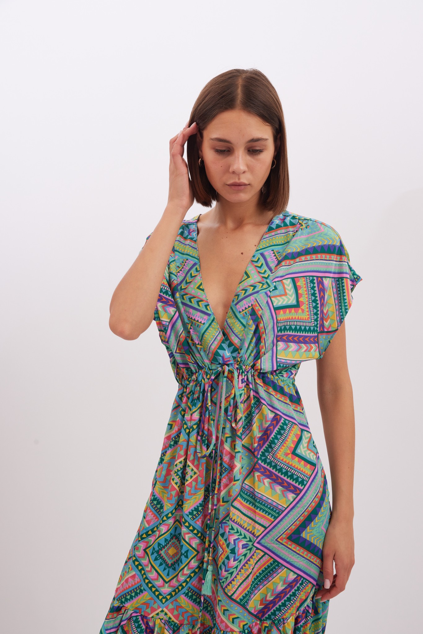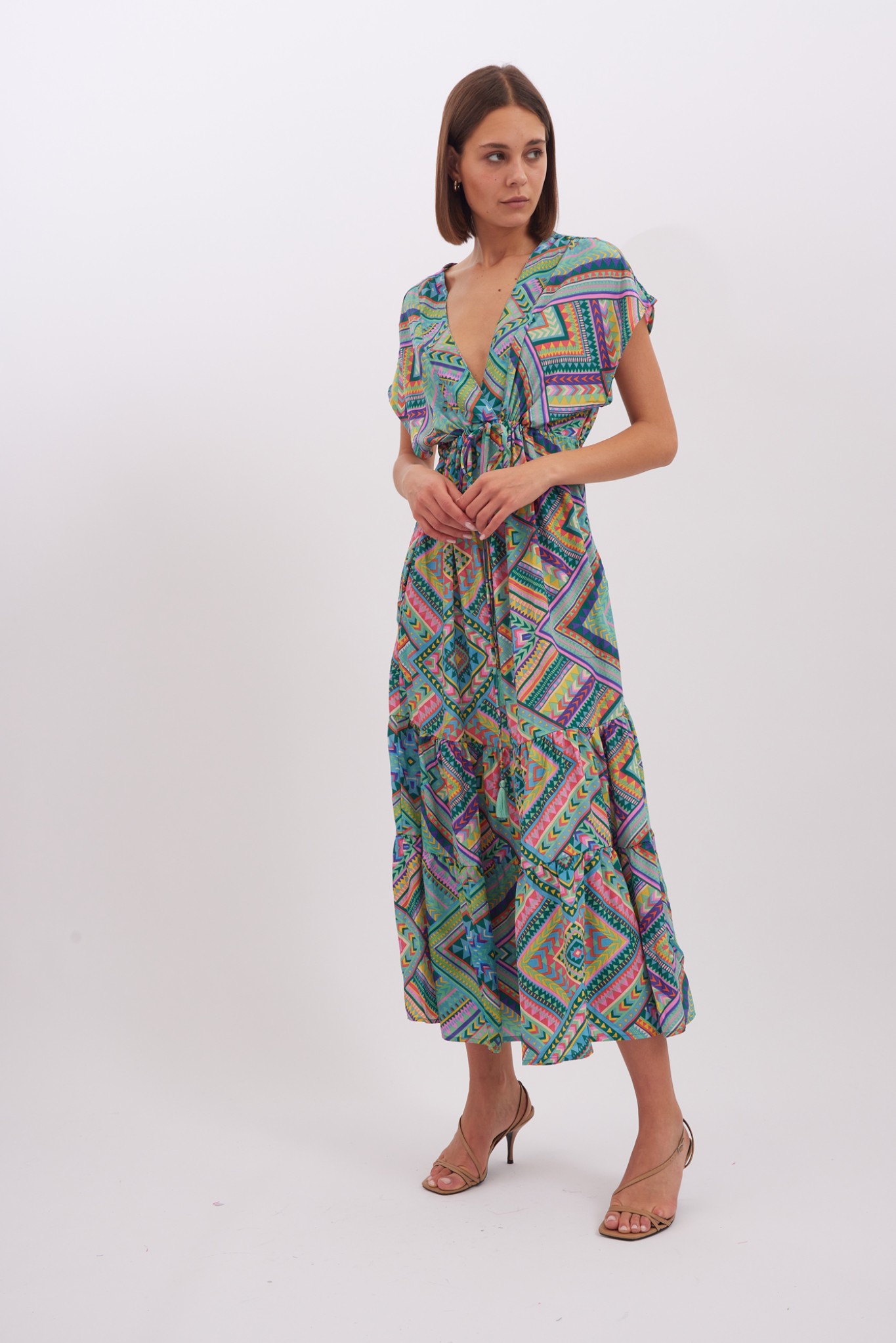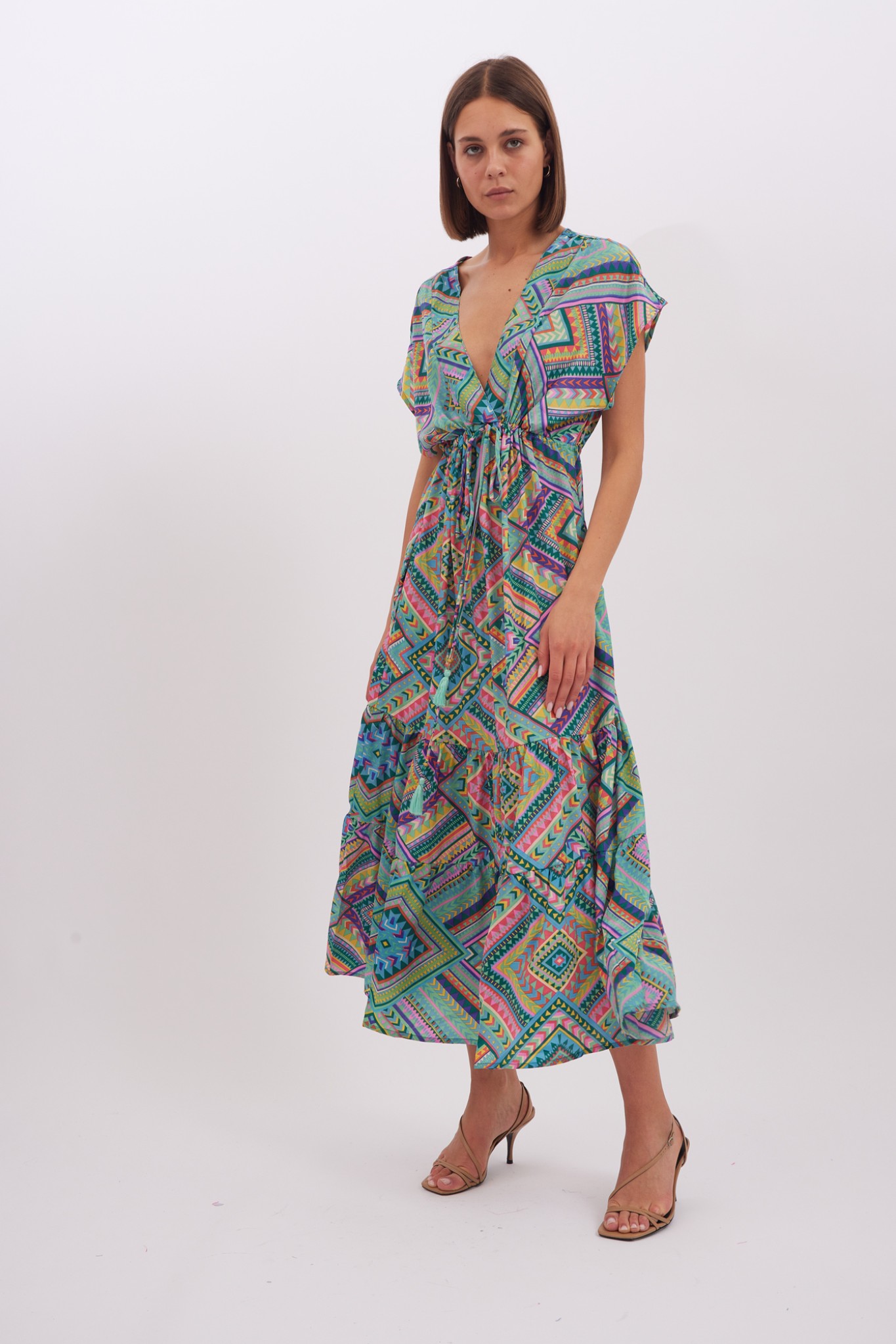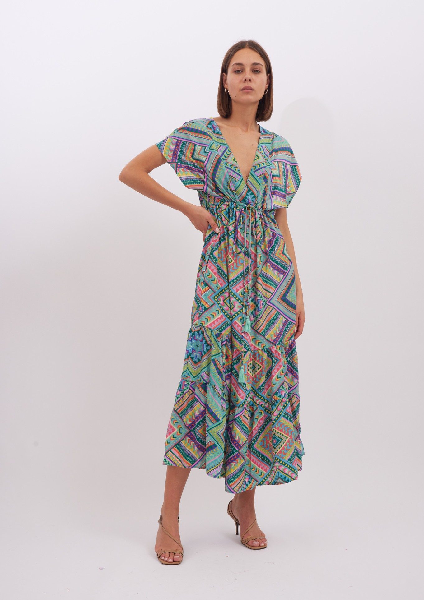 Dress Layla is made from lightweight viscose , it’s patterned with the pretty print and has has a cap sleeves . Romantic and playful dress is designed with a plunging V-neckline. Bring out the vibrant colours by matching your lipstick to one of the shades. The spirited print will capture beautifully in photographs at dinners and outdoor weddings. Wear yours with strappy sandals and a woven tote.