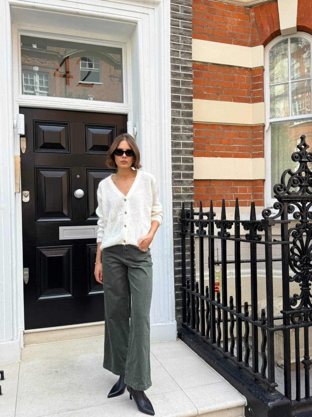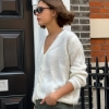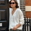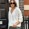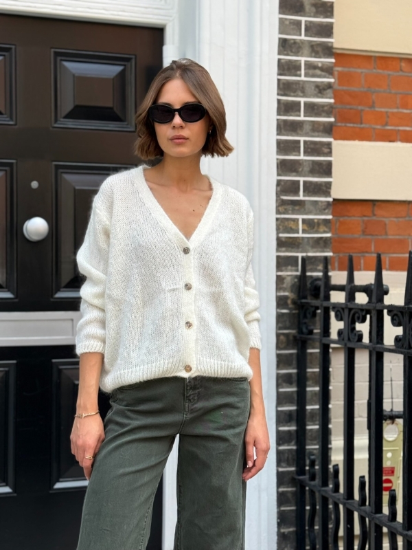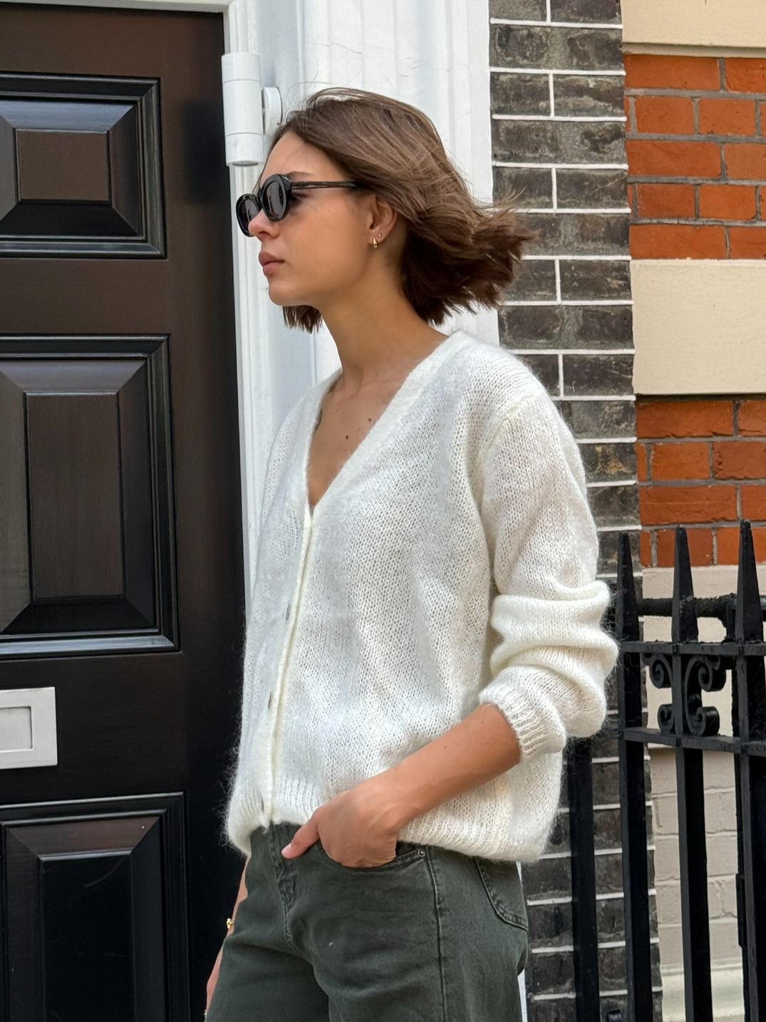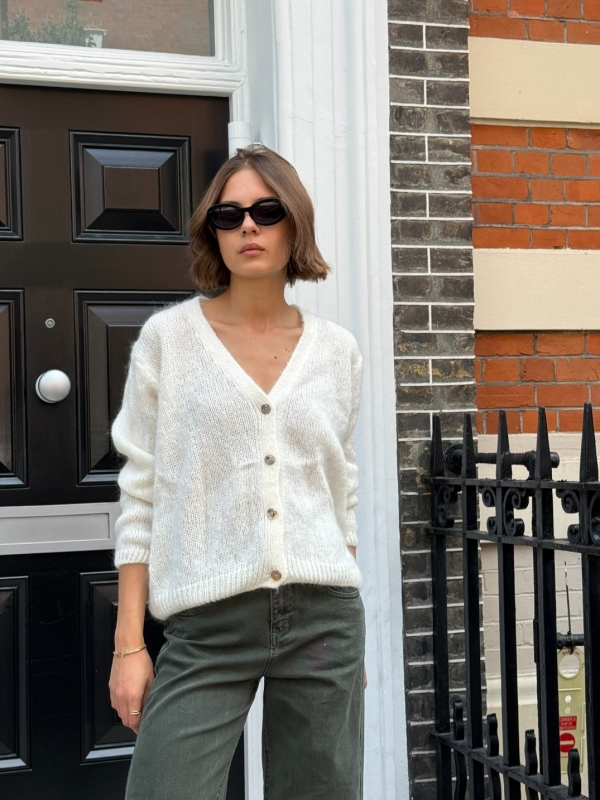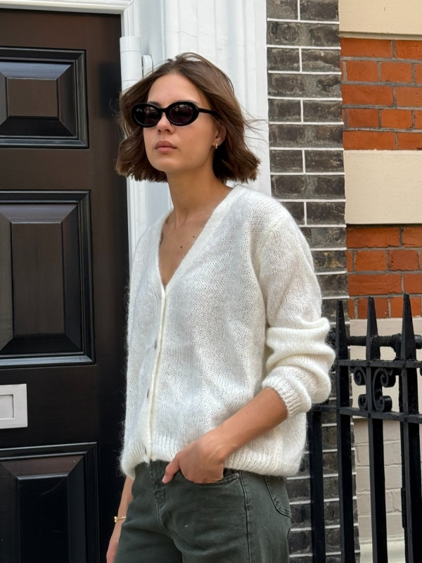Leah cardigan is finely knitted from a pretty shade of a lightweight mohair blend for a soft, fuzzy handle. It’s designed for a slim fit with ribbed trims. Slip it on over a tank or turtleneck and leave it undone at the hem for a laid-back take. It has a slim silhouette that’s perfect for layering. This hue will coordinate well with denim and floral-print dresses alike.