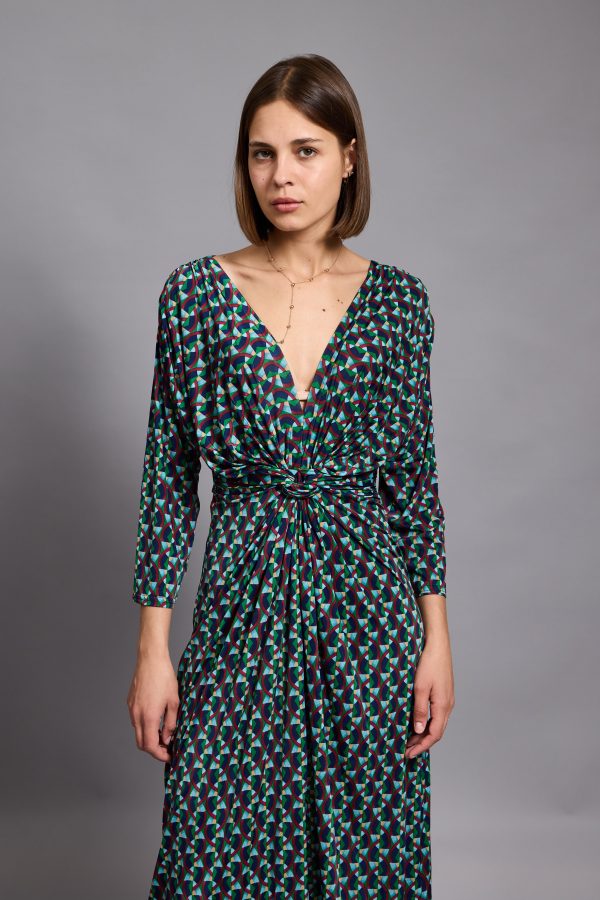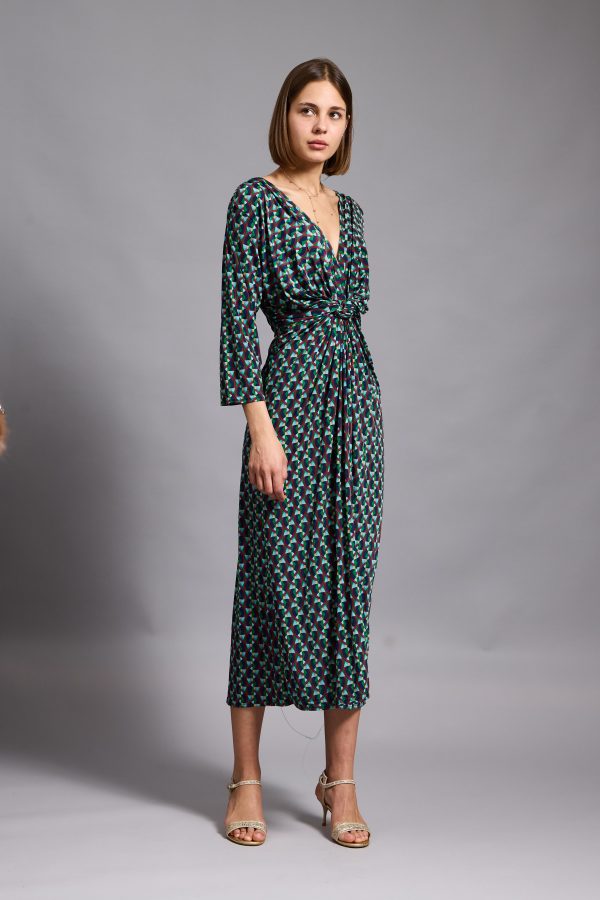 Leona – twist wrap waist midi dress with front split in blue mosaic