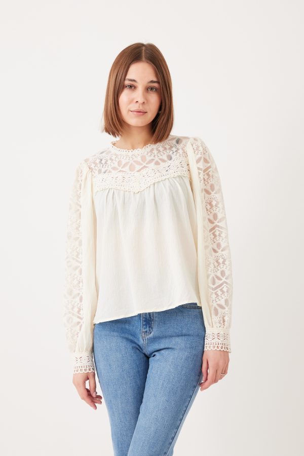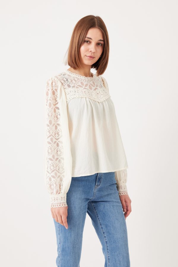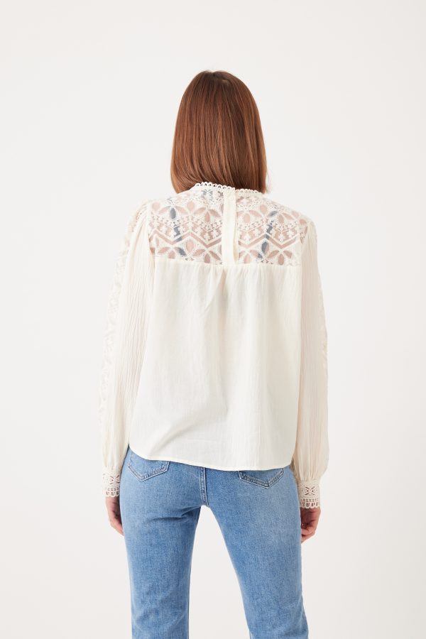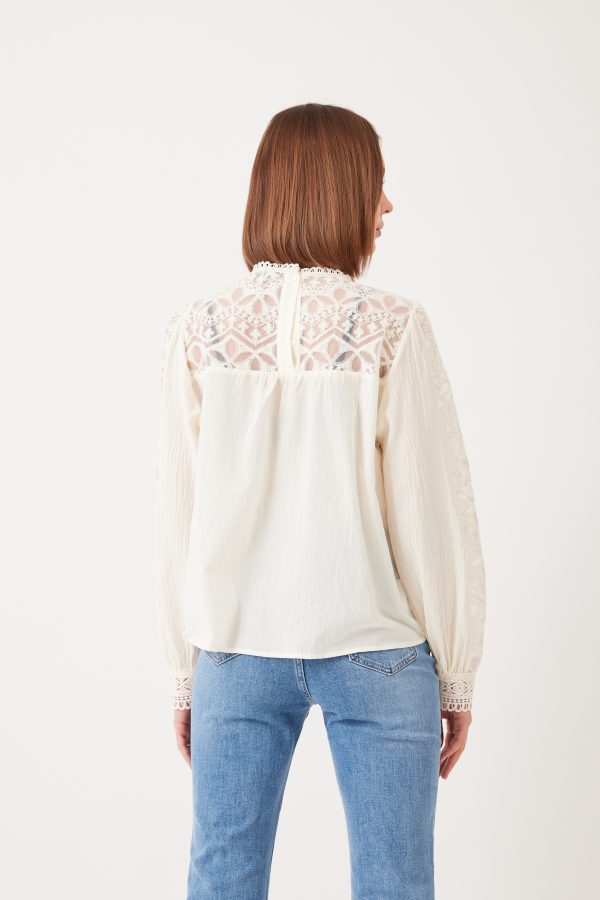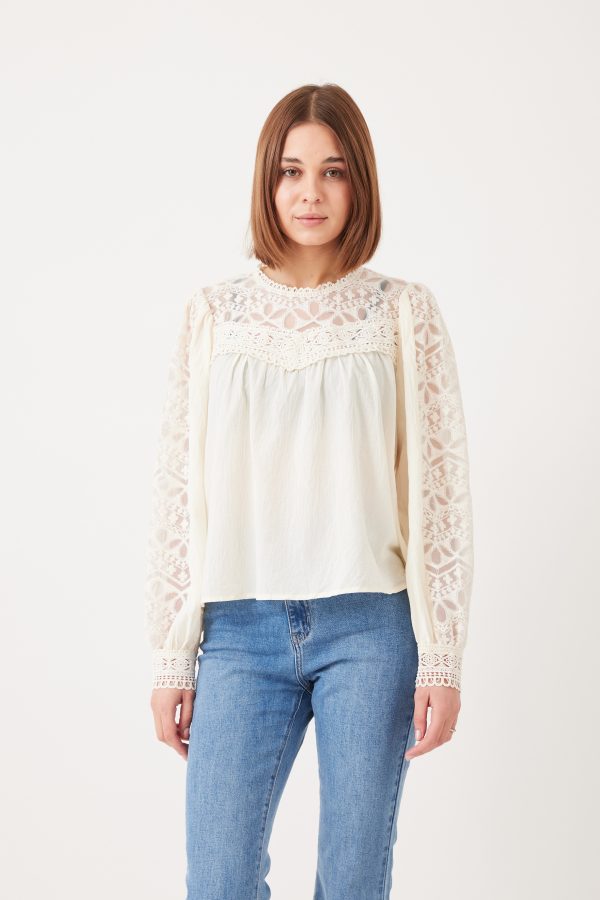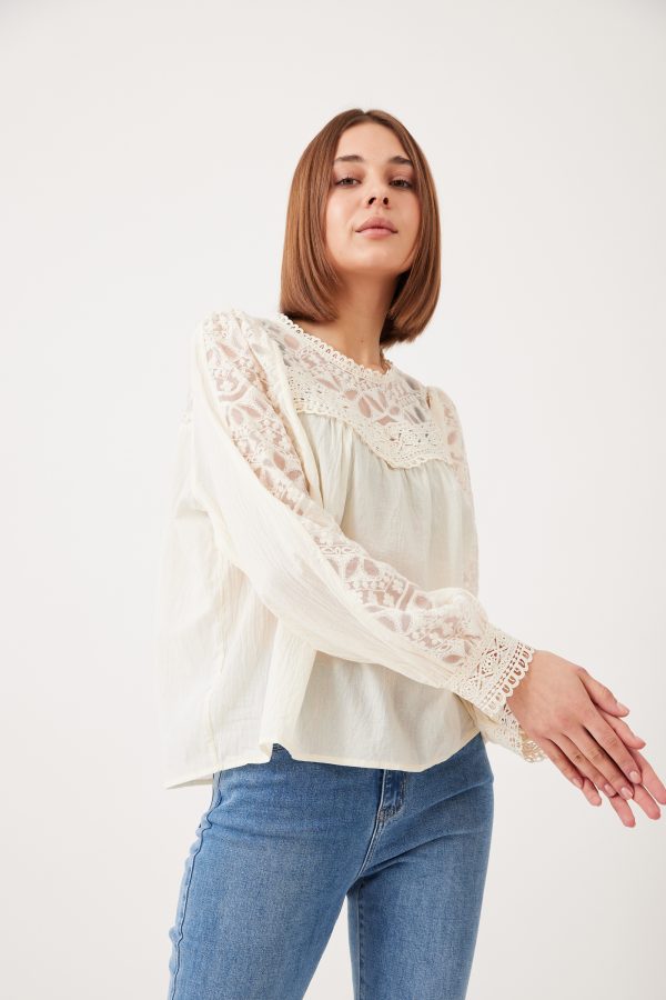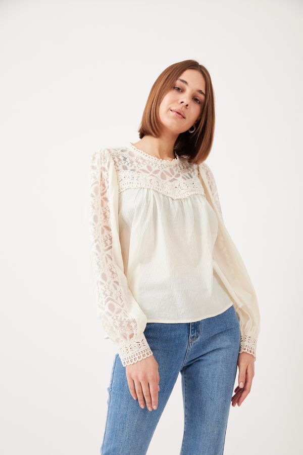 Madison -Lace Trimmed Cotton Blend Blouse In Cream