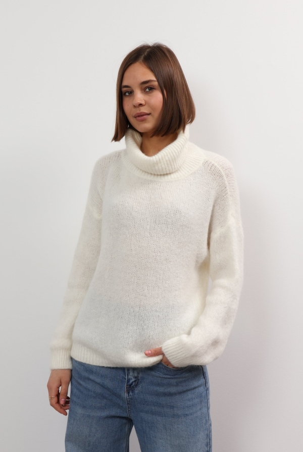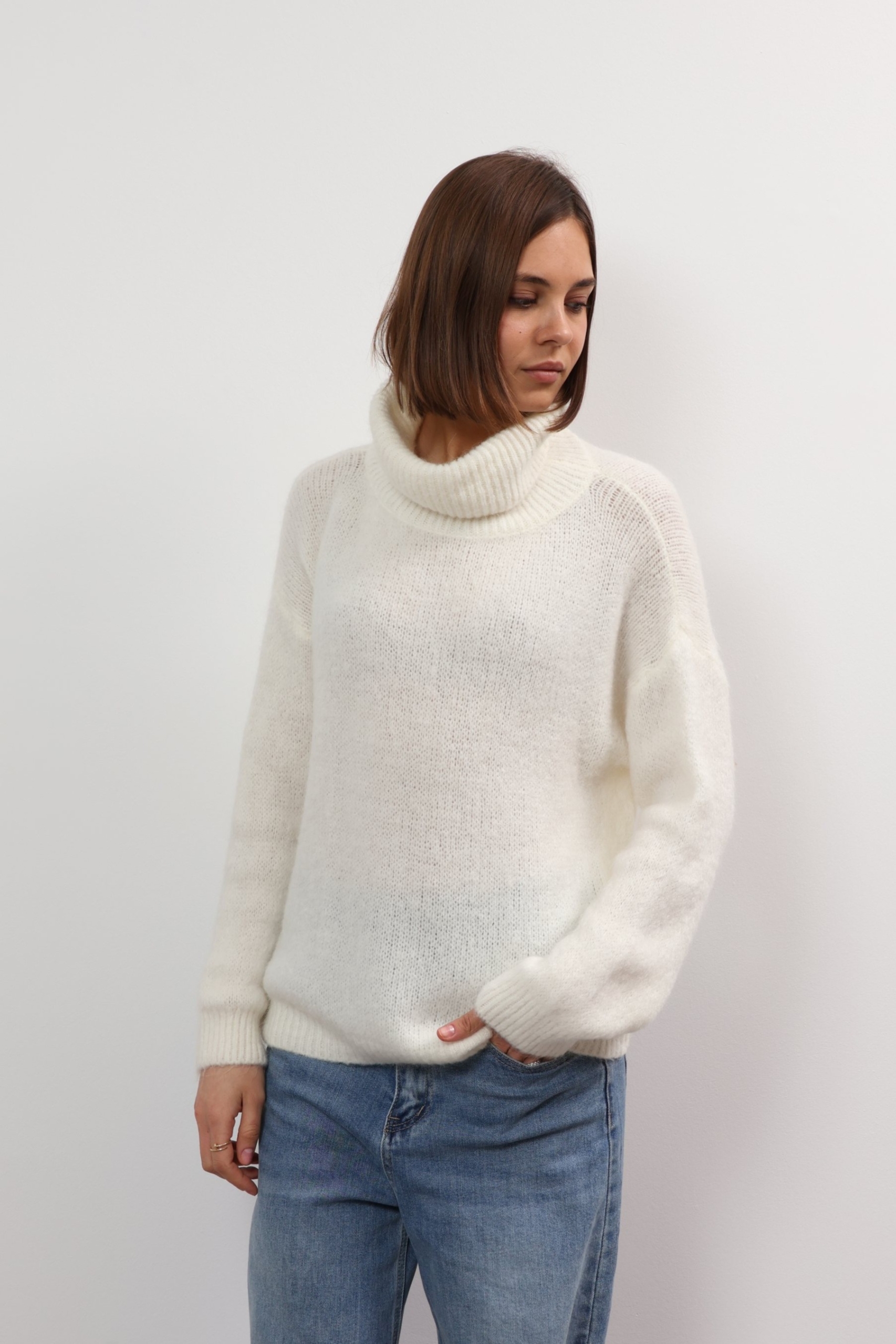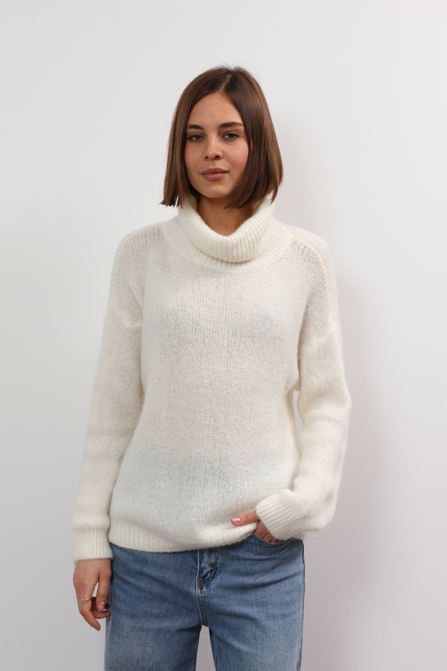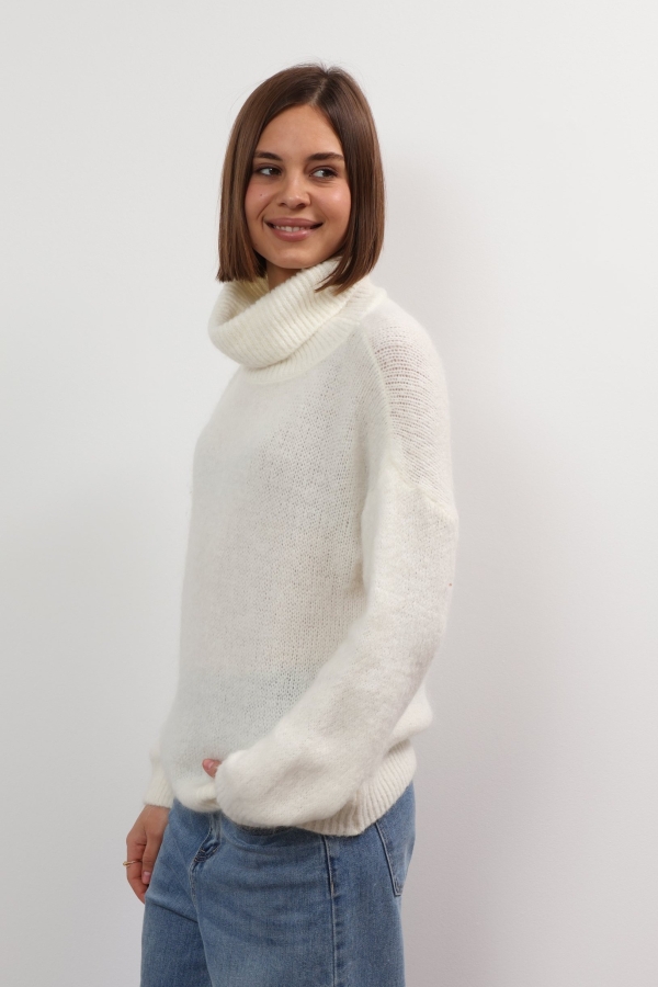 Mandy sweater offers refined comfort. This turtleneck sweater is so versatile and cosy. Spun from soft wool, it has a relaxed fit with a cropped hem and chunky ribbed trims. It’s finely knitted with touches of wool for a really lightweight and breathable handle. The striking hue will instantly freshen up your complexion and complements everything from neutral tones to dark denim. Designed in a classic turtleneck shape, in a relaxed fit enhanced by dropped shoulders . Switch between styling it with boyfriend jeans, slouchy tailoring and tulle skirts.